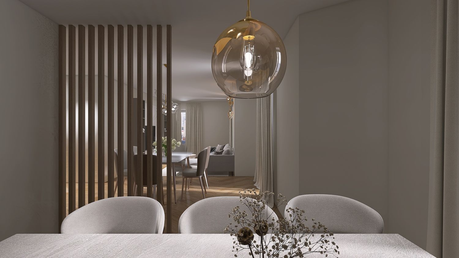 La richiesta di mantenere la cucina separata ma comunque in comunicazione con il soggiorno è stata risolta attraverso una parete lamellare in legno: una soluzione che consente di separare visivamente i due ambienti senza interrompere la continuità degli spazi e la convivialità della zona giorno.