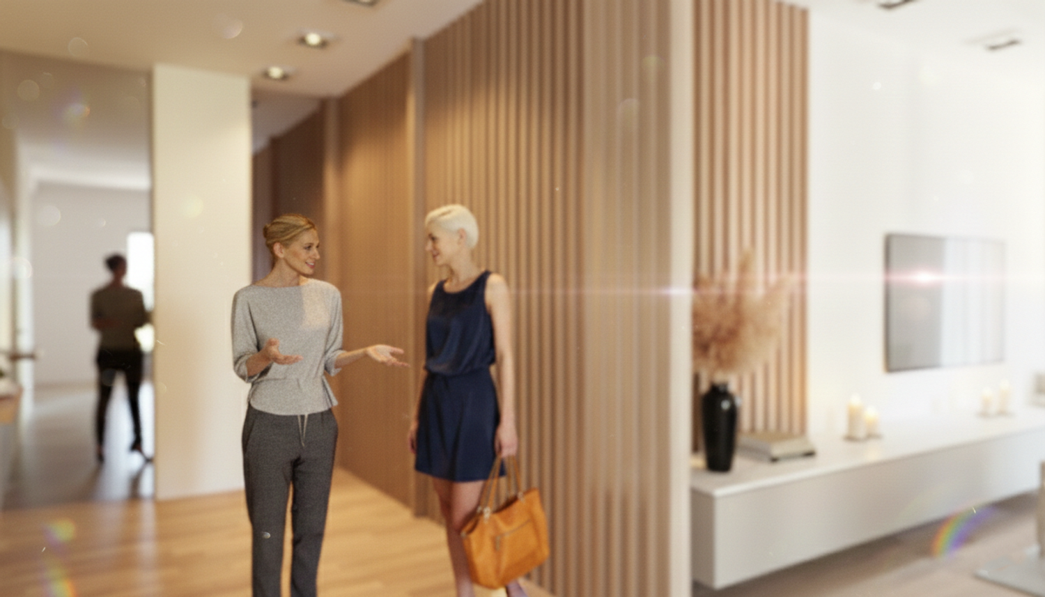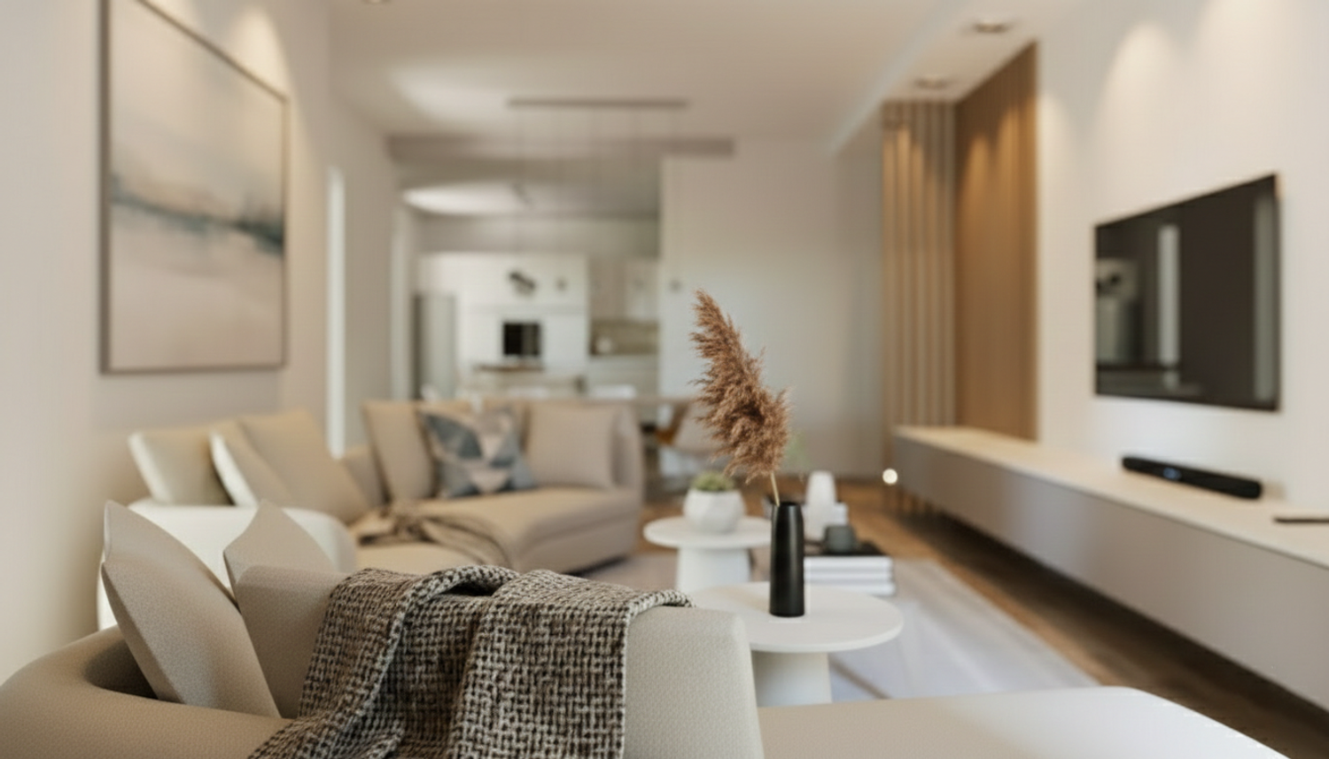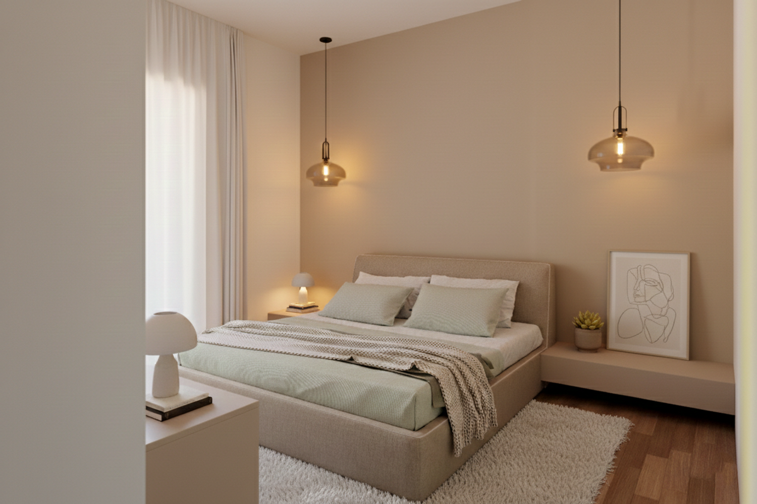 La palette cromatica gioca sulle sfumature del beige, del tortora e del bianco caldo, esaltate dalla texture naturale del legno dogato e dai micro-dettagli dei tessuti. Il risultato è una residenza dall'atmosfera serena, dove il design moderno incontra il comfort tattile dei materiali nobili.