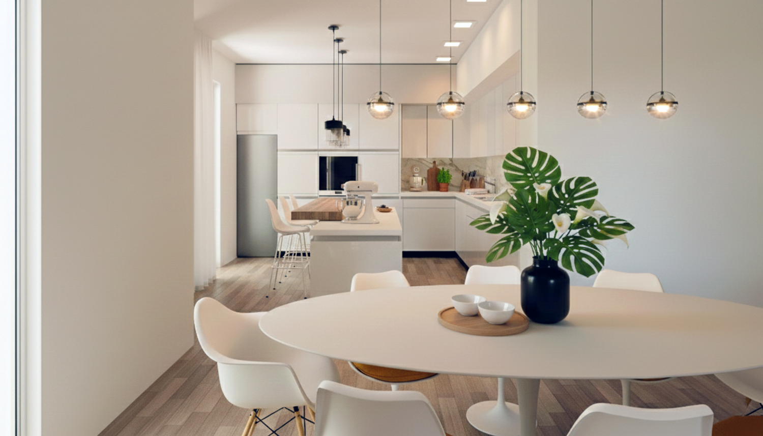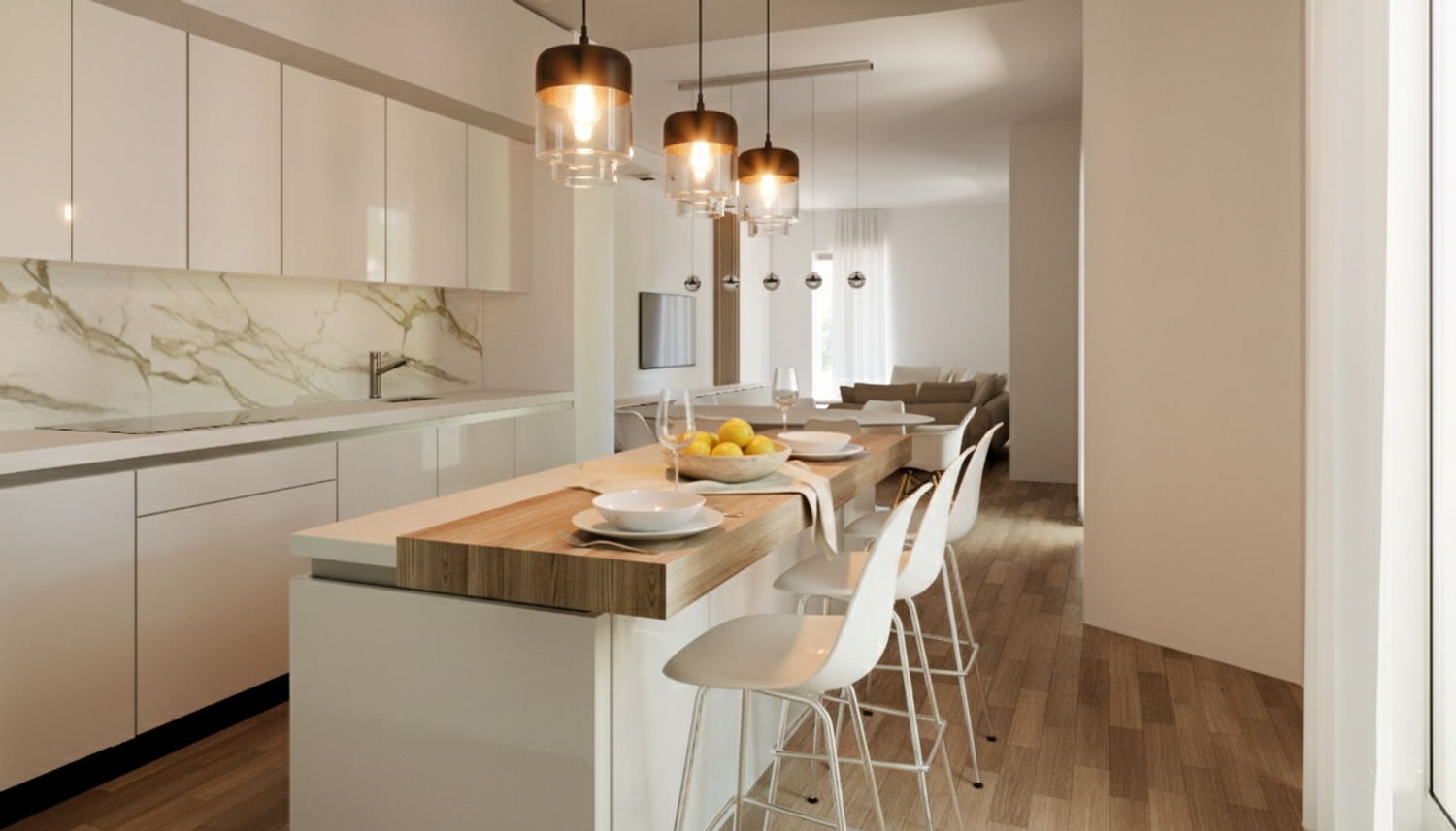Cucina Minimalista: Caratterizzata da mobili bianchi laccati e un piano di lavoro in marmo venato, la cucina si sviluppa intorno a un'ampia penisola operativa con un bancone snack in legno massello a contrasto, perfetto per la convivialità.