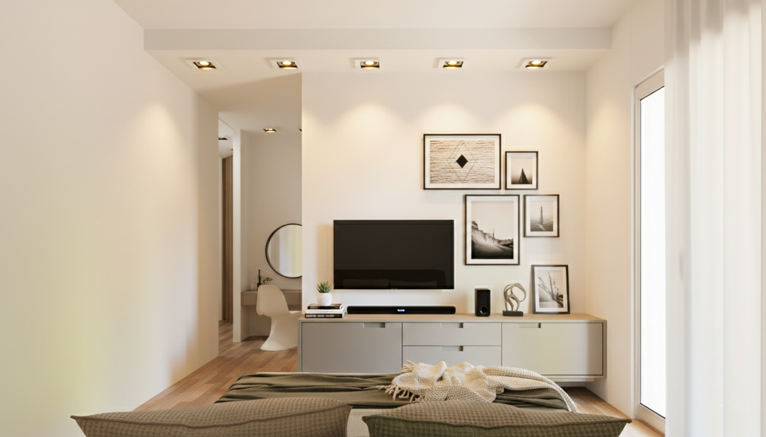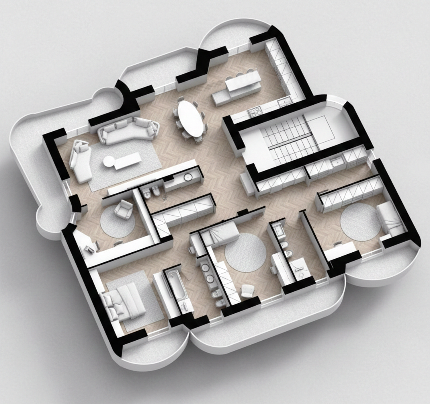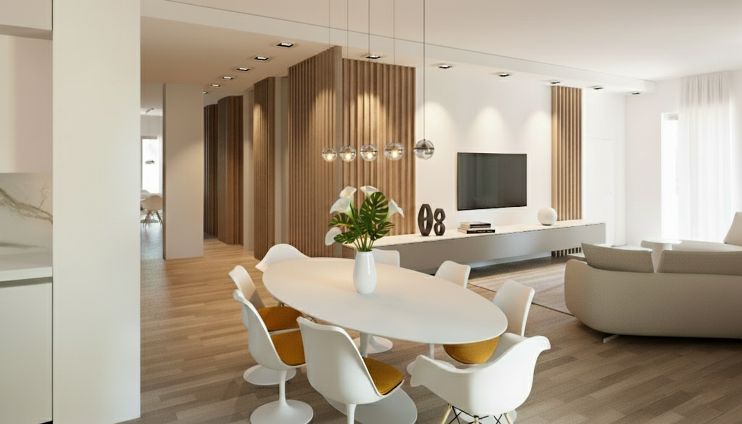 Il progetto propone una completa reinterpretazione degli spazi interni, puntando su un layout fluido e una sofisticata coerenza estetica basata su toni neutri, legno naturale e un'illuminazione scenografica.