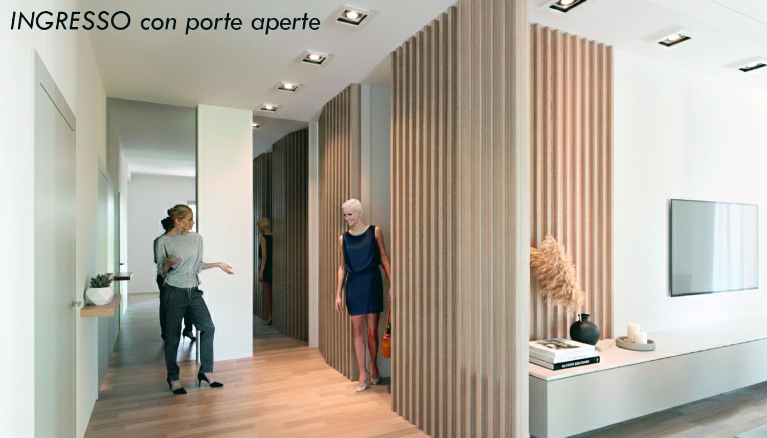 Vero fulcro del progetto è la parete in legno dogato a tutta altezza che riveste l'ingresso. Questa soluzione di "mimetismo architettonico" non solo conferisce calore e ritmo verticale allo spazio, ma integra perfettamente le porte a filo muro che conducono al bagno degli ospiti e alla suite padronale, mantenendo la pulizia visiva del living.