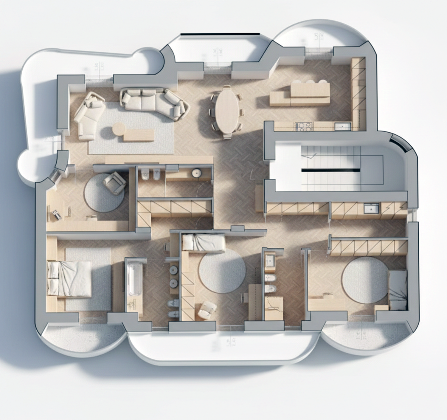 Soggiorno e Pranzo: Arredati con forme organiche e divani curvi, gli spazi sono definiti da un elegante pavimento in parquet posato a correre che unifica l'intera zona.