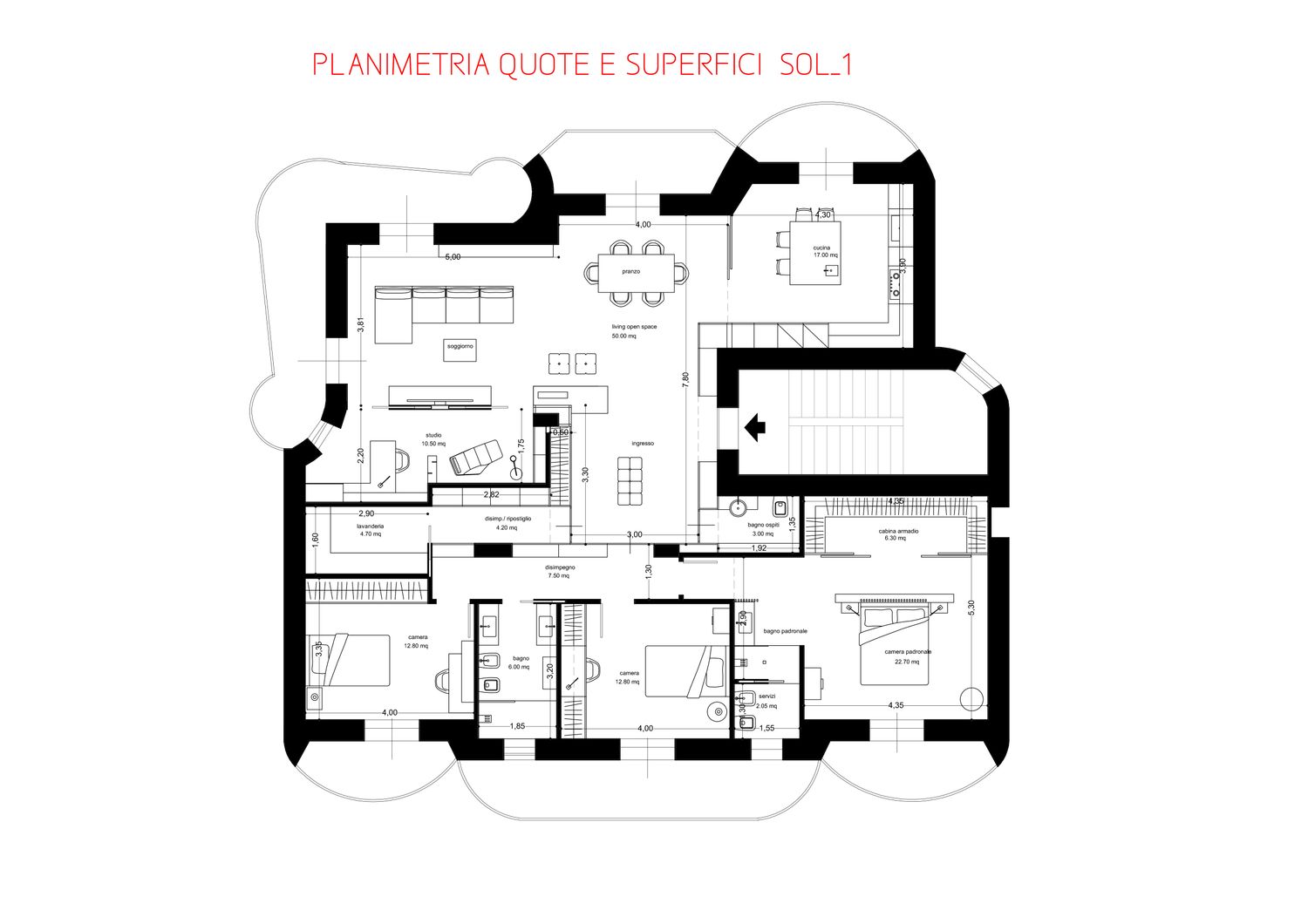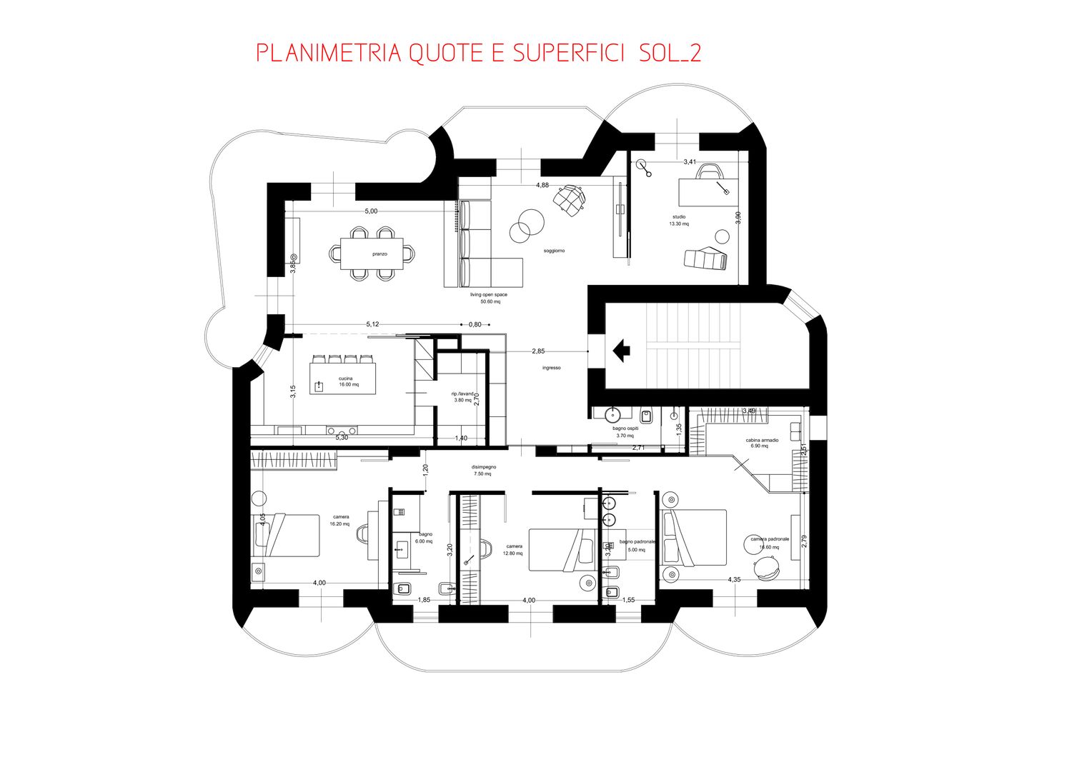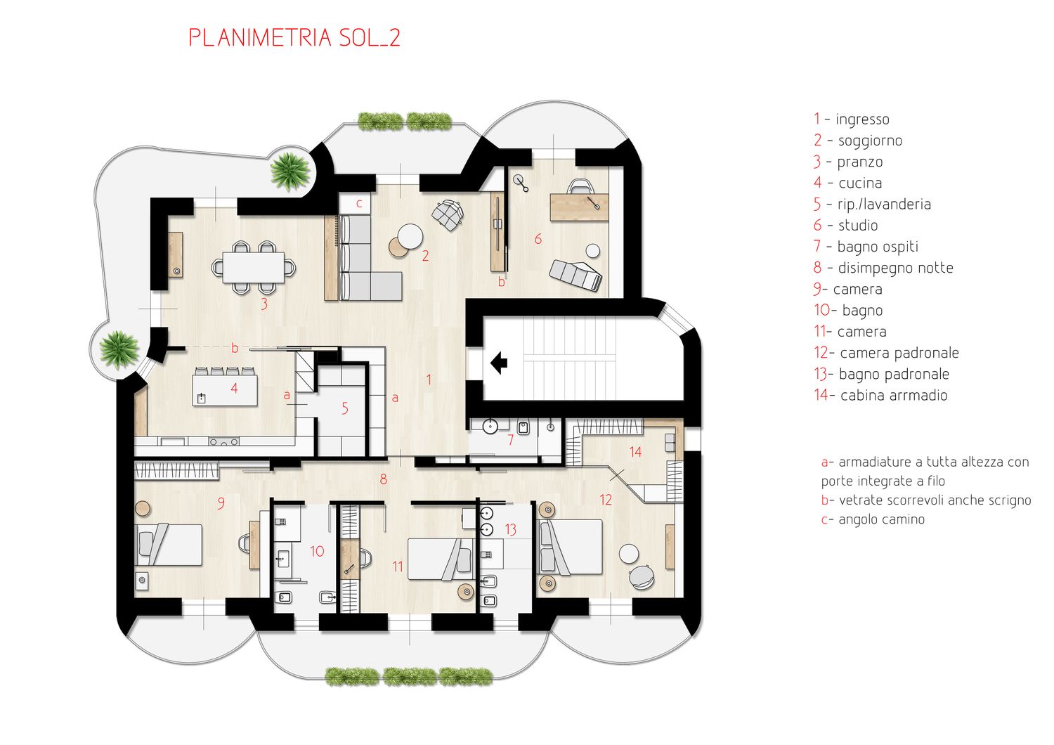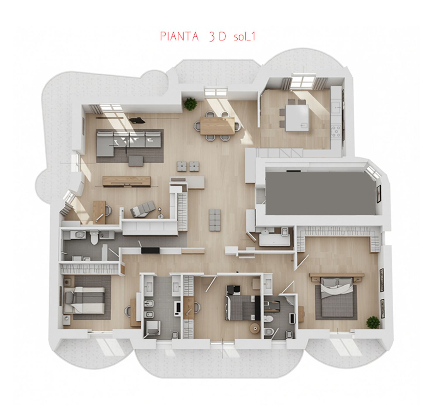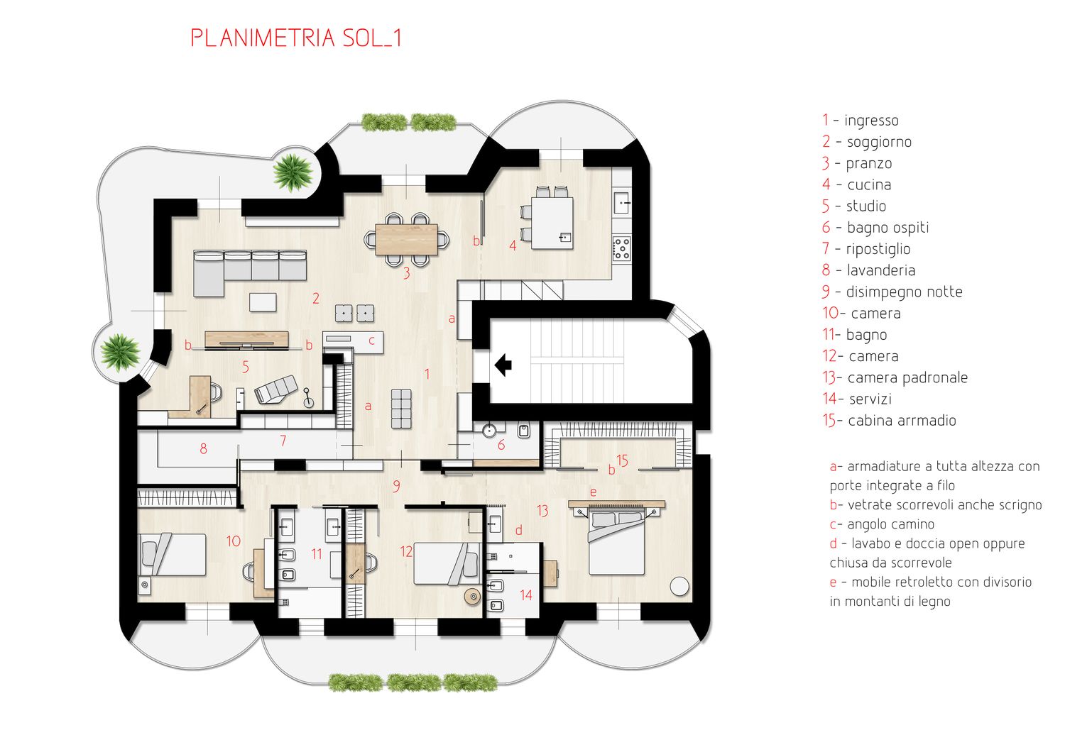 La soluzione proposta nasce da un’analisi iniziale per capire in relazione alle vostre esigenze come ottimizzare gli spazi e quindi realizzare un ambiente armonioso nel rispetto del comfort e dell’estetica ricercata. Entrando si percepisce una grande zona giorno molto luminosa e che a partire da una zona filtro di ingresso con armadio filo muro per i vestiti, ci apre la visuale sul grande living con divano, zona TV e sala pranzo per poi avere leggermente defilata la cucina che eventualmente può essere chiusa tramite pannellature scorrevoli attualmente in vetro semitrasparente. Trovano poi spazio il nuovo studio e il nuovo bagno giorno. La zona notte viene poi modificata riducendo il disimpegno notte e ottimizzando lo spazio delle camere con due doppie, una padronale con bagno e cabina armadio dedicati e un ulteriore bagno a servizio delle altre due camere. Particolare attenzione è stata rivolta anche all’ingresso che ora si compone di una grande zona con armadiature a scomparsa lungo l’intero perimetro e un divanetto centrale; tale ambiente viene inserito per avere maggiori armadiature che ben si integrano al contesto e con porte integrate che danno accesso alla zona notte e al bagno di servizio.