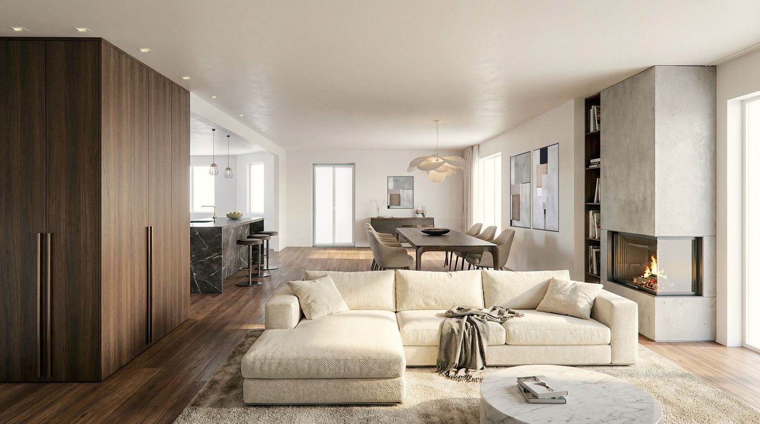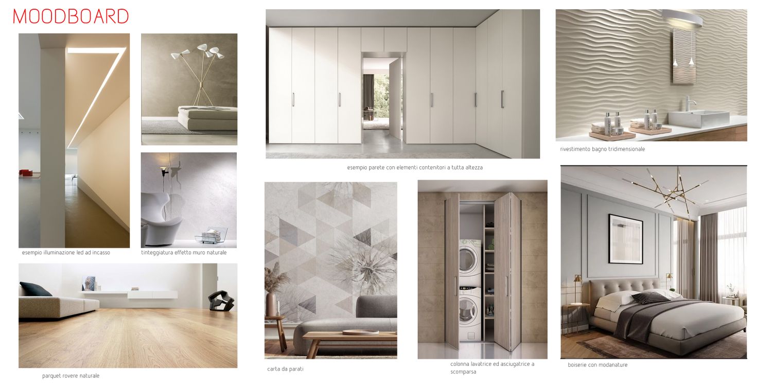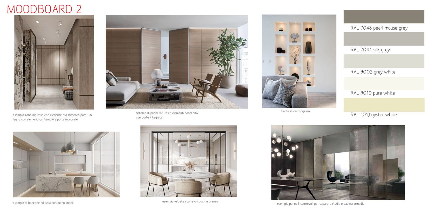 The proposed solution stems from an initial analysis to understand your needs and how to optimize space, creating a harmonious environment that respects comfort and a refined aesthetic. Upon entering, you'll discover a large, bright living area. Starting from an entrance area with a built-in wardrobe, it opens onto the large living room with sofa, TV area, and dining area. The kitchen is slightly set back, but can be closed off with sliding panels, currently made of semi-transparent glass. This space also includes a new study and a new bathroom. The sleeping area has been modified by reducing the hallway and optimizing the space in the bedrooms, with two double bedrooms, a master bedroom with a private bathroom and walk-in closet, and an additional bathroom serving the other two bedrooms. Particular attention was also paid to the entrance, which now features a large area with concealed wardrobes along the entire perimeter and a central sofa. This space is designed to accommodate more storage that blends seamlessly into the context, and with integrated doors that provide access to the sleeping area and guest bathroom.