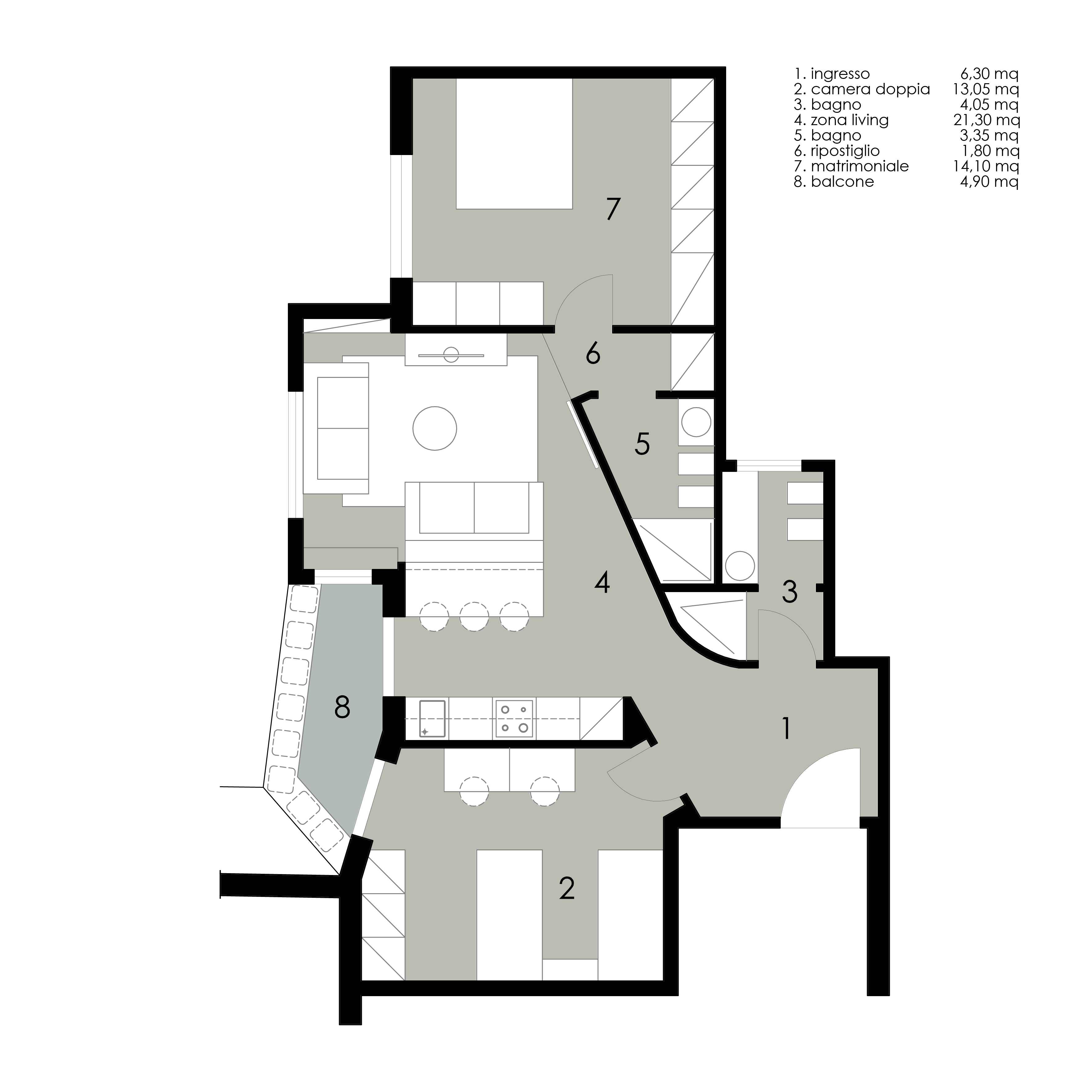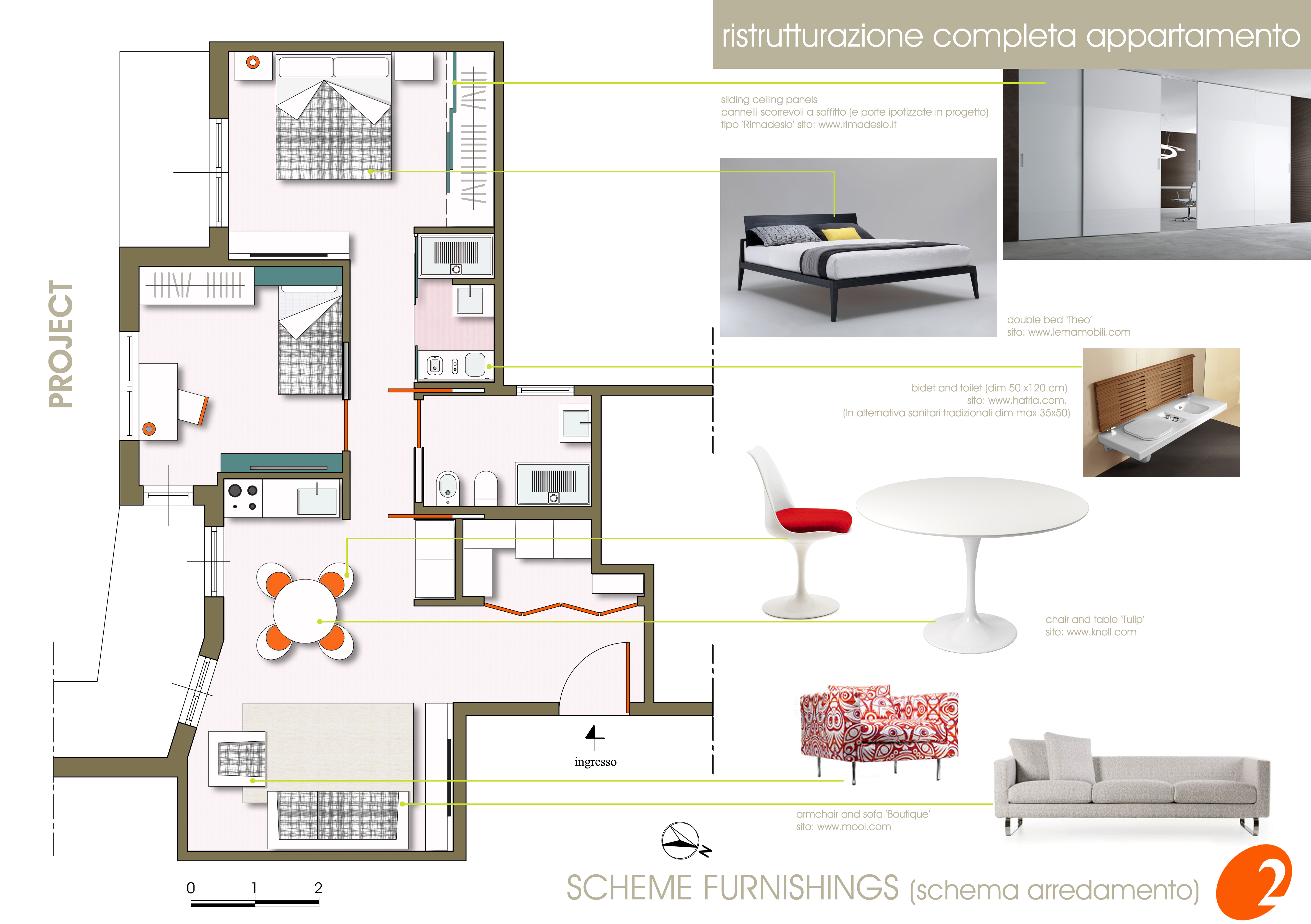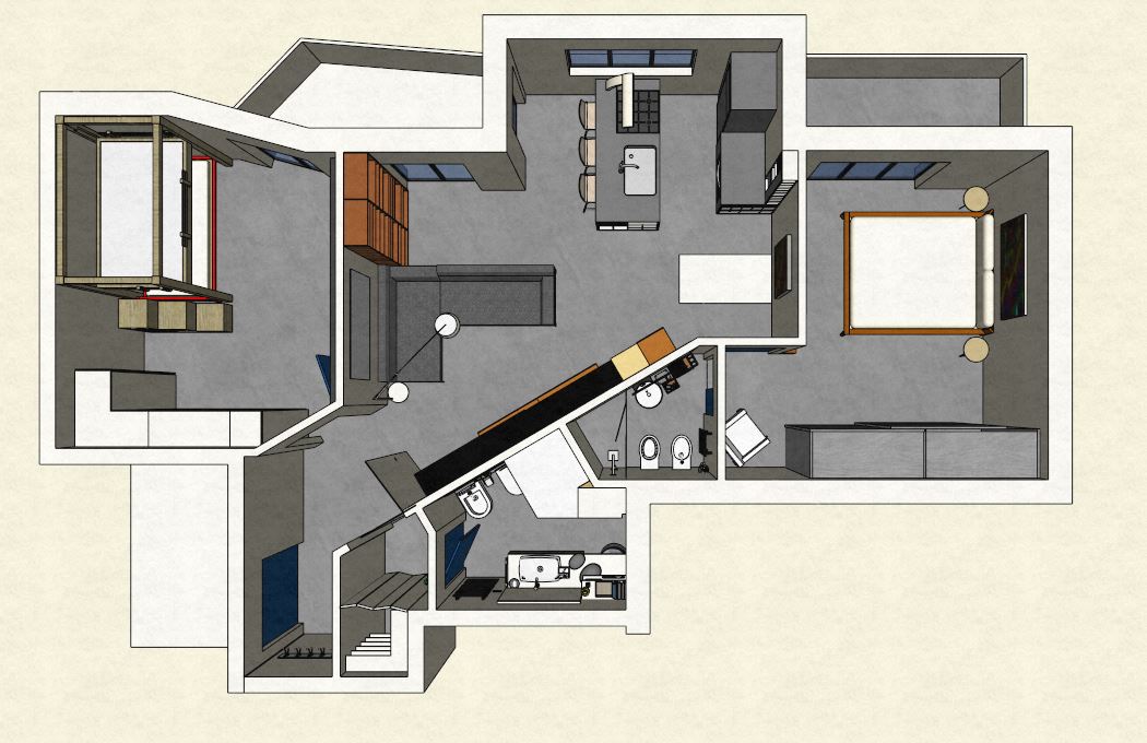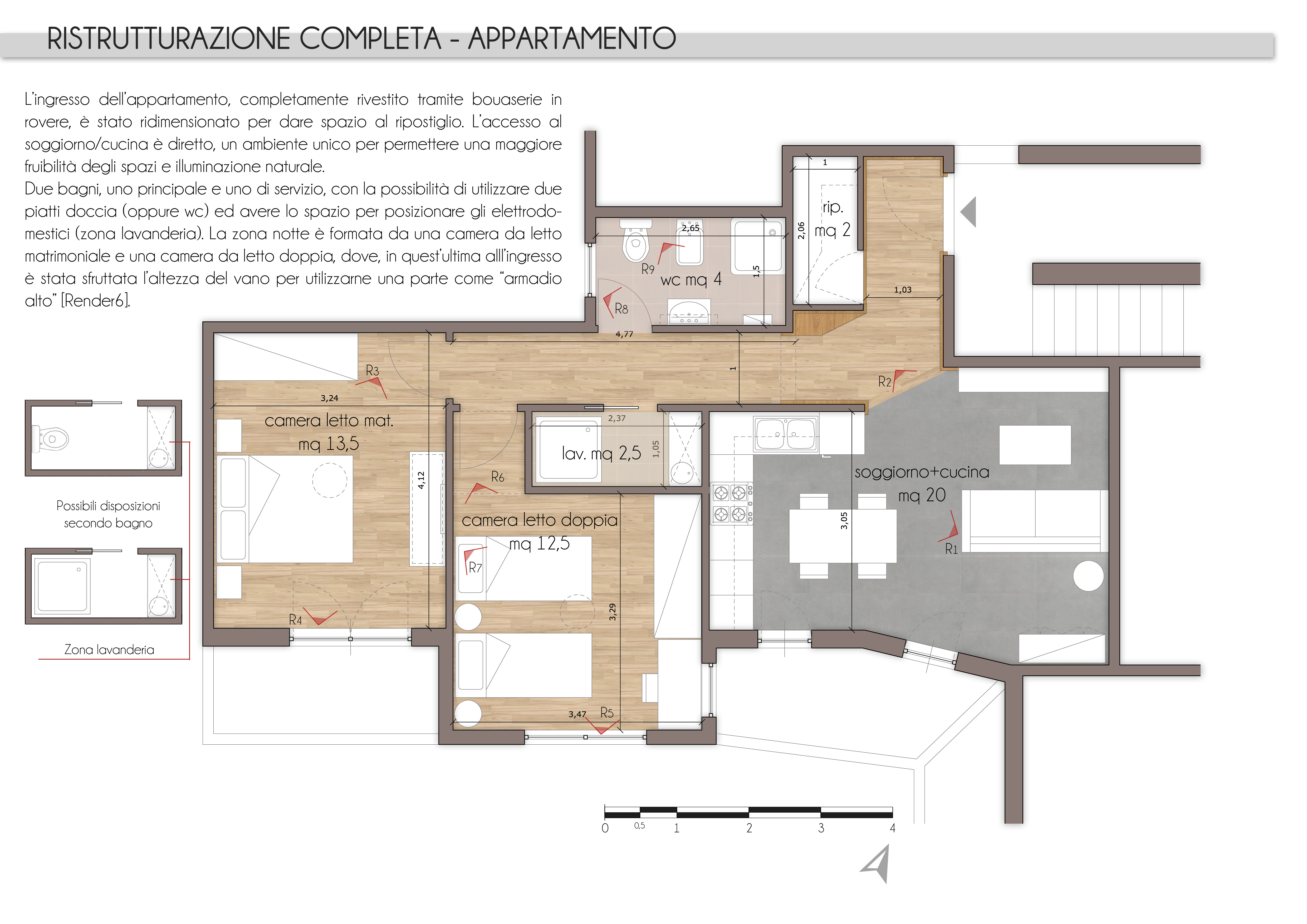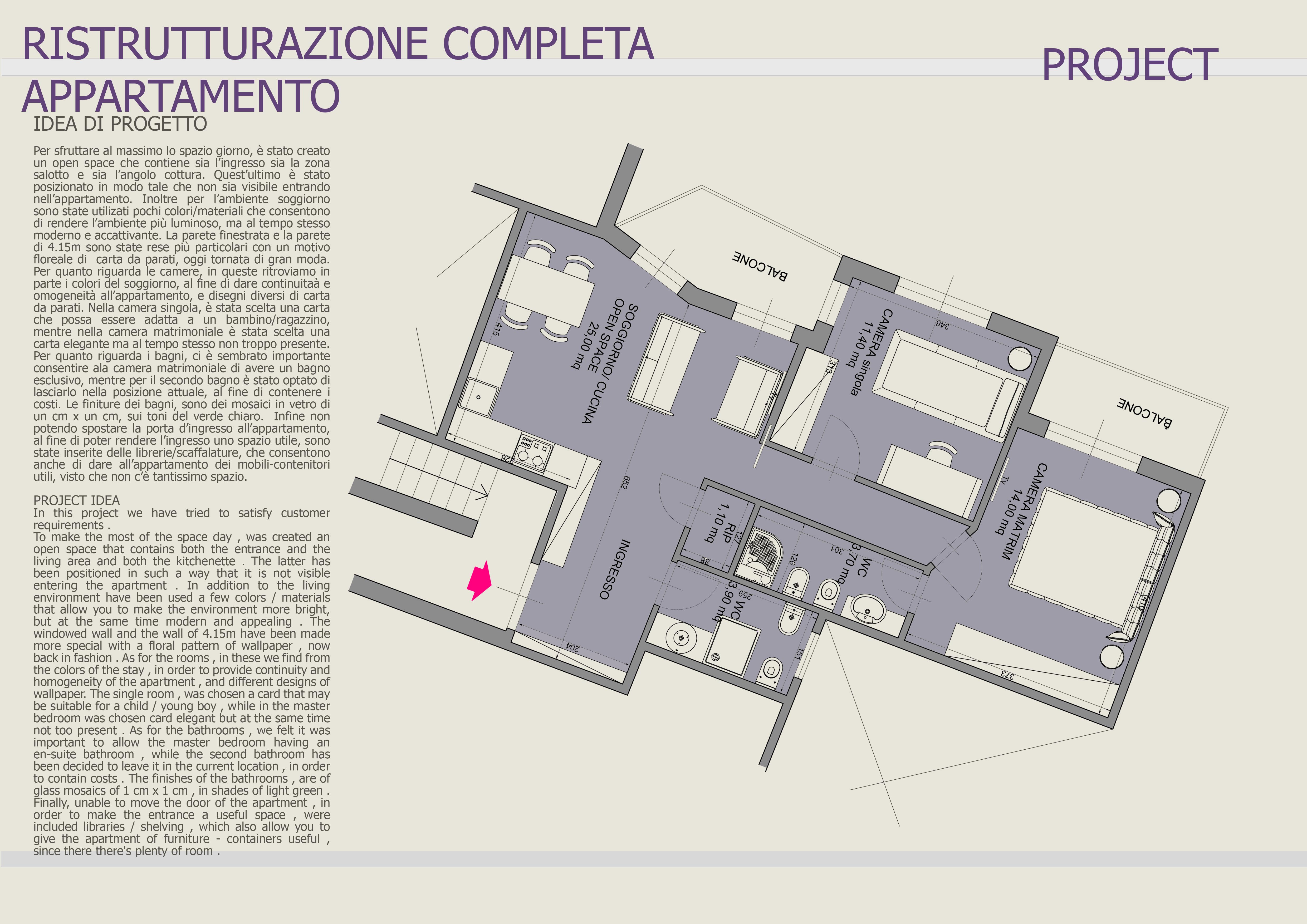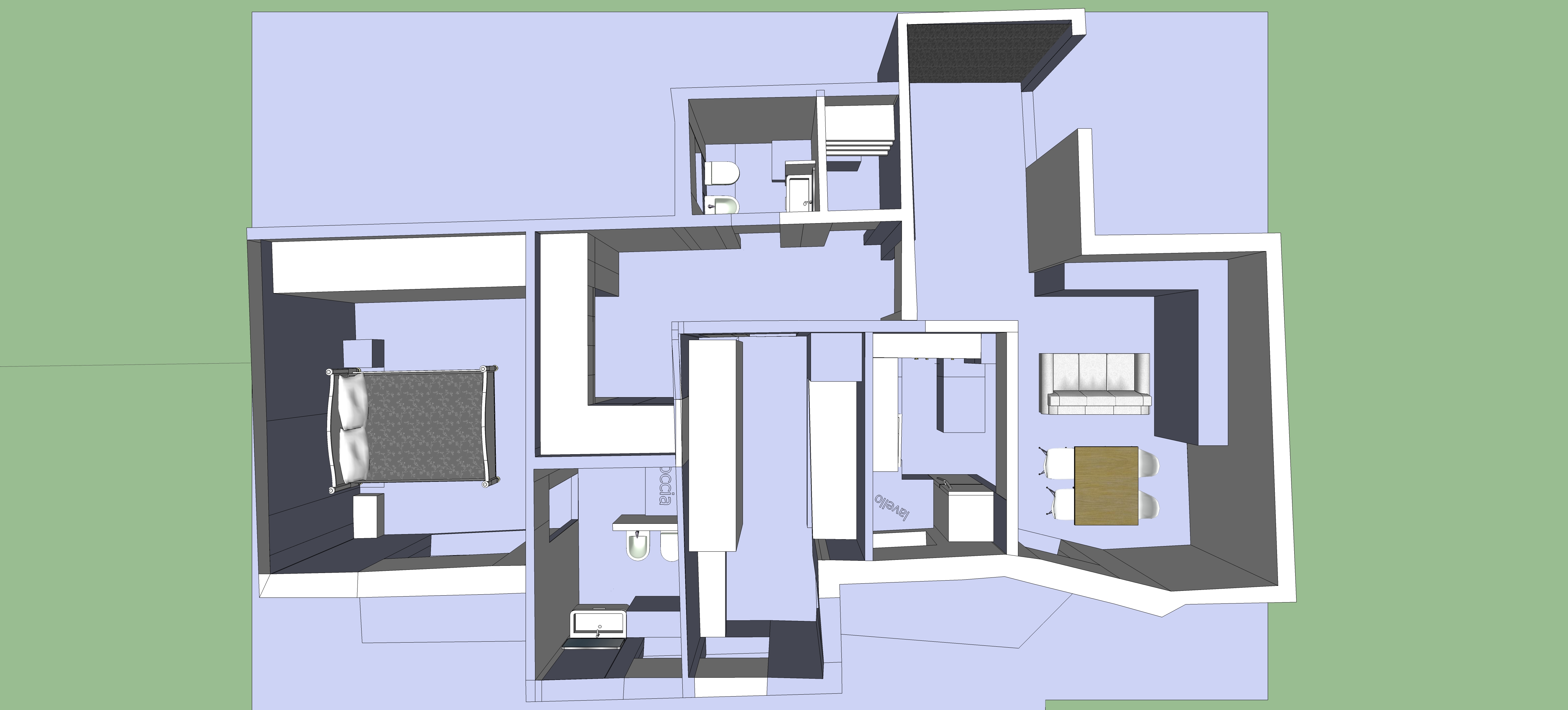 Questo appartamento dovrà diventare cosi: soggiorno con angolo cottura , 2 camere da letto, 2 bagni, piccolo ripostiglio. La parete più lunga del living room è lunga 4,15 metri.