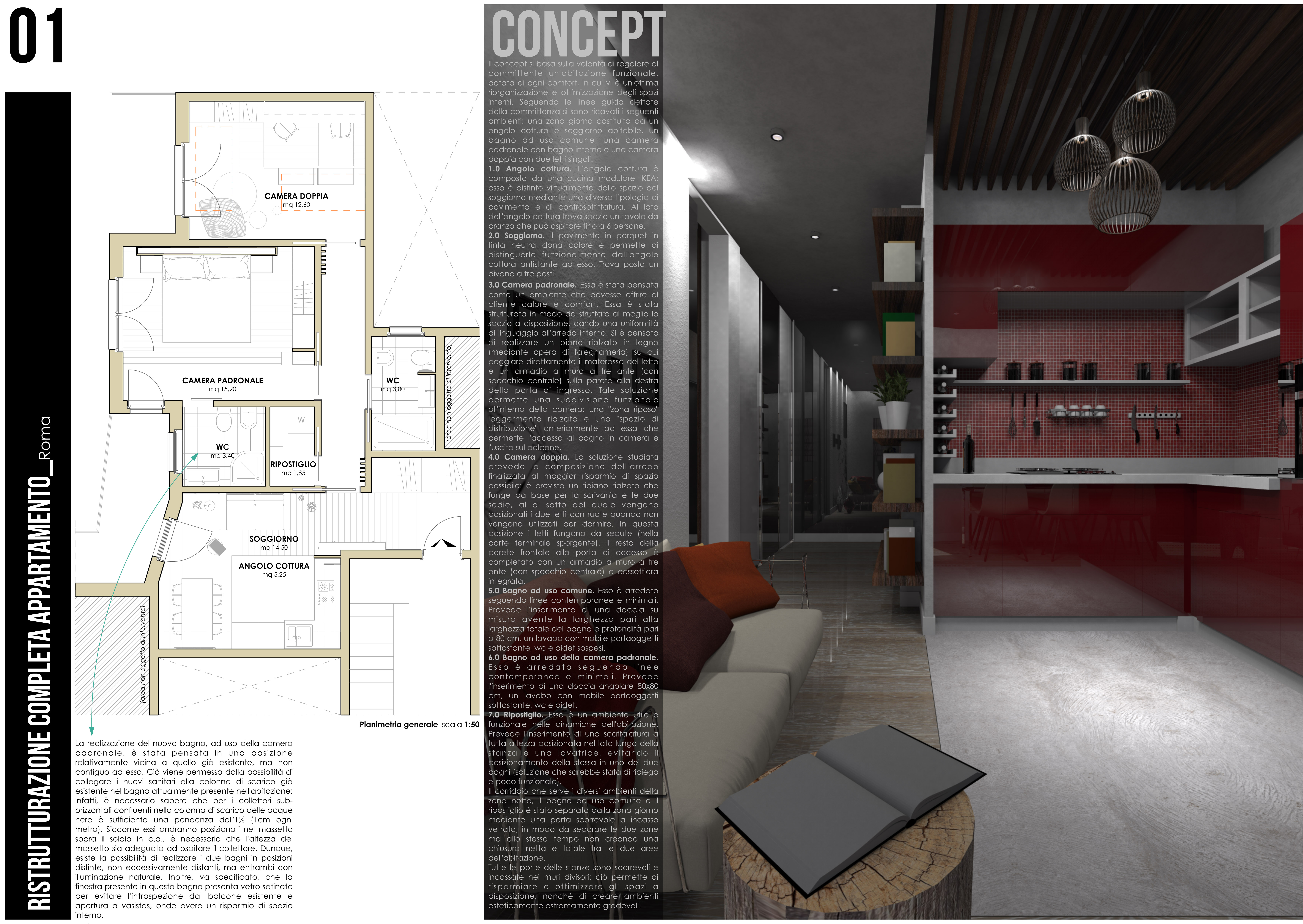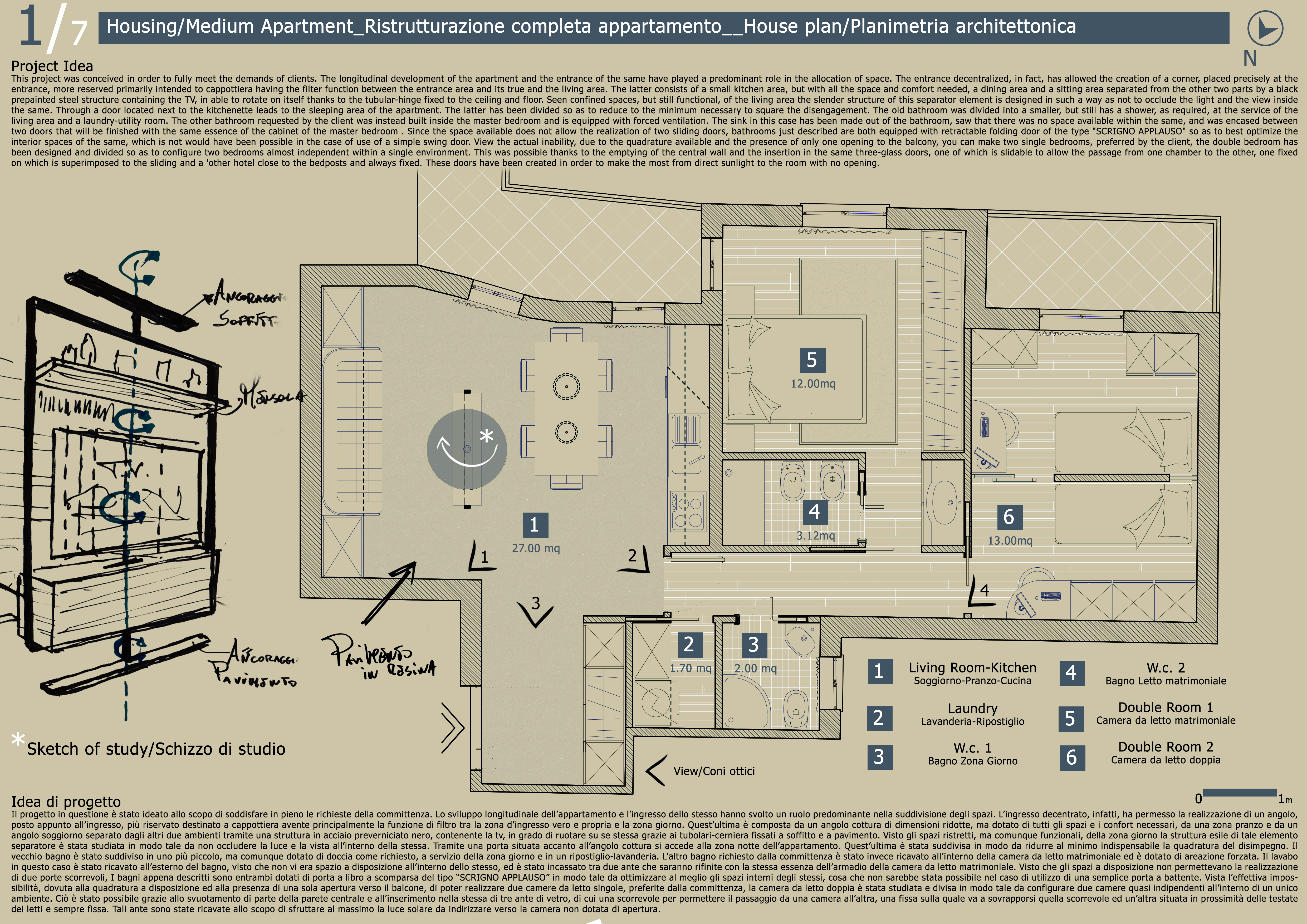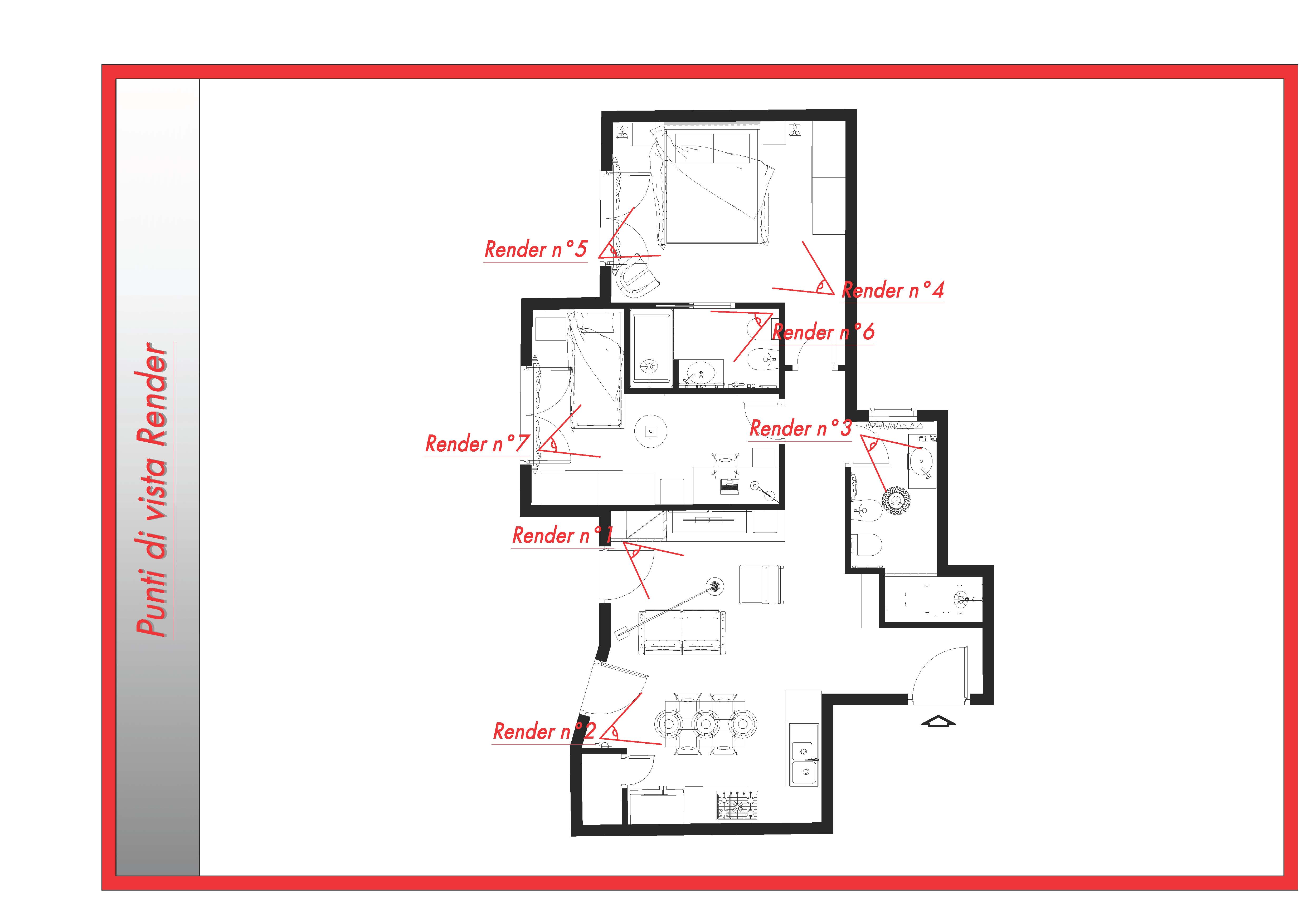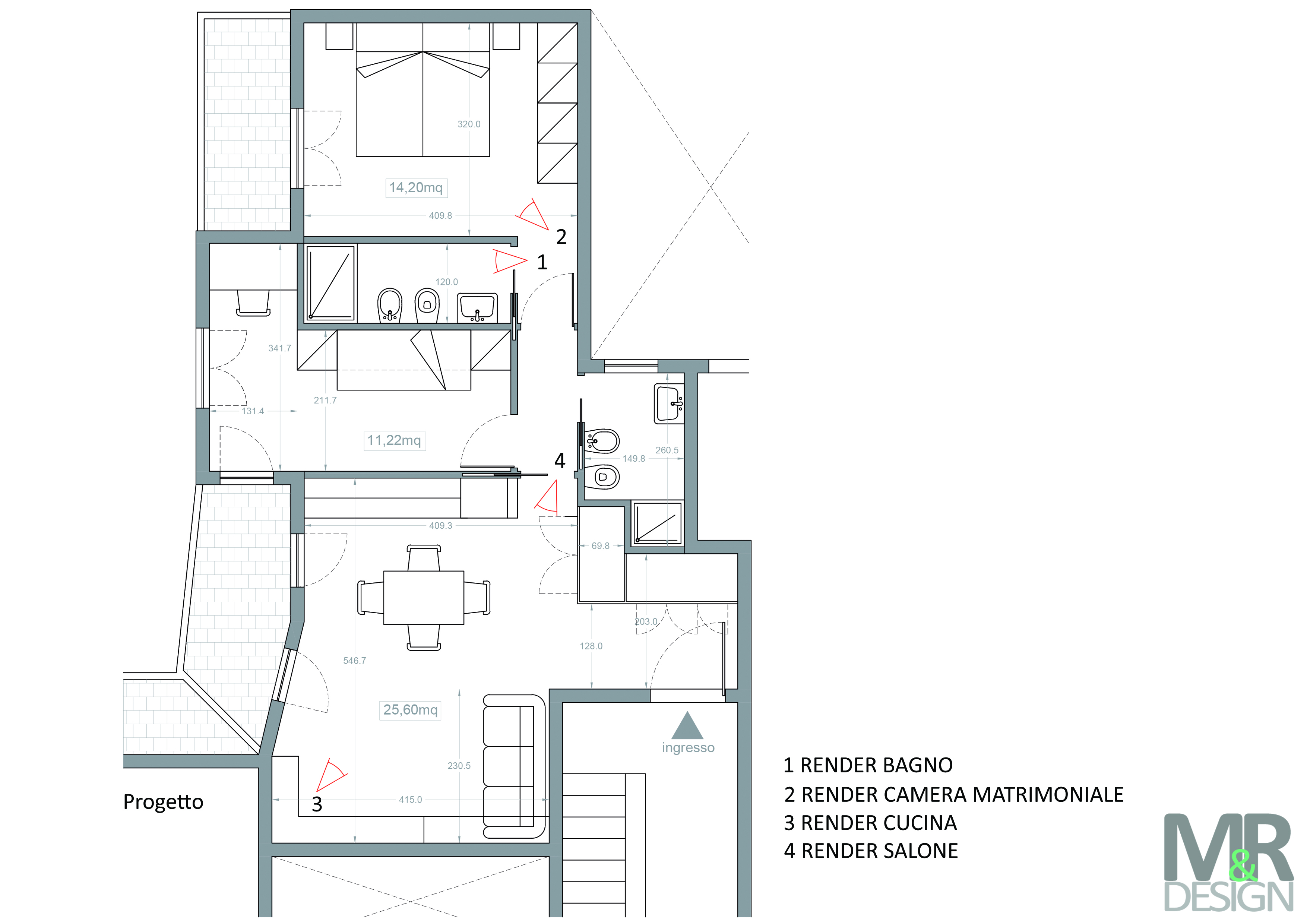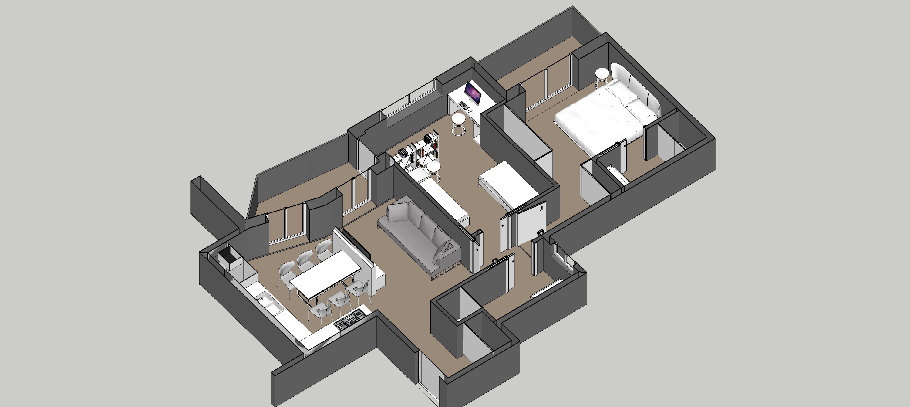 Questo appartamento dovrà diventare cosi: soggiorno con angolo cottura , 2 camere da letto, 2 bagni, piccolo ripostiglio. La parete più lunga del living room è lunga 4,15 metri.