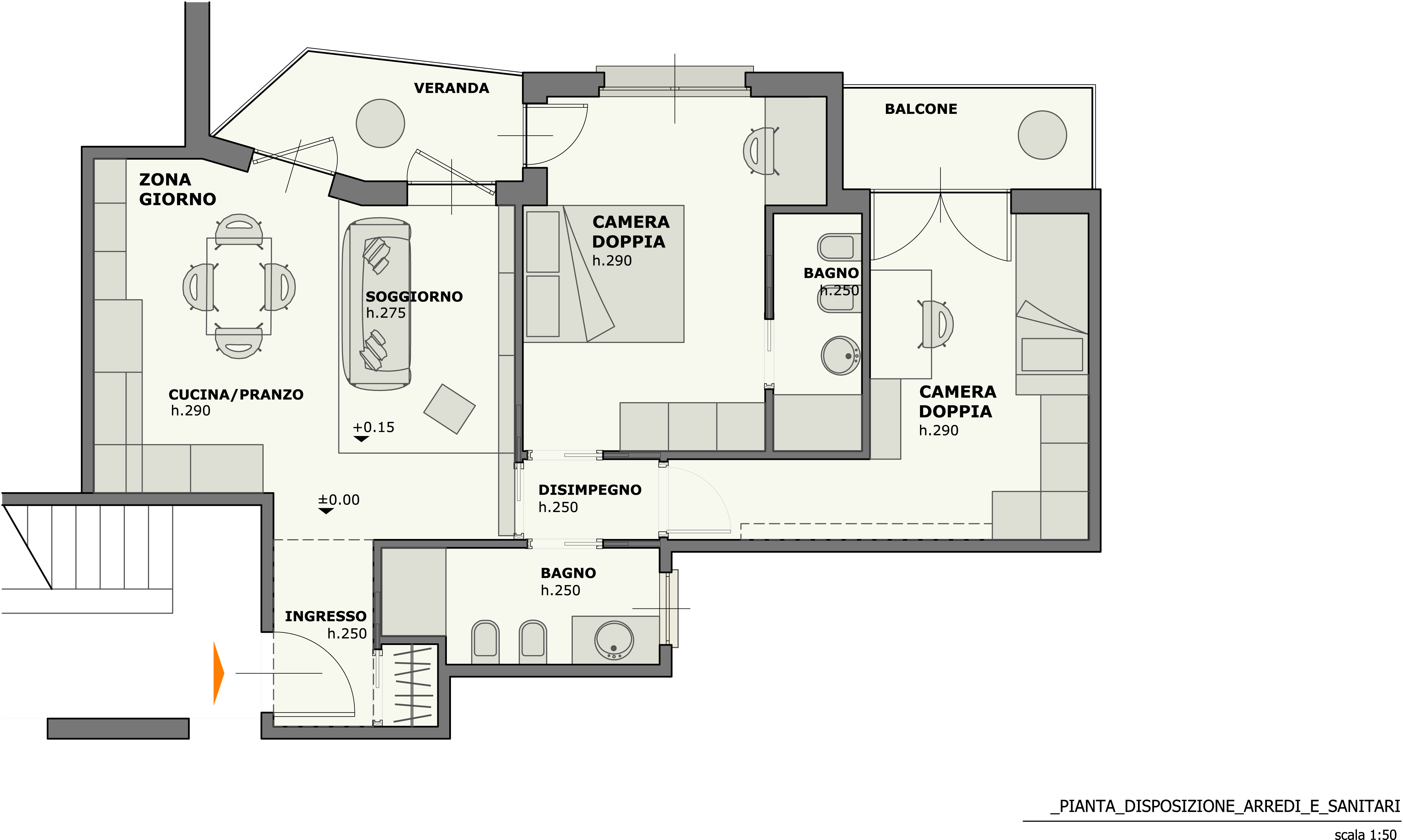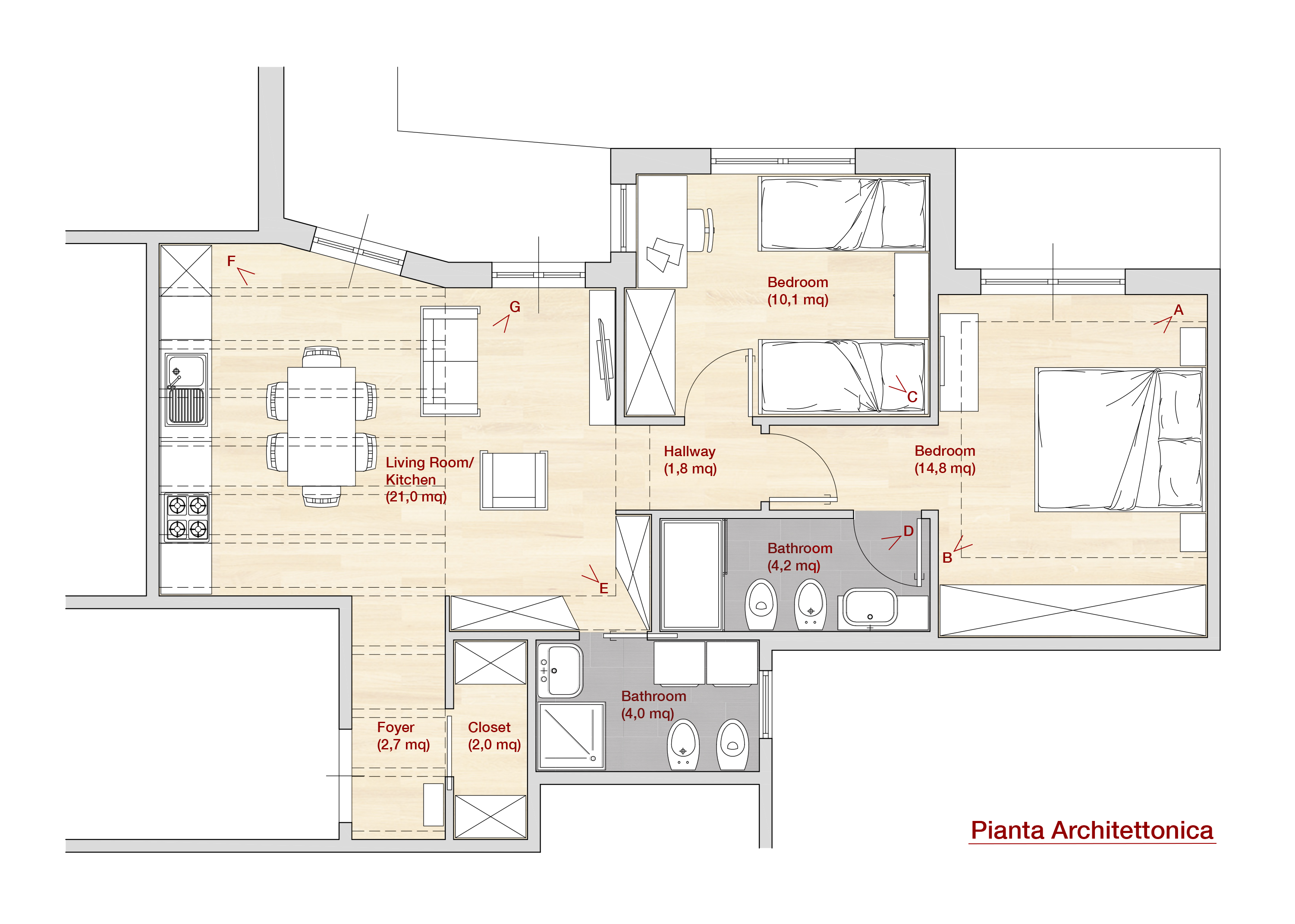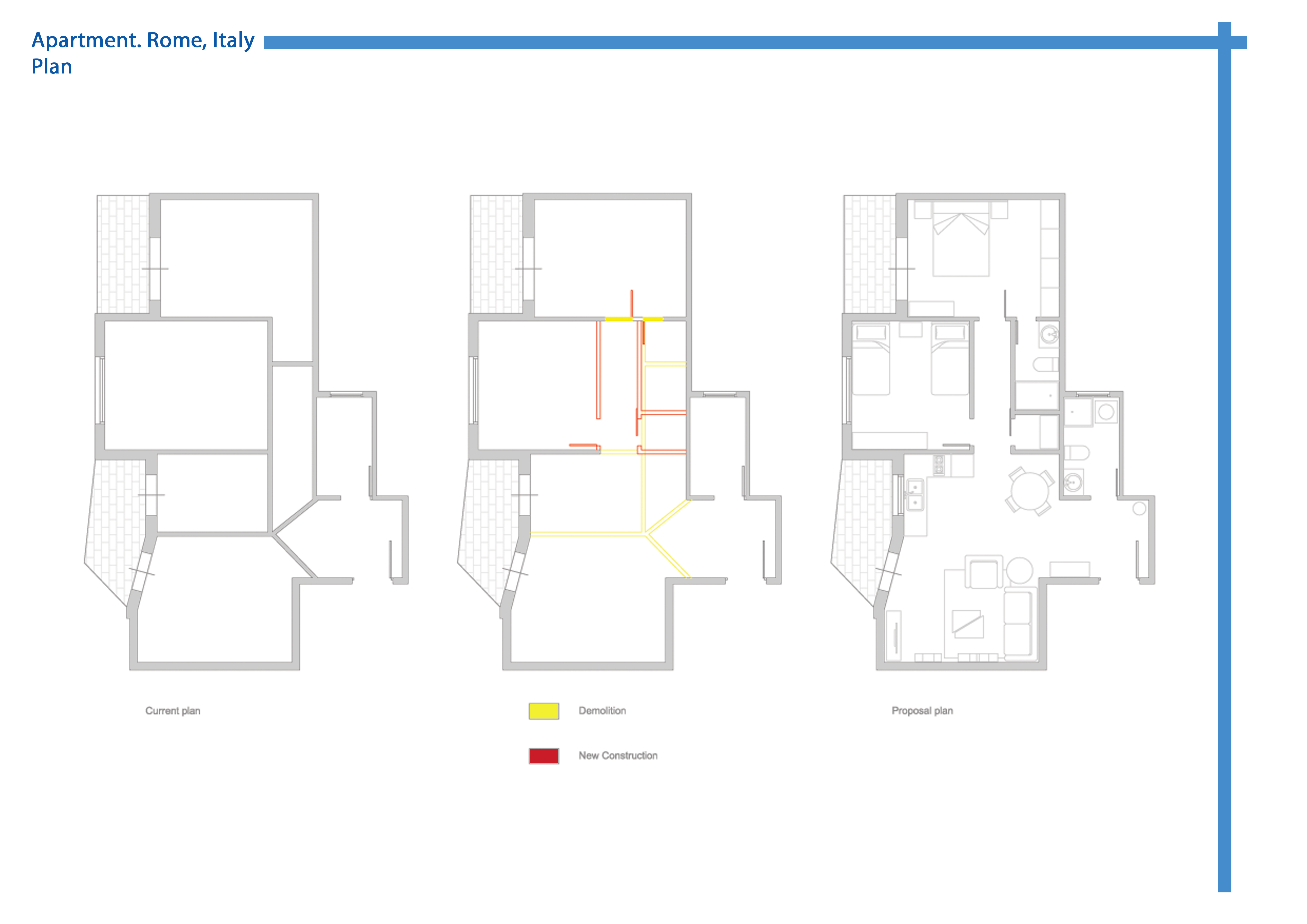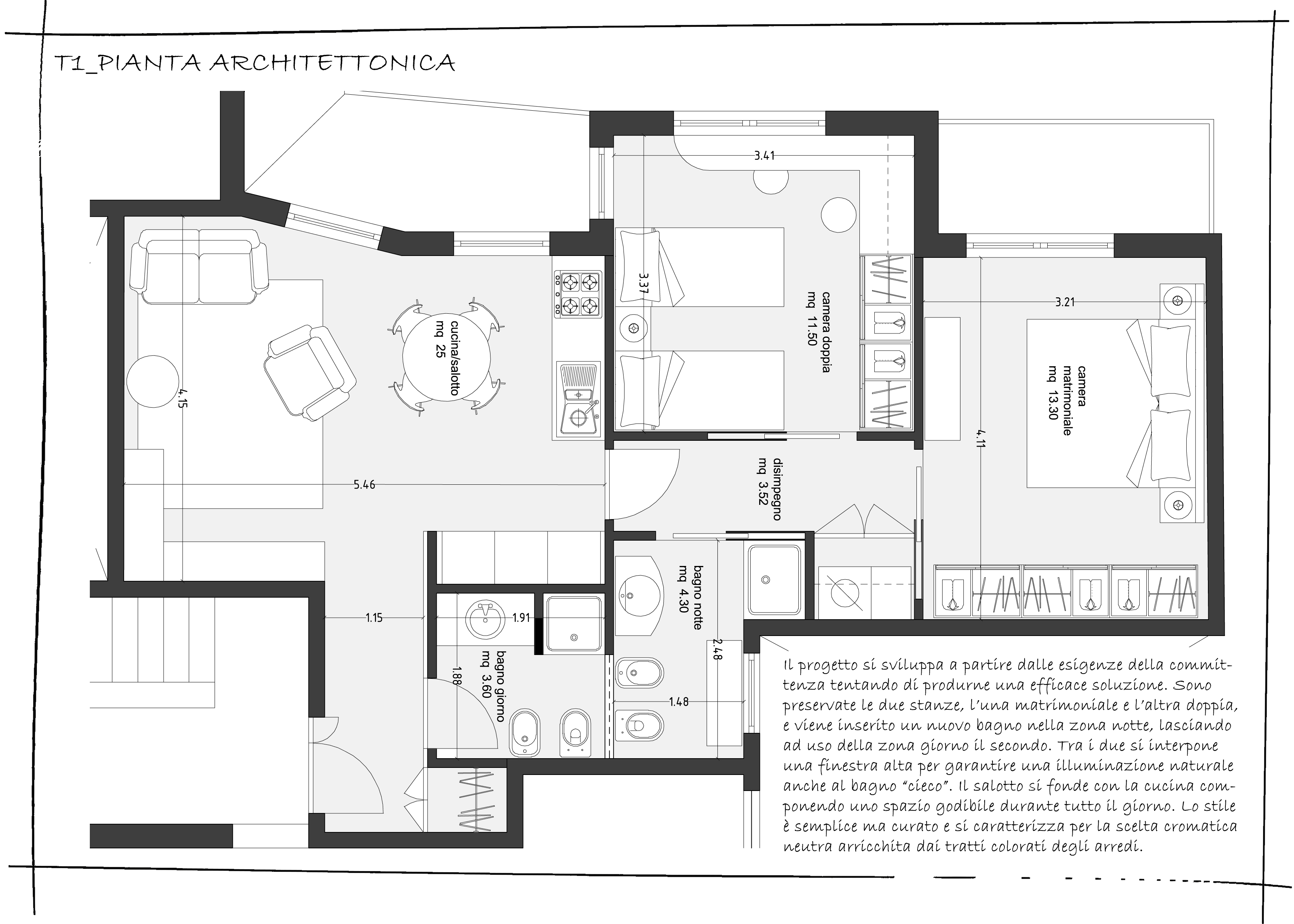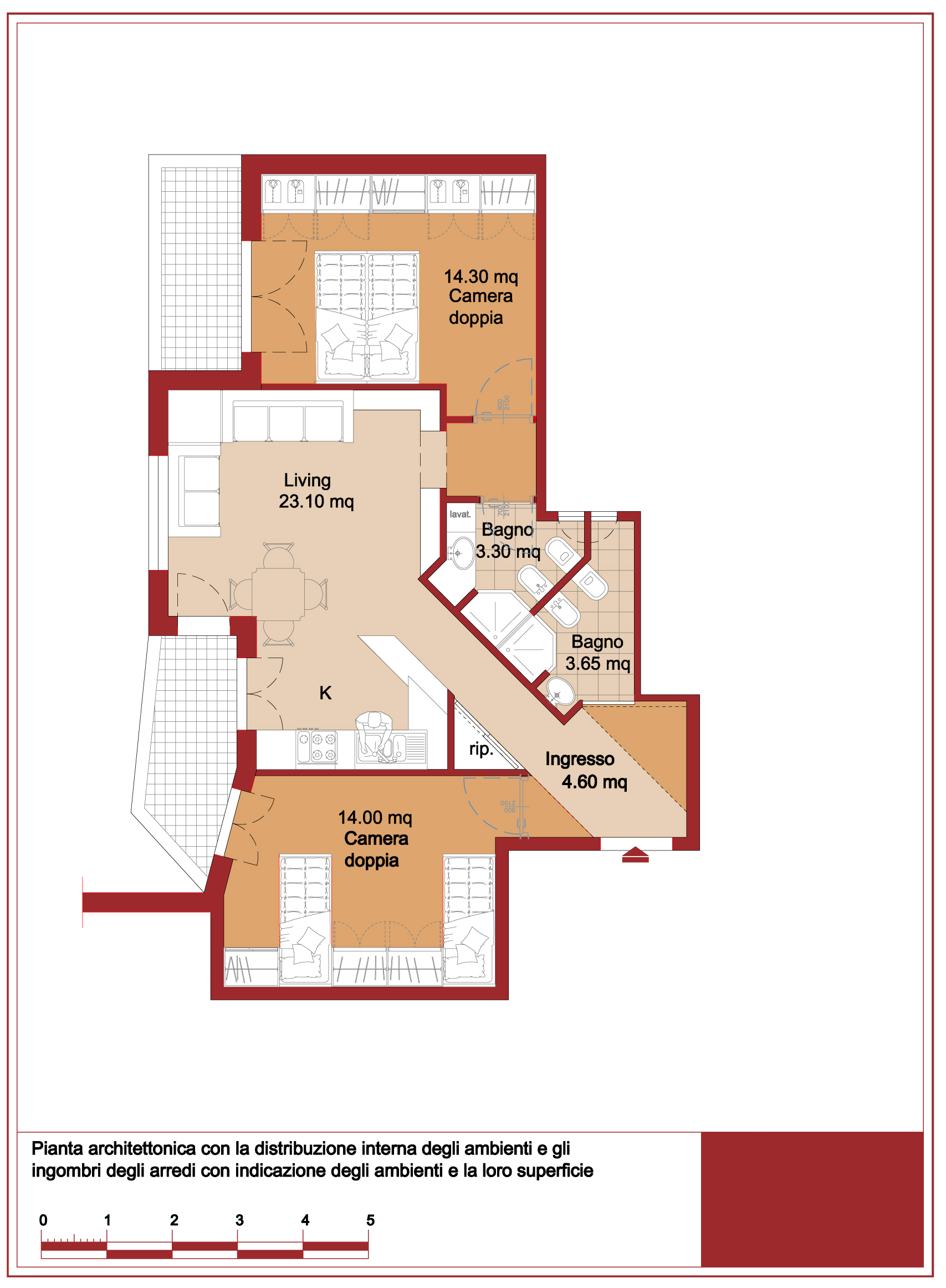 Questo appartamento dovrà diventare cosi: soggiorno con angolo cottura , 2 camere da letto, 2 bagni, piccolo ripostiglio. La parete più lunga del living room è lunga 4,15 metri.