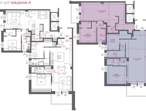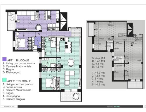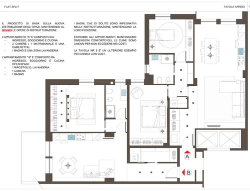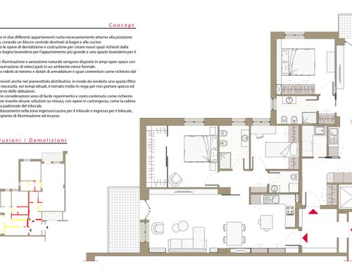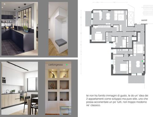 cerchiamo un layout moderno con tutto quello che valorizza al meglio un appartamento in città: giocare sul movimento, creare vani per armadiature e nell'appartamento grande, una piccola zona servizi/lavanderia/bagno giorno