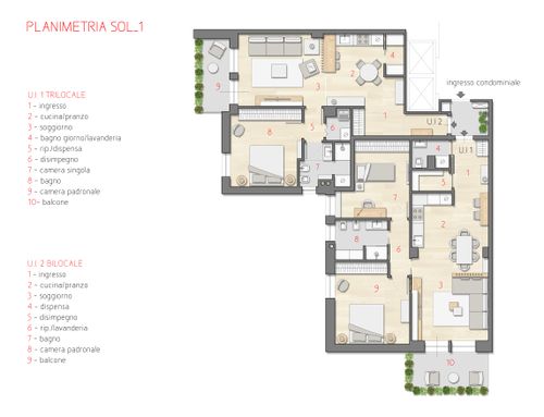 - 1 appartamento più grande trilocale con bagno un piccolo WC/lavanderia