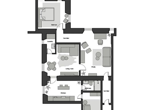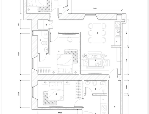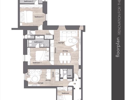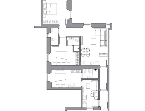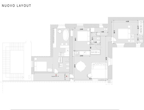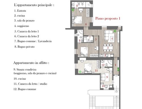 Apartments on the fourth floor, totaling 130 square meters, currently, the interior is already divided into two apartments, as per the plan. The property is located near the Termini station in a building from 1890, in the condominium there are various receptive activities. It is accessed through a hallway with a double armored door. Until now it has been used for renting to students, we would like to build a three-room apartment for me (at least for now that I'm in Rome alone) and a two-room apartment to rent to third parties, increasing the quality and modernity of both. The views are on cloisters (not beautiful), so I think the light should be exploited to the fullest, because it is not much. In total there are three bedrooms, a kitchen, and a kitchen \ bedroom, or five different rooms with four bathrooms. I would like to eliminate a bathroom (or just move it inside a room) so that I have more space in the main kitchen which will be the one I will use. I would like to clarify that for reasons of economy (we have excellent contacts with a construction and stone processing company) it is "easy" to carry out interventions in masonry, false ceilings, etc., as well as using materials such as stoneware, marble, travertine compared to any furniture.