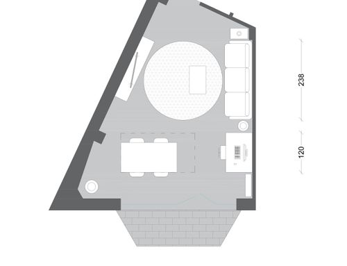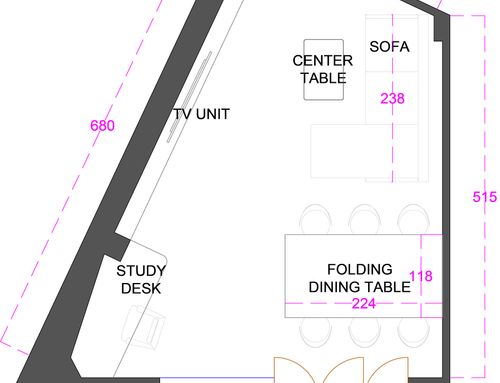 Necesito un proyecto de mi habitación; la habitación tiene una base irregular (no es rectangular) con una puerta francesa muy grande. La estación de TV es fija a menos que hagas algún trabajo para poder conectar el cable de TV en otro lugar, pero por el momento no lo preveo. Me gustaría saber dónde colocar la mesa y el mueble de televisión. La sal está equipada con un sofá de 238 cm. La mesa que me gustaría tiene un tamaño cerrado de 90x170cm (abierto de 118x224cm). Además, trabajar desde casa en una estación de trabajo sería útil, Actualmente estoy usando una mesa de 80x120 alto 105, esta altura me permite una mayor comodidad que la mesa "normal" de 75cm de altura por lo que me gustaría conservar un asiento con estas características, pero dado el espacio no sé si Es posible prever uno diferente al de la mesa principal.