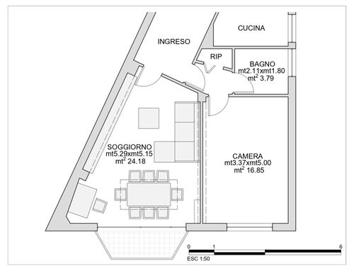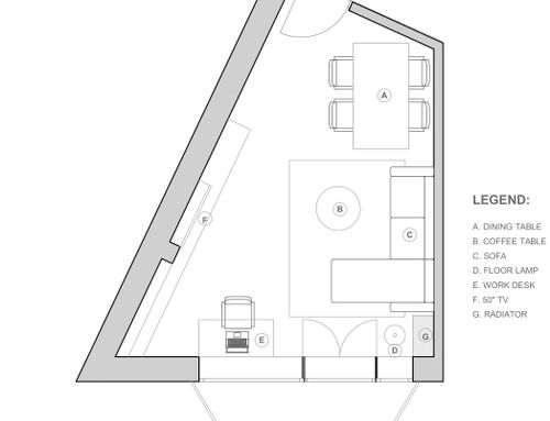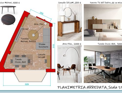 Avrei bisogno di un progetto della mia sala; la stanza ha una base irregolare (non è rettangolare) con una porta finestra molto grande. La postazione per la tv è fissa a meno di non fare dei lavori per poterare il cavo della tv da altre parti, ma al momento non lo prevedo. Mi piacerebbe capire dove posizionare il tavolo e il mobile della televisione. La sala è provvista di un divano largo 238 cm. Il tavolo che vorrei ha una dimensione da chiuso di 90x170cm (aperto di 118x224cm).