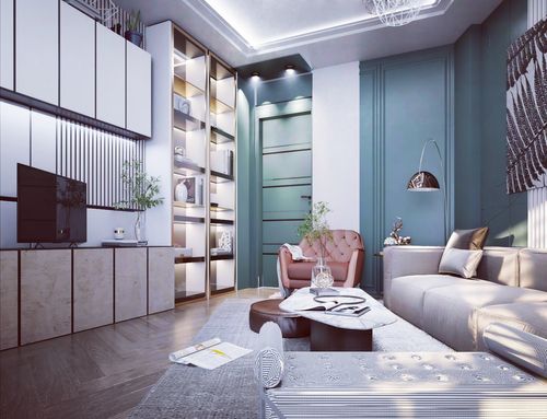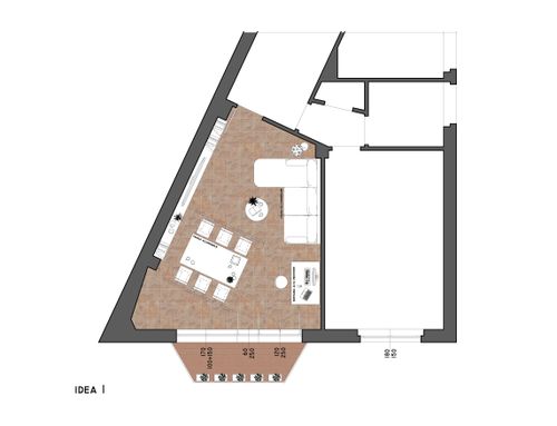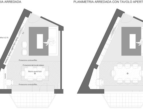 I need a project of my room; the room has an irregular base (it is not rectangular) with a very large French door. The TV station is fixed unless you do some work to be able to connect the TV cable elsewhere, but at the moment I don't foresee it. I'd like to understand where to place the table and the television cabinet. The sal is equipped with a 238 cm sofa. The table I would like has a closed size of 90x170cm (open of 118x224cm).