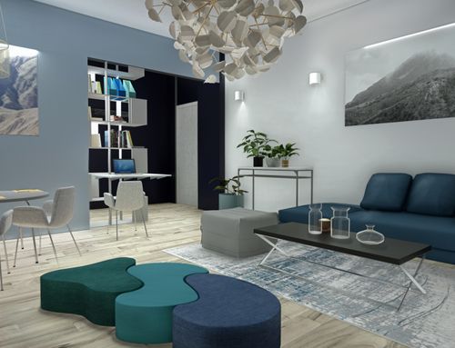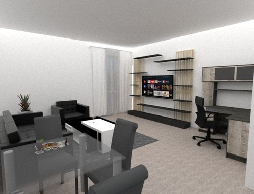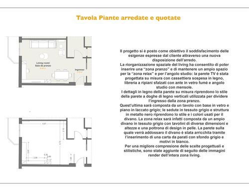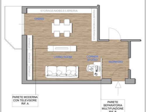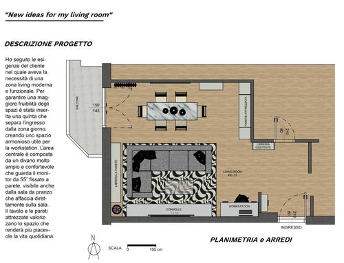 Vorremmo ripensare il soggiorno. La nostra necessità è di avere una zona pranzo con tavolo, una conversazione/divano, un appoggio/angolo per pc/workstation. Desideriamo che sia funzionale e che ci siano mobili/contenitore/parete attrezzata/tv. Vorremmo mantenere una libreria già esistente larga 75 (non necessariamente nella stessa posizione in cui è ora) E presente una porta finestra (cm 140) con affaccio su condominio. Possiamo valutare divisori tra ingresso e zona living (librerie bifacciali, cartongesso etc). Nessun vincolo di prese elettriche/antenna TV, possiamo spostare tutto. Siamo 2 adulti e un bambino. preferiamo uno stile moderno e funzionale.