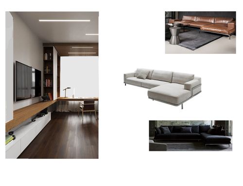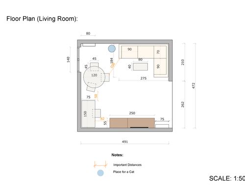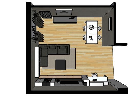 We would like to rethink the living room. Our need is to have a dining area with a table, a conversation/sofa area, a corner for pc/workstation. We also desire a wall system with tv and storage units. We'd like to keep an existing bookcase wide cm 75 (not necessarily at the same position). There's a French window (cm 140) overlooking an apartments building. We can consider dividing elements between the entrance and livingroom (double-sided bookcases,drywall,etc). No obligation about electrical/TV outlets. we can move them . We are 2 adults and a child. we prefer a modern style and pratical.