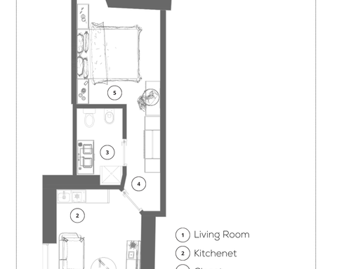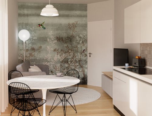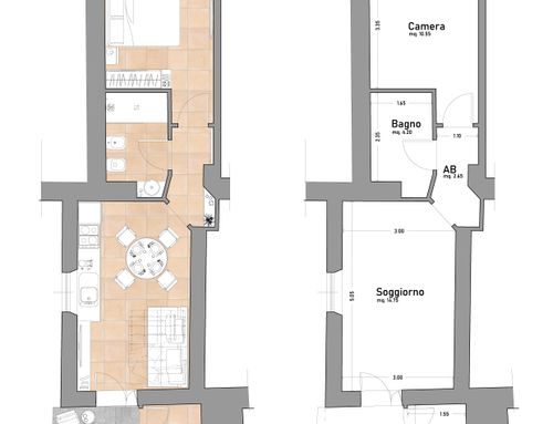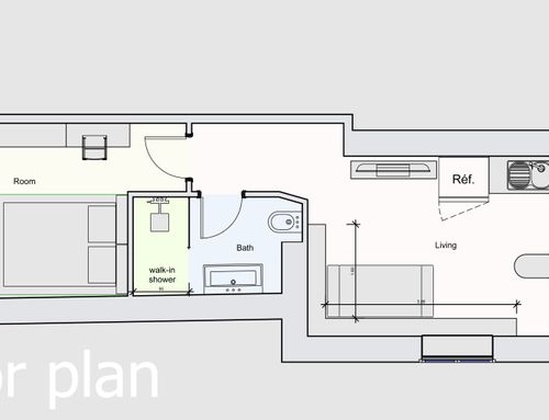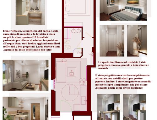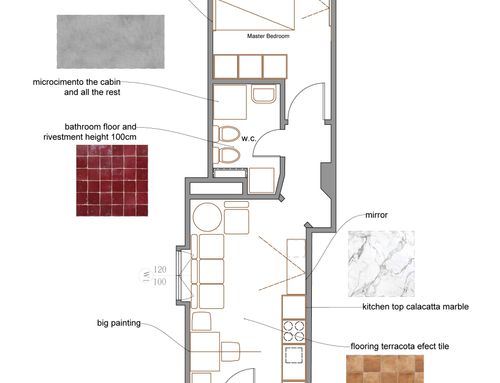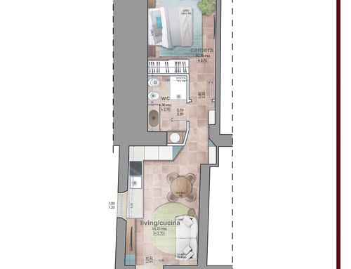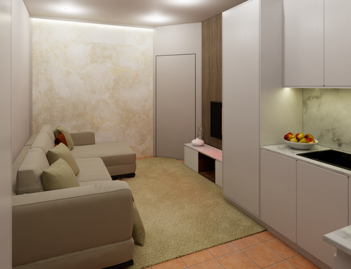 The flooring will be done with terracotta-effect tiles. The furniture should be simple and functional. It should accommodate four people, with one double bed and one sofa bed. The walls will be painted white or in soft, neutral tones.