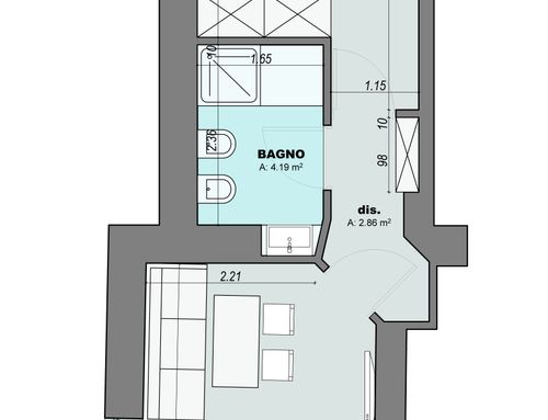 The kitchen should be fully equipped with all appliances. The bathroom (without windows) should include a shower, toilet, bidet, sink, and some cabinets for storage. The apartment is not very bright