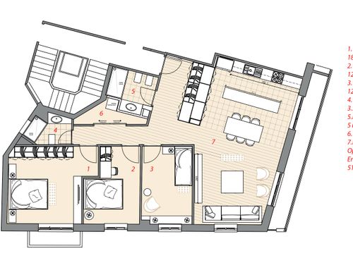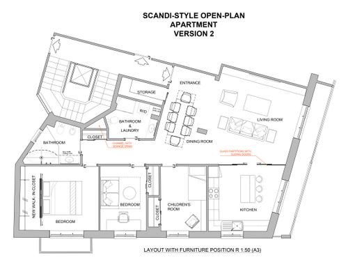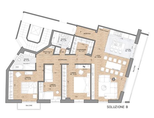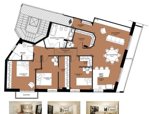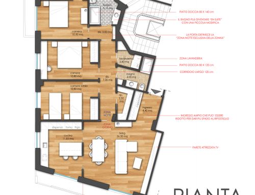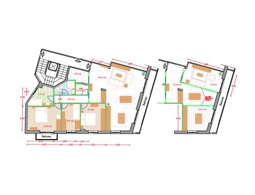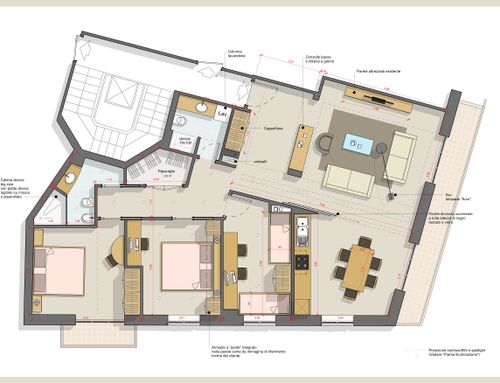 - Bedrooms: We would like three bedrooms. The current "cucina" in the plan we want to turn into the children bedroom. As indicated in the attached plan, we want a built-in closet in the middle bedroom by taking space from the largest bedroom with the small balcony. The middle bedroom is a combined bedroom/home office and needs space for a desk. The bedroom with small balcony would be the largest bedroom (for grandma).