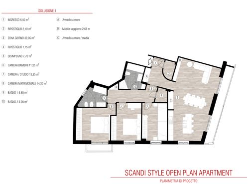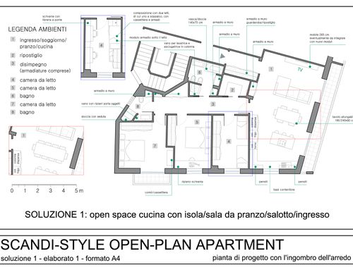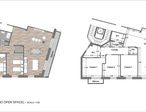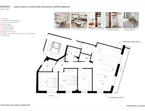 -salotto/cucina:Vorremmo trasformare il "soggiorno" e "la camera affacciata sul balcone lungo" nella planimetria attuale in salotto, cucina/sala da pranzo, con tavolo che puo' sedere 6 persone (fino a 10 con estensione). Vorremmo buttare giu' il muro che separa ingresso e nuovo salotto in mode da creare un open space. Vorremmo due opzioni. Opzione 1: open space cucina con isola/sala da pranzo/salotto/ingresso Opzione 2: separare cucina/sala da pranzo (con isola) dal salotto/entrata ma mantendo comunque il senso di open space (magari con ampie porta scorrevole).