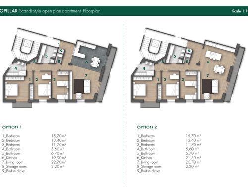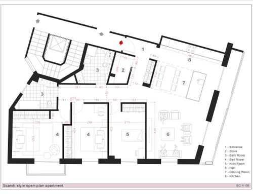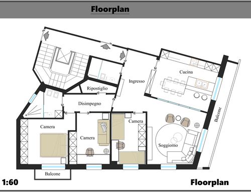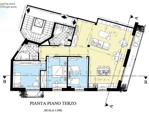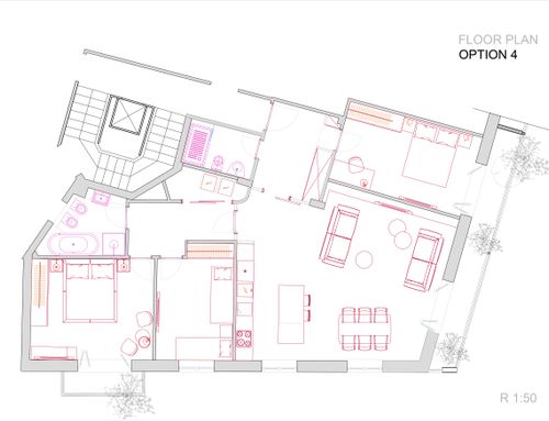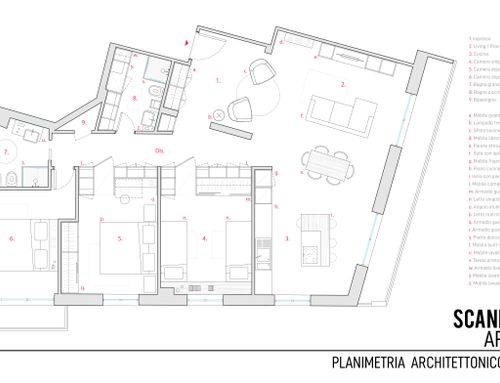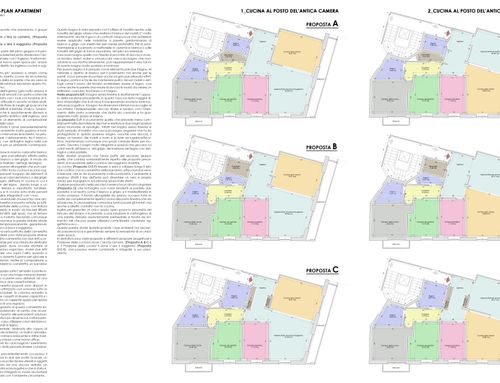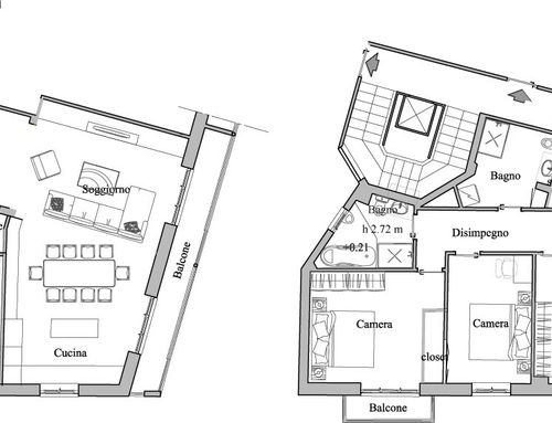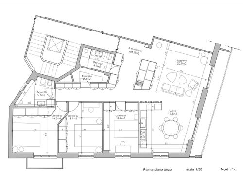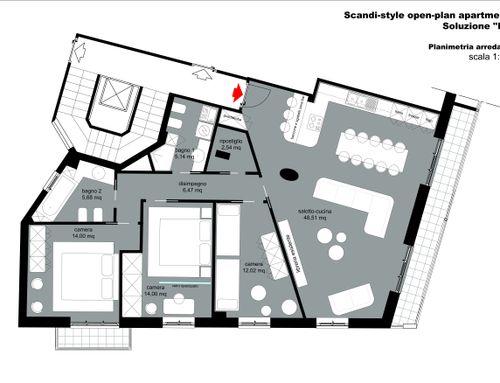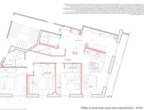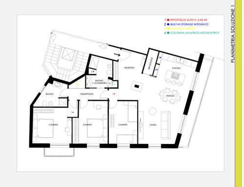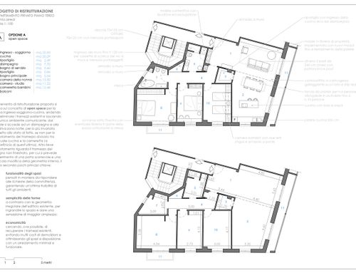 - Living room/kitchen: They should be located where now are the "soggiorno" and the "camera" next to the large balcony. The kitchen/dining room should have space for a large table seating up to 6 (and 10 with extension). We would also like to open up the “ingresso” and merge it with the living room to create a complete open space. We need to keep pillars as indicated on map but walls can be removed. We would like two options. Option 1: a complete open space for entrance/living room and kitchen/dining with kitchen island. Option 2: separate kitchen/dining (still retaining the kitchen island) from the living room/entrance but create as much as possible the feeling of open space (maybe via a large sliding door).