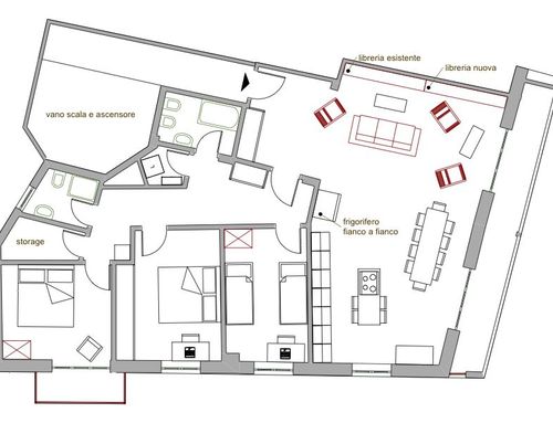 -camere da letto: vorremmo tre camere da letto. L' attuale "cucina" diventera' camera bimbi. Come indicato nello sketch, vorremo a built-in armadio per la camera al centro prendendo spazio dalla camera nell'angolo (quella con il balcone piccolo) che e' comunque troppo grande. La camera al centro (destinata alla coppia di genitori) sara sia stanza da letto sia home-office e ha bisogno di spazio per scrivania. La stanza nell'angolo e' per la nonna e rimarra leggermente piu' grande delle altre.