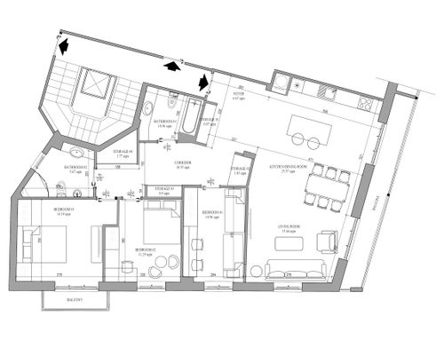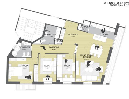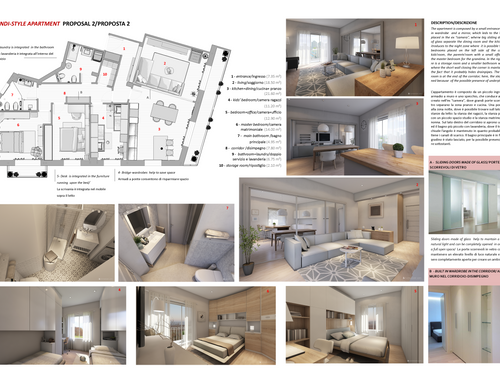 -Storage: We want a storage space for large items of approx 2-3 sqm (currently not on plan). Maybe best position is to either take space from bathroom adjacent to “ingresso” or directly from the "ingresso" but we need your help here. We are also happy to consider two smaller storage space if this is more space-efficient. In addition, where space allows, we would like to carve out built-in storage seamlessly integrated with walls (see pics of examples, sitting corner with built-in storage on the walls or bathroom with built-in storage above the bath).