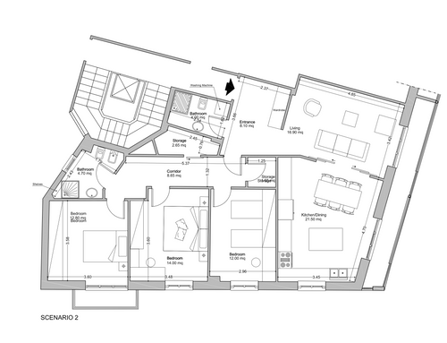 -Bagni: Non abbiamo bisogno di bagni grandi. Un bagno deve avere doccia/vasca da bagno piccola, bidet, toilette e lavandino. Per il secondo bagno e' sufficiente lavandino, doccia e toilette. Inoltre, uno dei due bagni ha bisogno di spazio per la lavatrice e asciugatrice (una sopra l'altra). E' possibile spostare la posizione attuale di lavandino e toilette. Il bagno con finestra ha attualmente uno scalino ma pensiamo che possa essere rimosso (controlleremo durante la fase di demolizione).