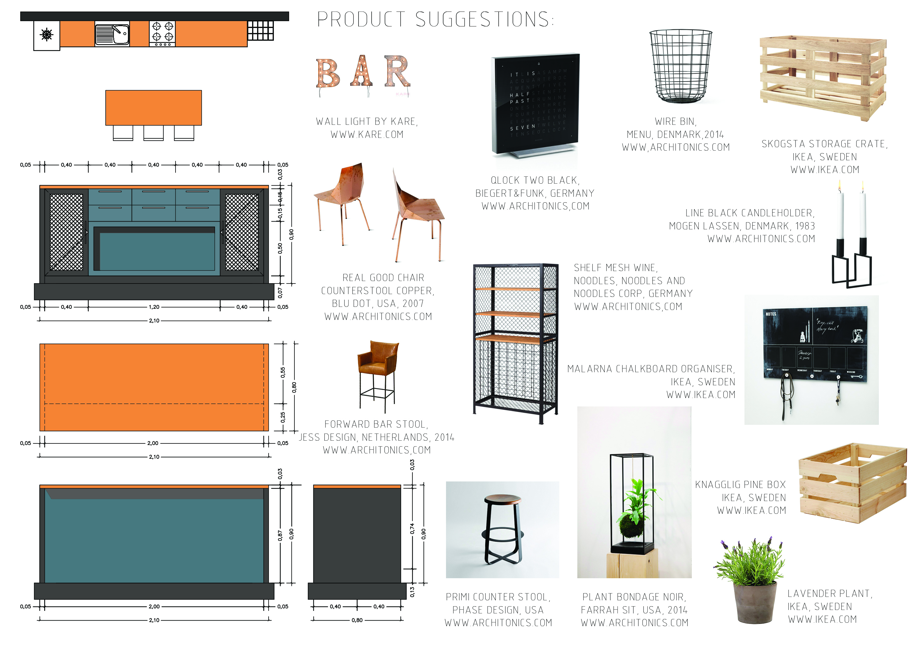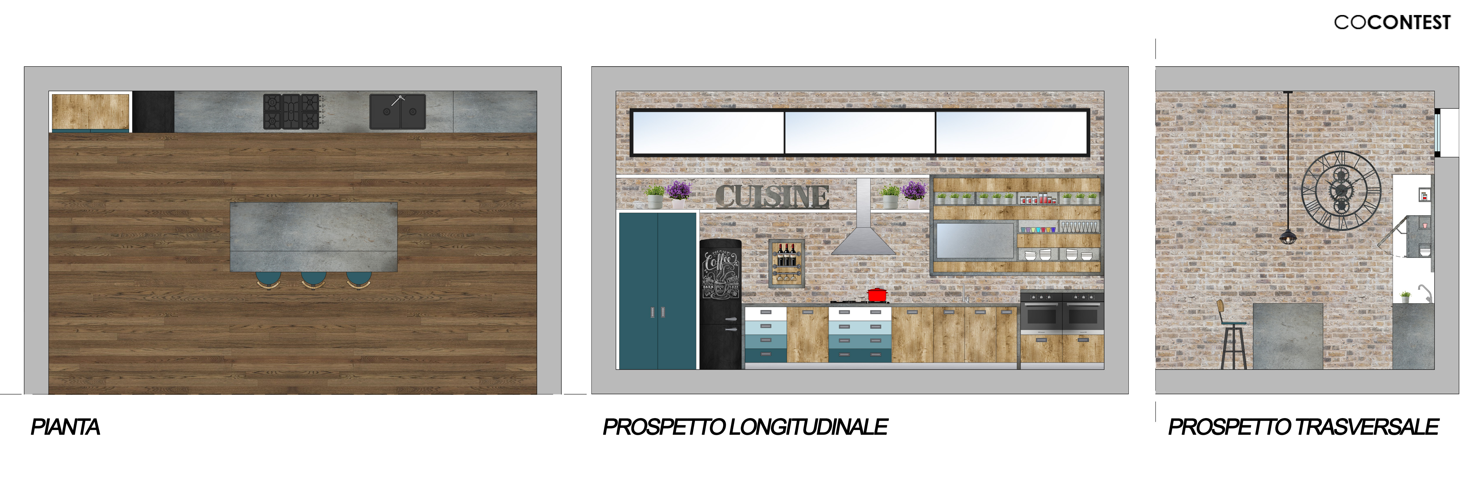 - suggerimenti per l’arredo: ripiani in acciaio drip metal, macchie di colore tipo Pantone 3165 U (ante oppure oggetti), porta oggetti a calata dal soffitto, pianta con foglie che scendono a grappolo, , sgabelli stile industriale (ma comodi, imbottiti tipo cuoio)