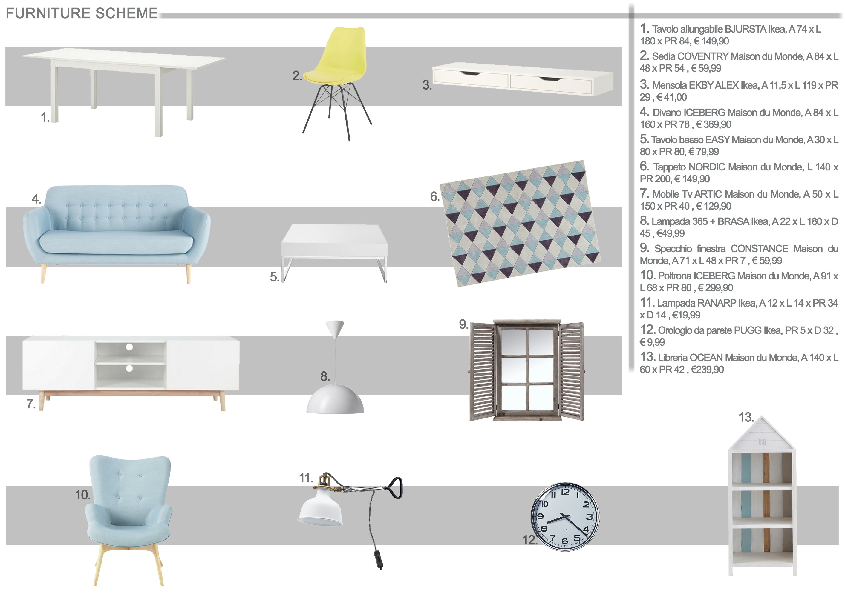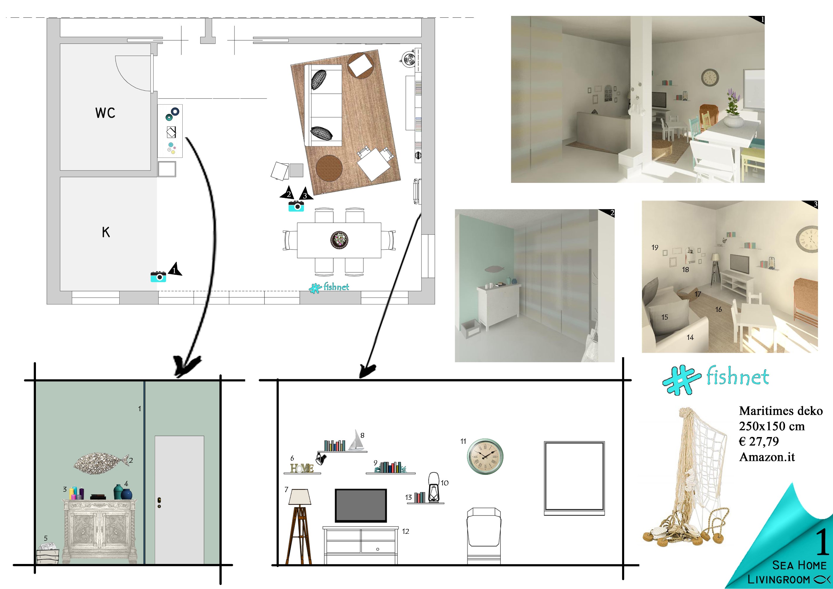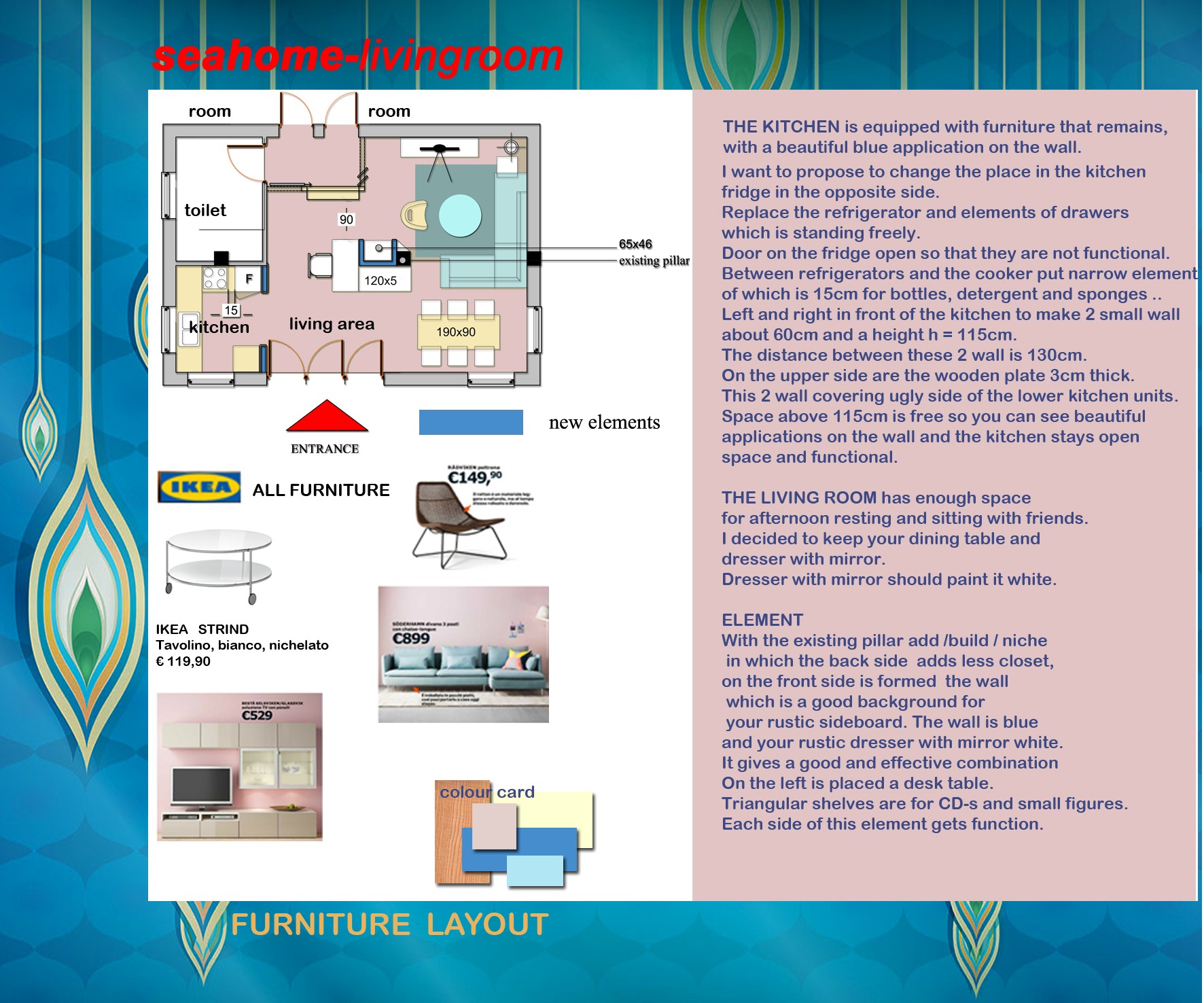 The kitchen area is already fitted and in the living we would like neutral colors white, cream, with particular marine decoration, but not too much. We have a table with colorful chairs (we have colored with our children!) and we would like to have a sofa and TV.