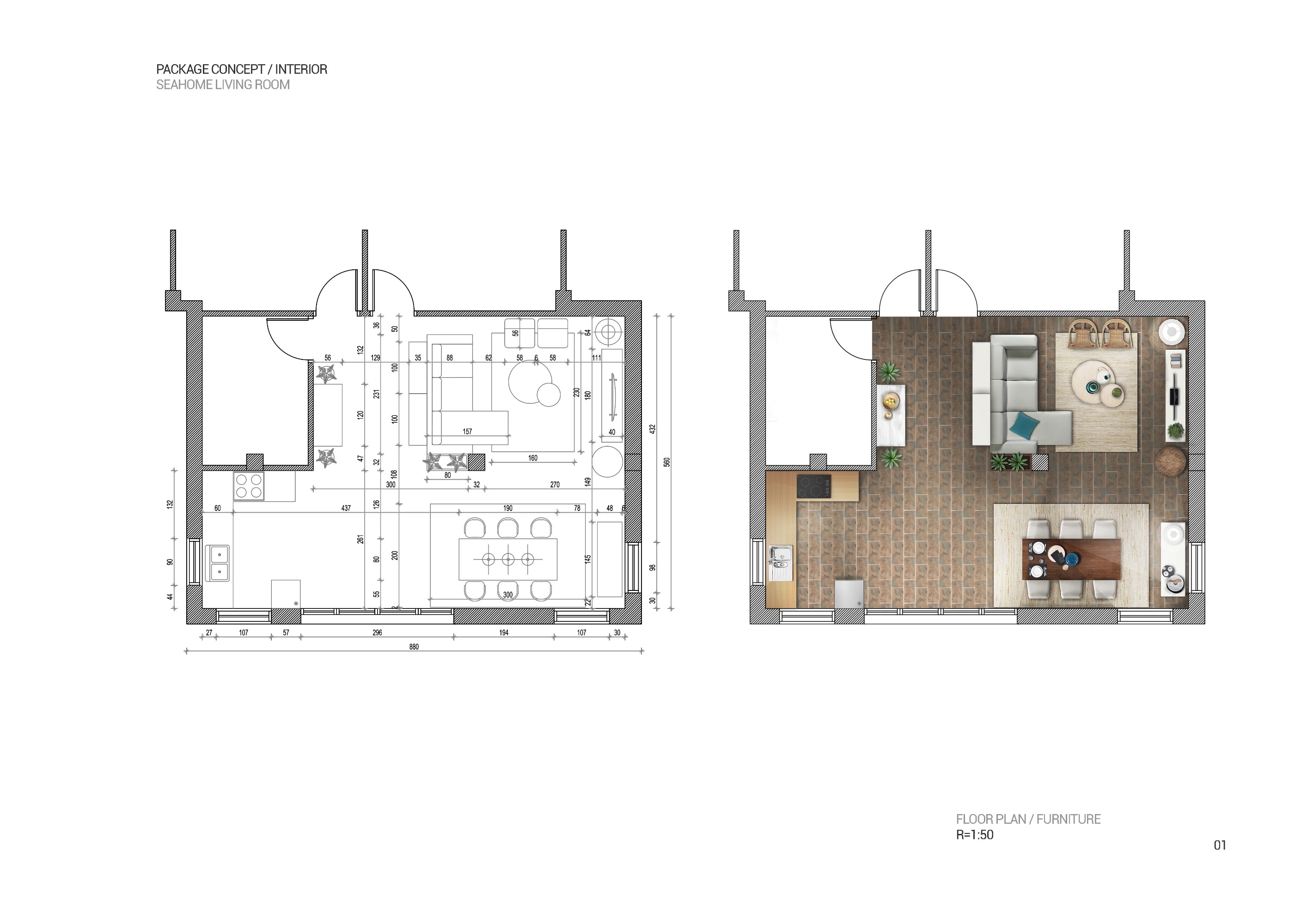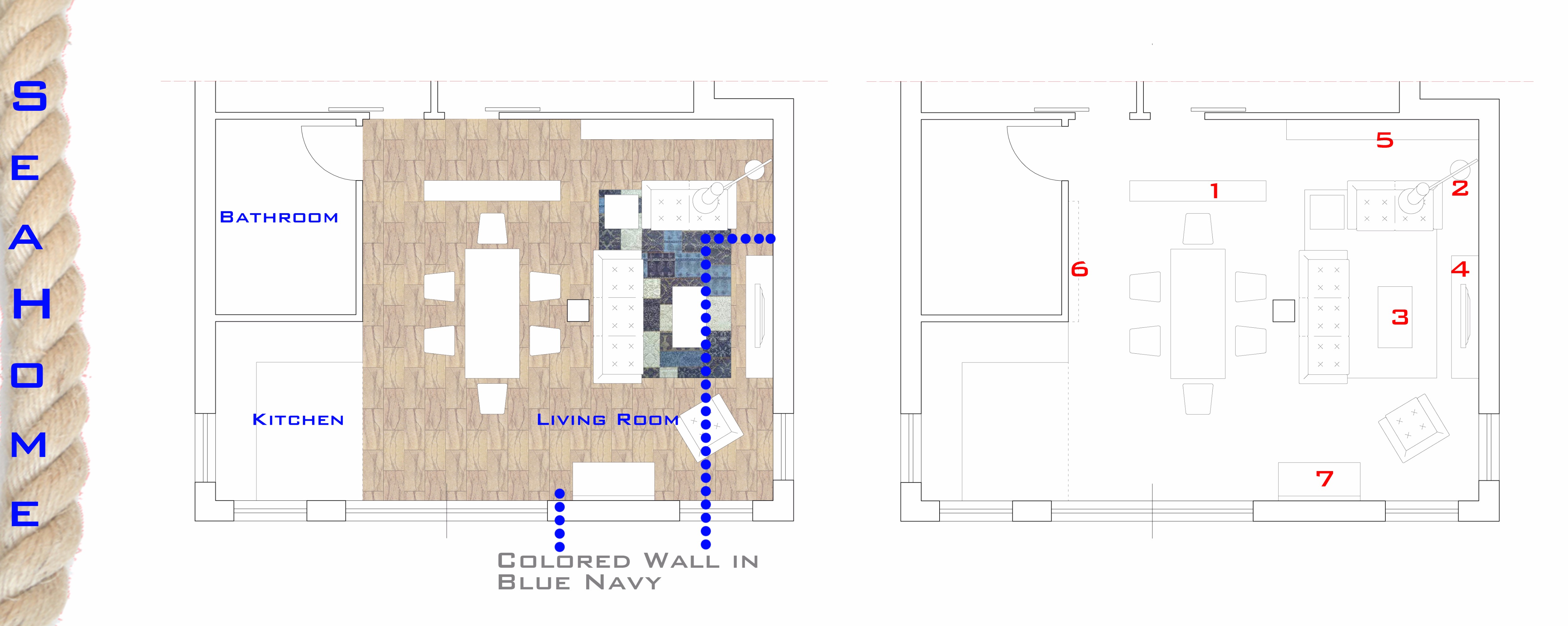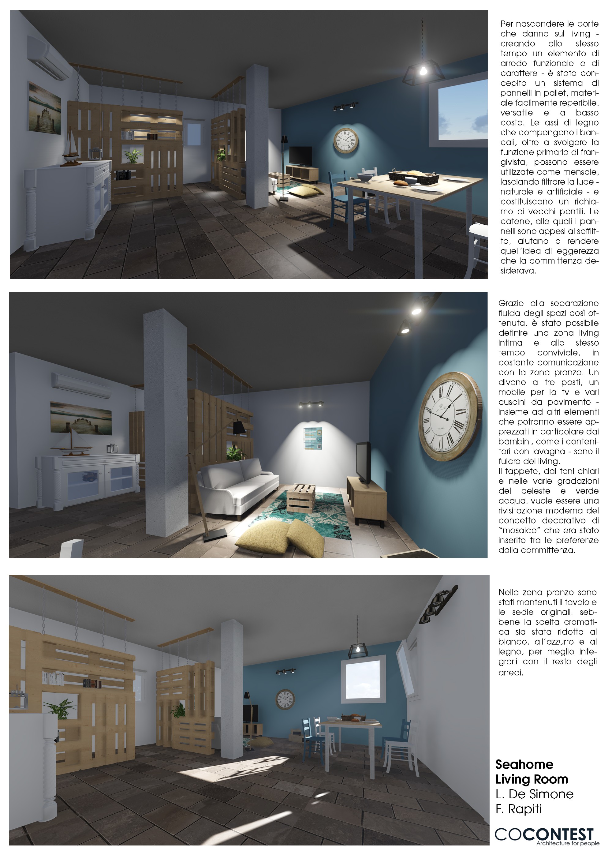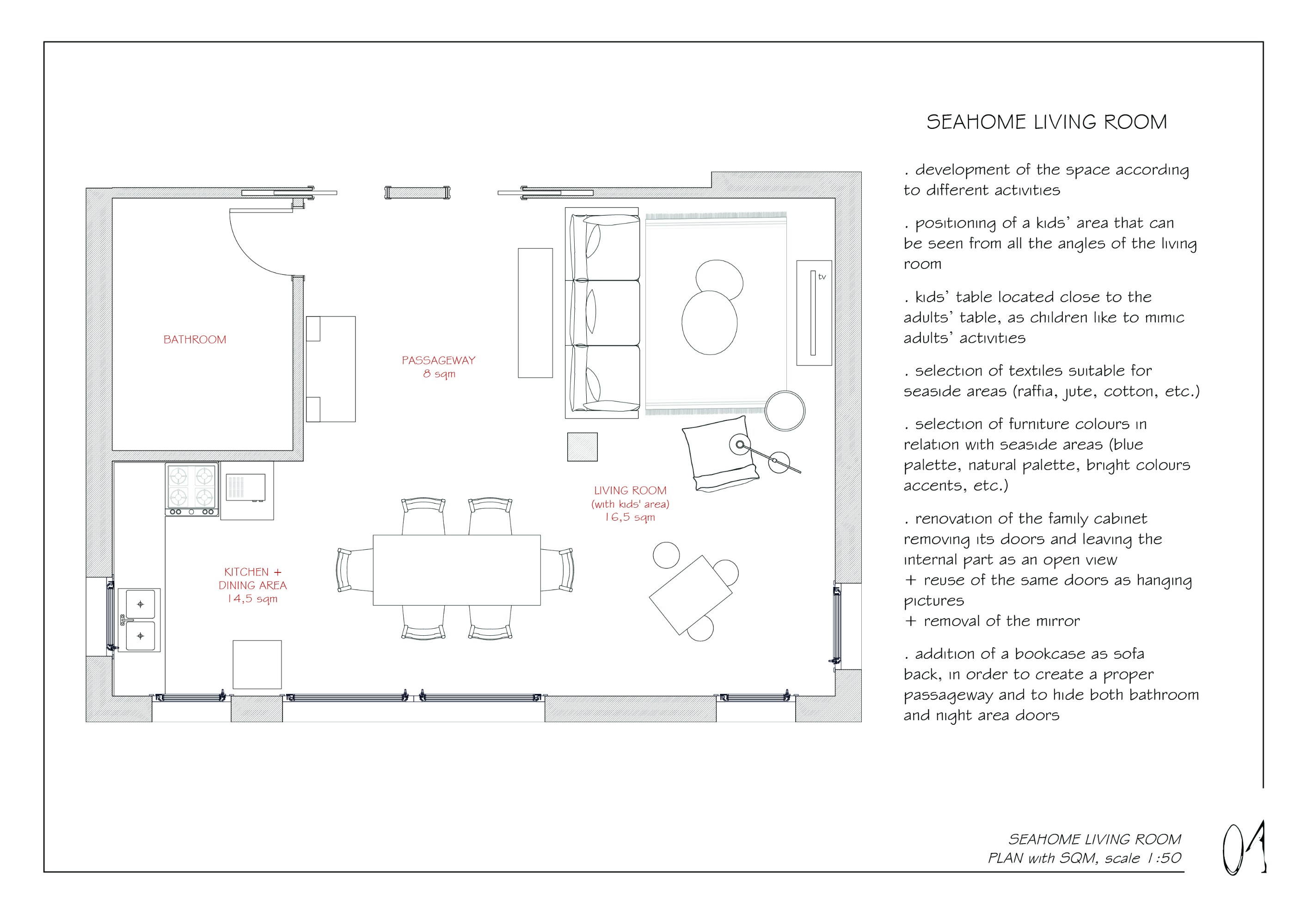 The kitchen area is already fitted and in the living we would like neutral colors white, cream, with particular marine decoration, but not too much. We have a table with colorful chairs (we have colored with our children!) and we would like to have a sofa and TV.