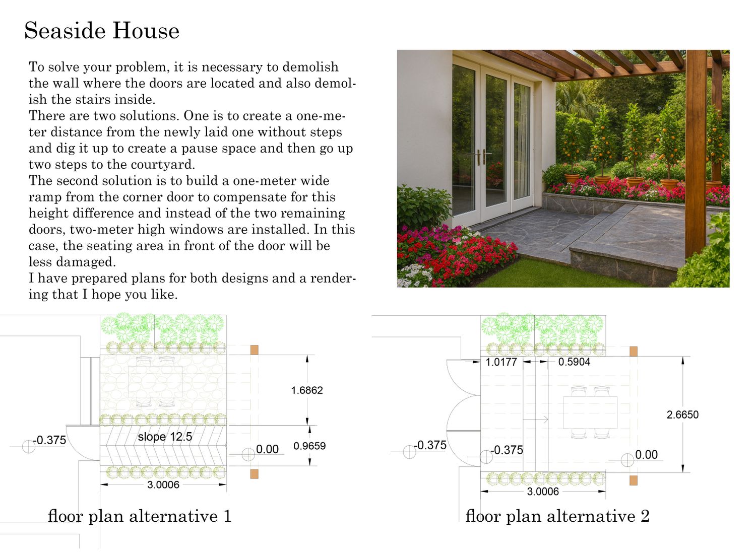 The second solution is to build a one-meter wide ramp from the corner door to compensate for this height difference and instead of the two remaining doors, two-meter high windows are installed. In this case, the seating area in front of the door will be less damaged.