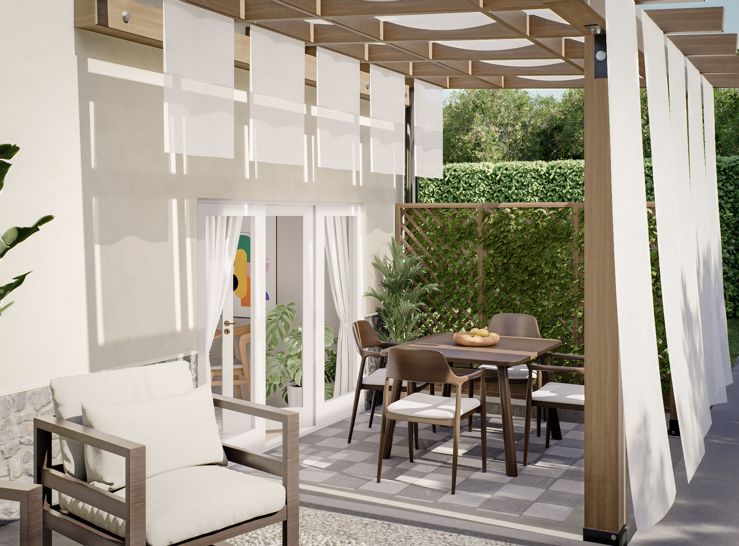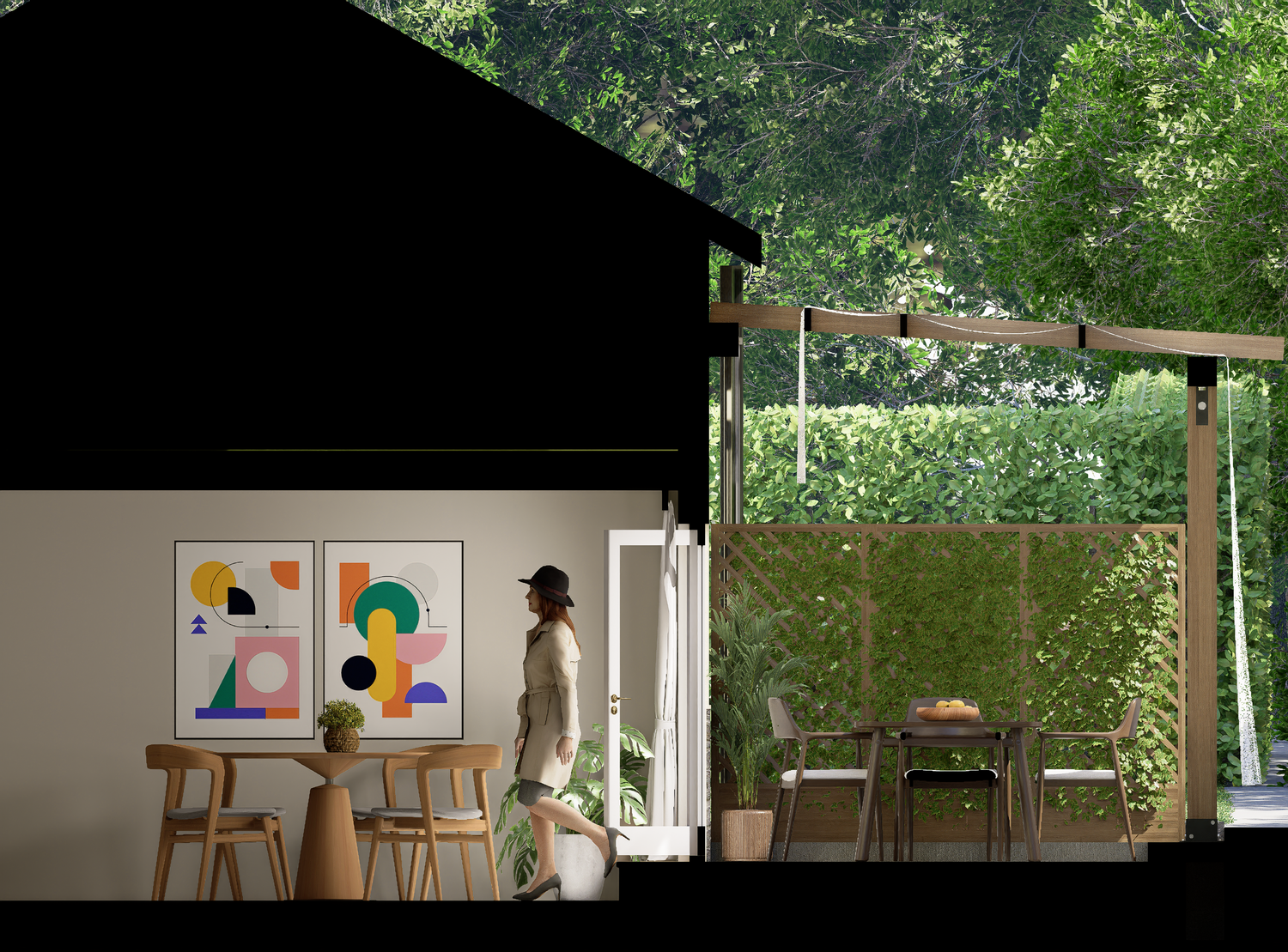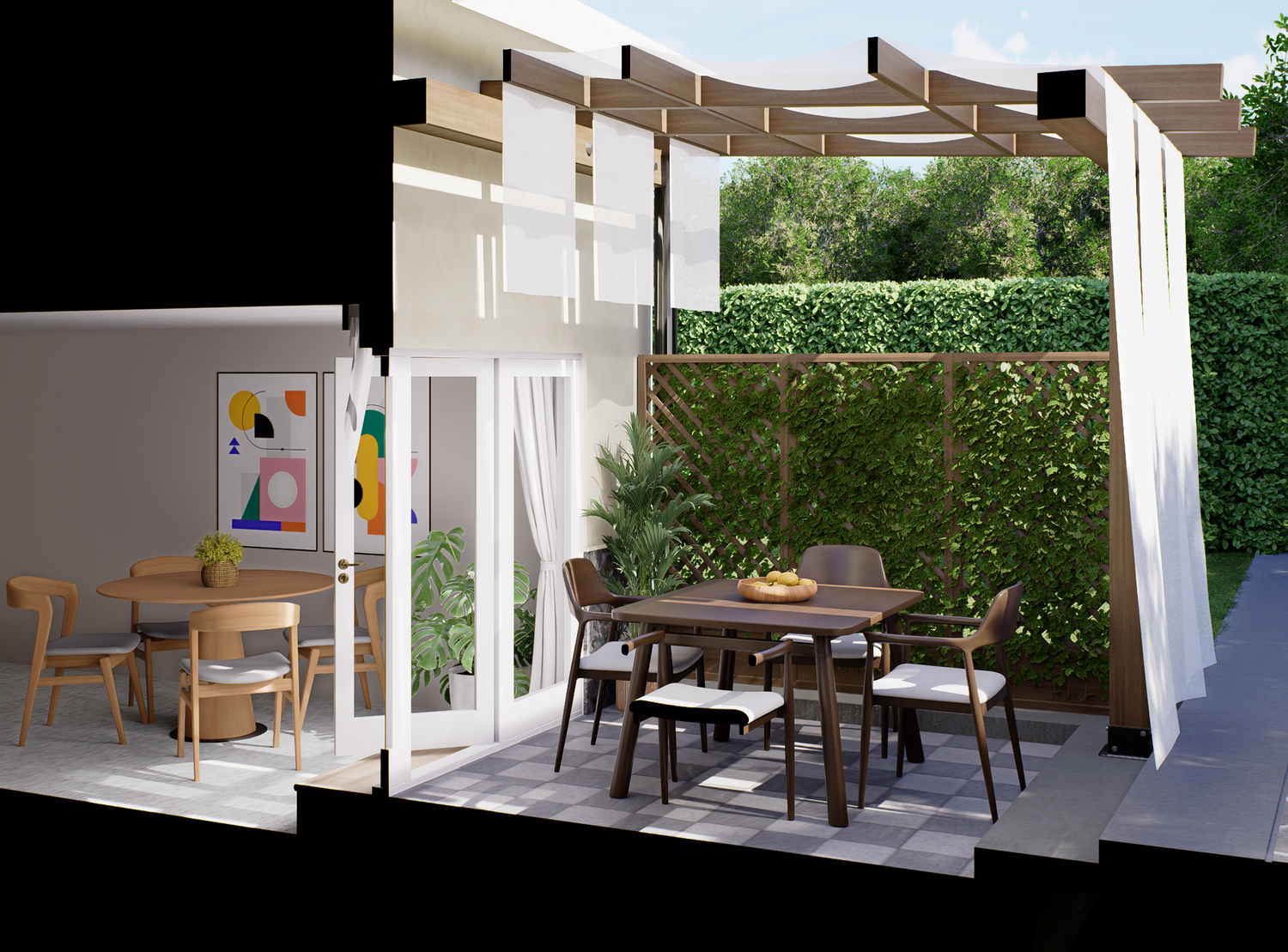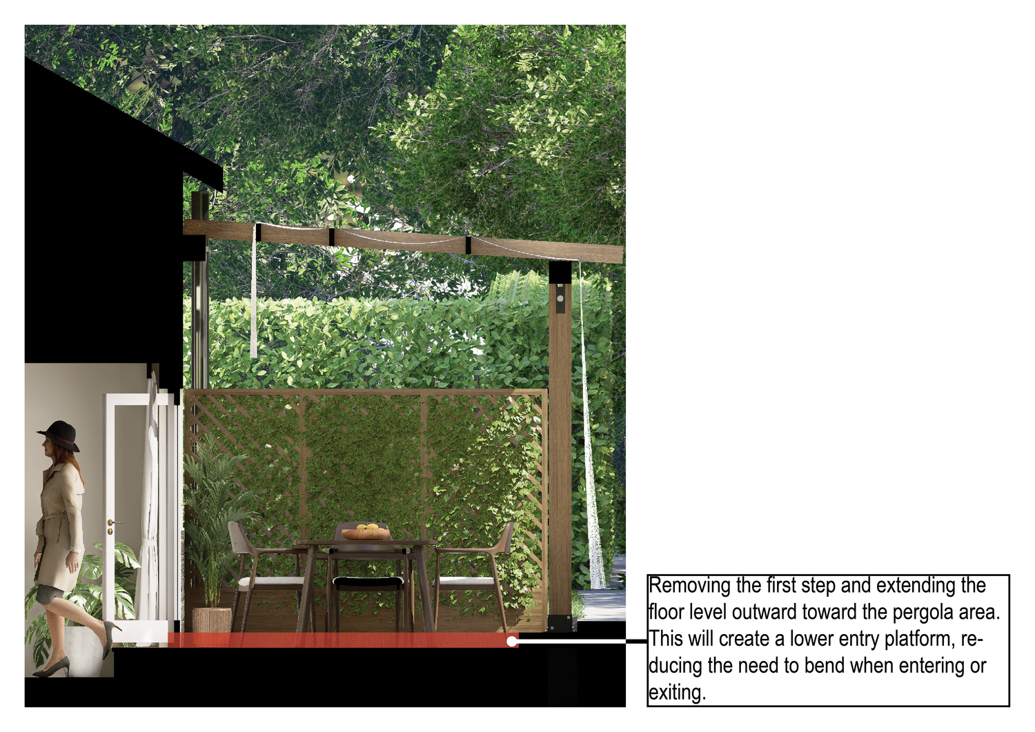 To improve the entrance without altering the ceiling or door height, I propose removing the first interior step and extending the floor level outward toward the pergola. By demolishing the first step and creating a small, lowered platform outside, we minimize bending on entry and achieve a smoother, more comfortable transition between the garden and the apartment, resulting in a subtle sunken entry area that still connects naturally to the outdoor space. A proper drainage hole will be included at the lowest point of the new lowered area to ensure rainwater flows away safely and does not accumulate near the door.