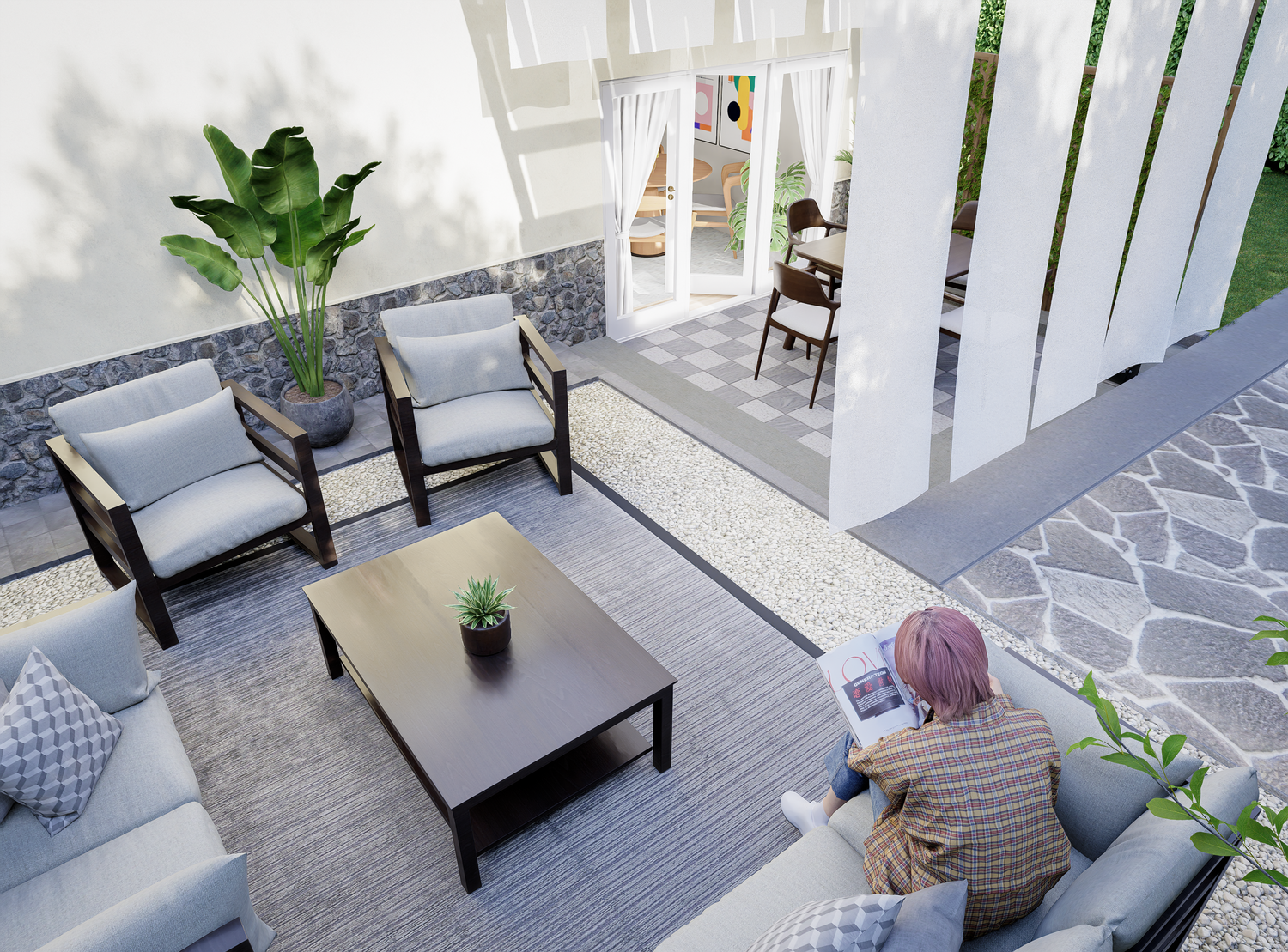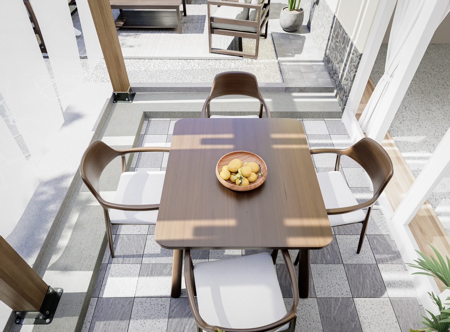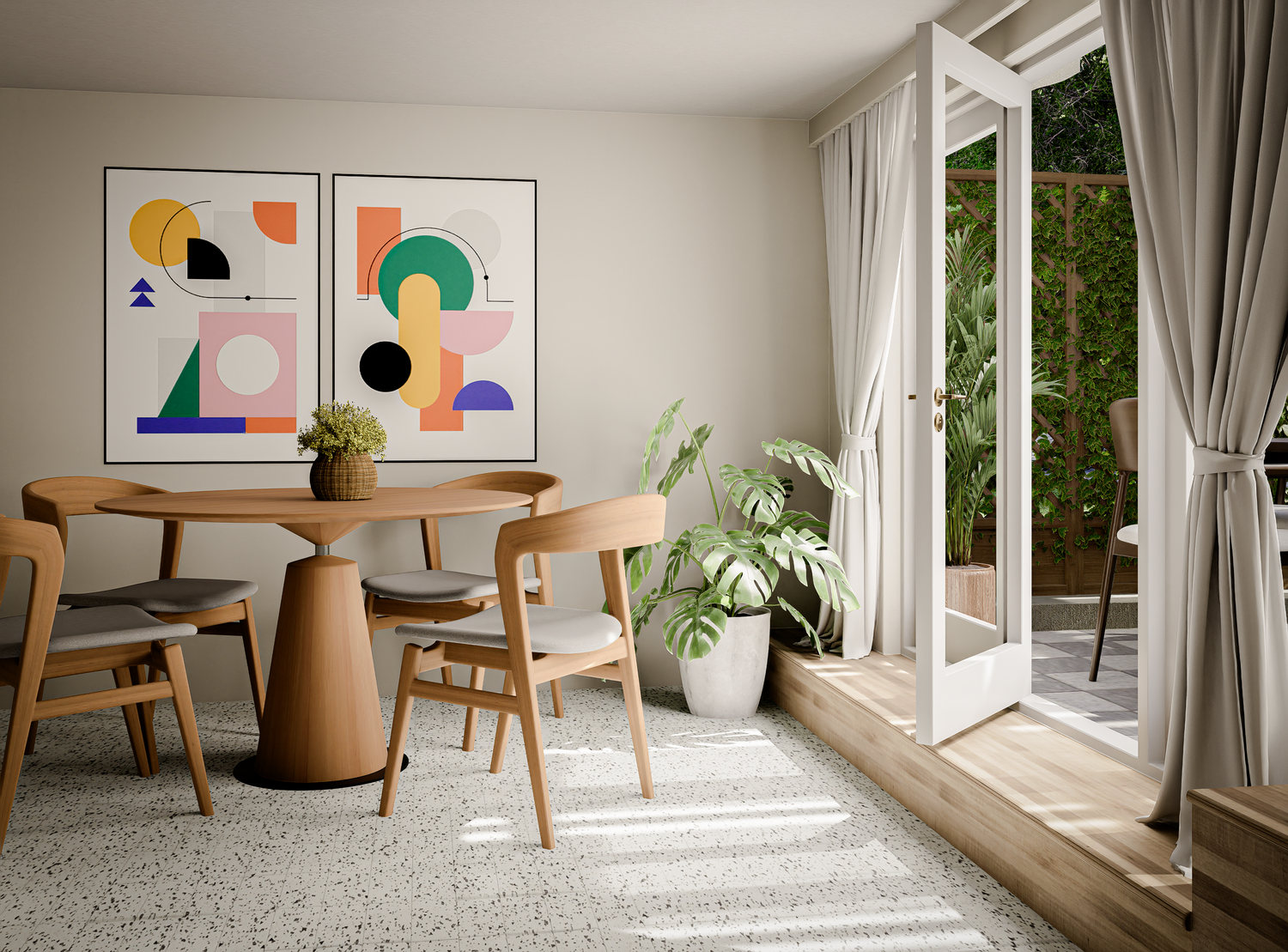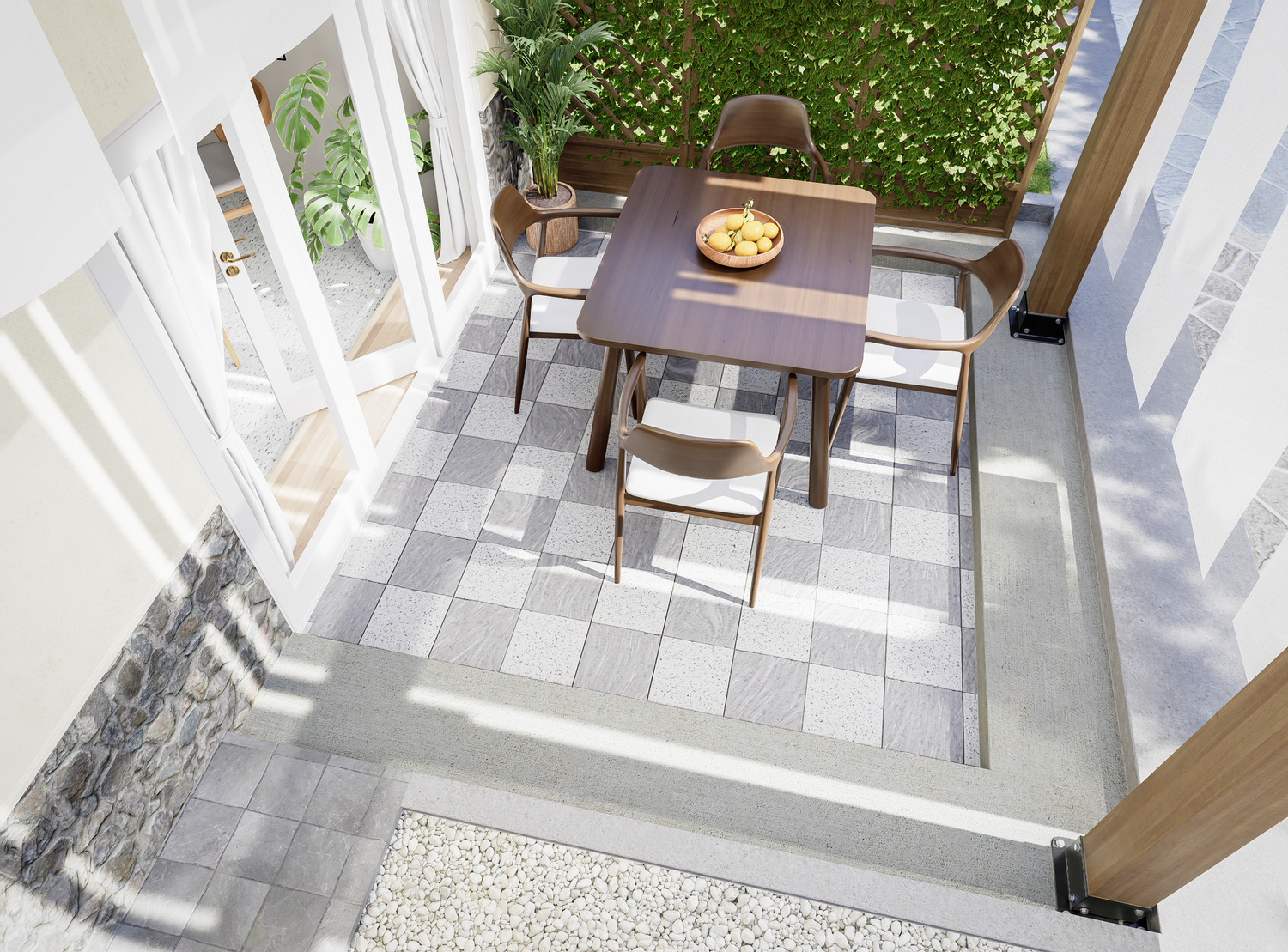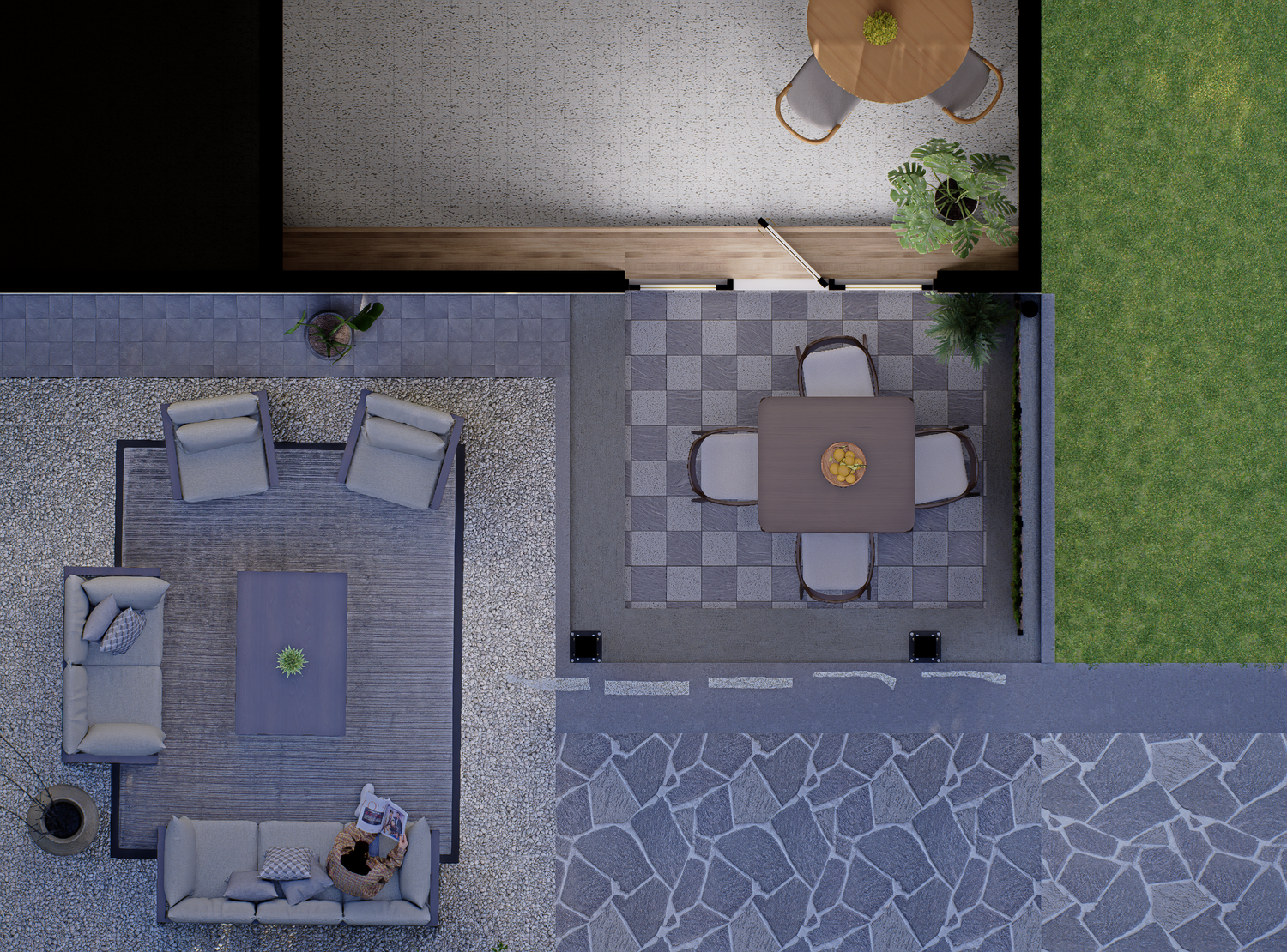 To improve the entrance without altering the ceiling or door height, I propose removing the first interior step and extending the floor level outward toward the pergola. By demolishing the first step and creating a small, lowered platform outside, we minimize bending on entry and achieve a smoother, more comfortable transition between the garden and the apartment, resulting in a subtle sunken entry area that still connects naturally to the outdoor space. A proper drainage hole will be included at the lowest point of the new lowered area to ensure rainwater flows away safely and does not accumulate near the door.