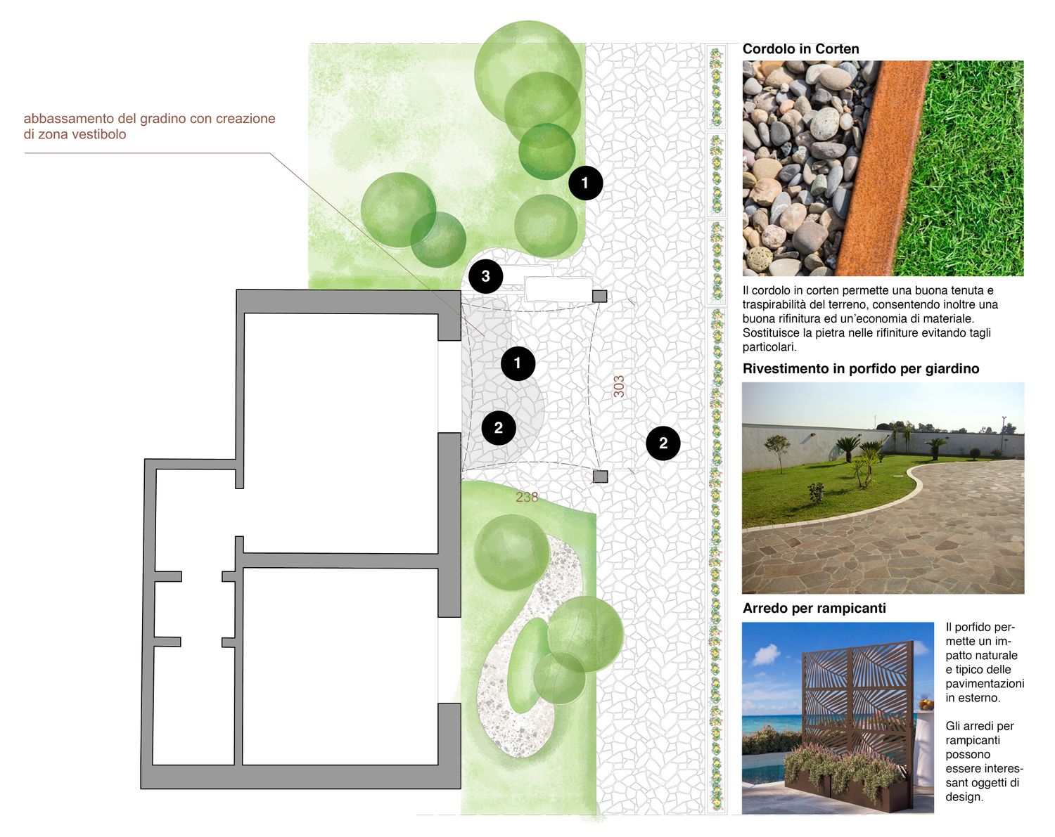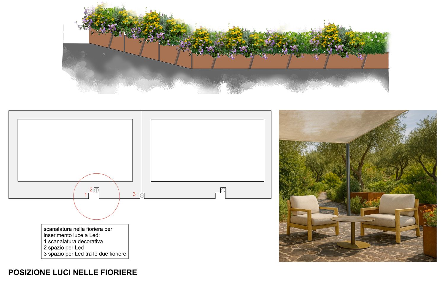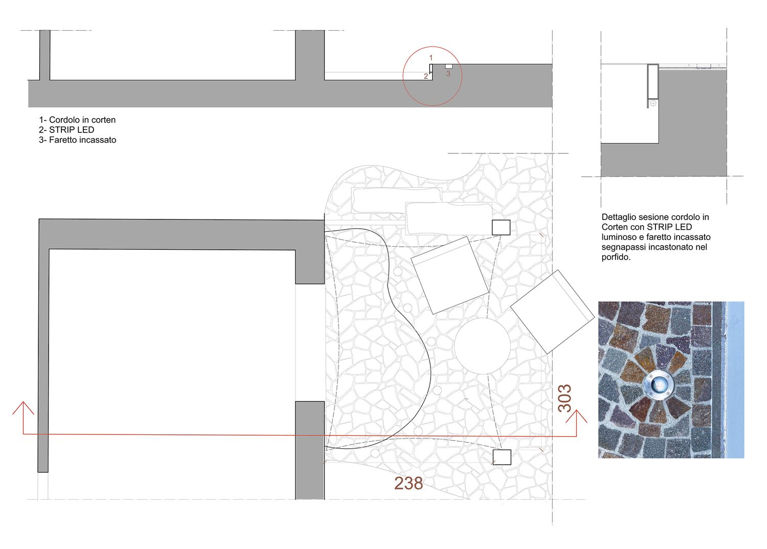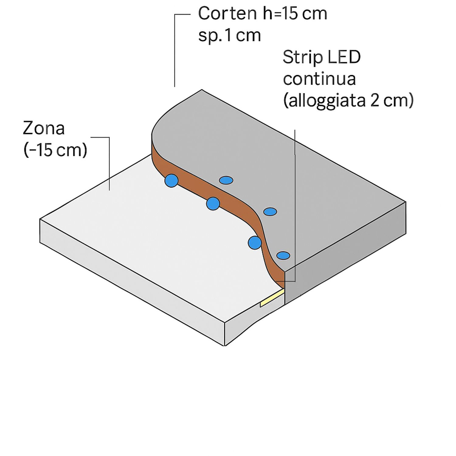 Tra i due livelli è stato inserito un profilo in acciaio Corten che, nella parte sottostante, presenta una canalina nella quale è previsto l'inserimento di una strip LED per creare un'atmosfera suggestiva nelle ore notturne.