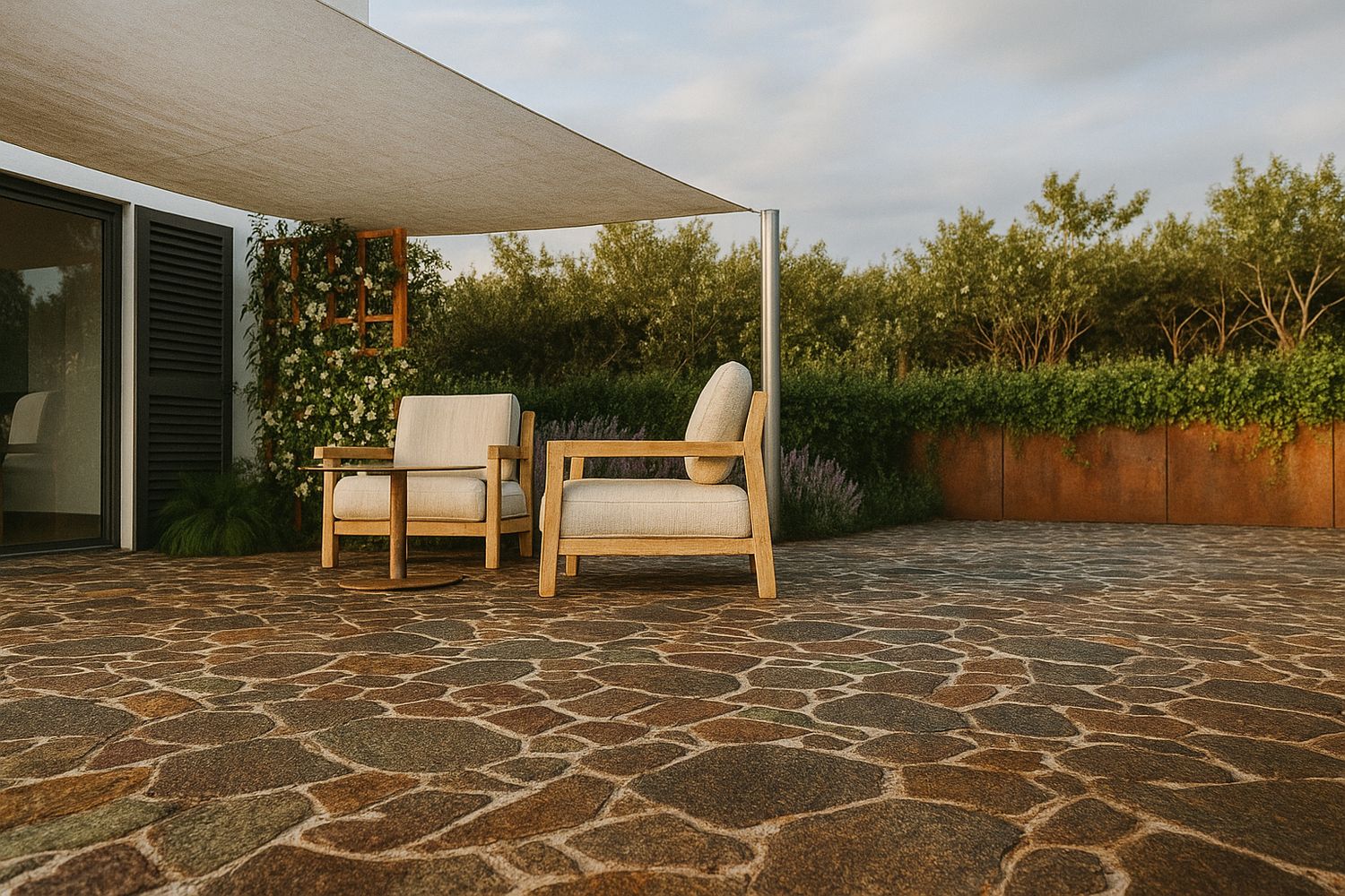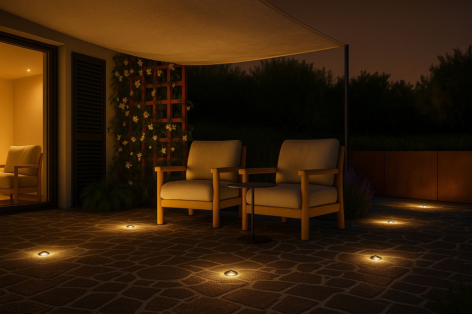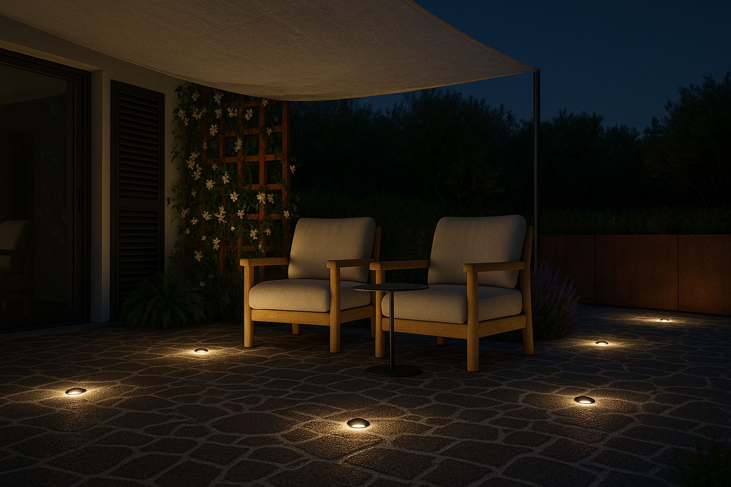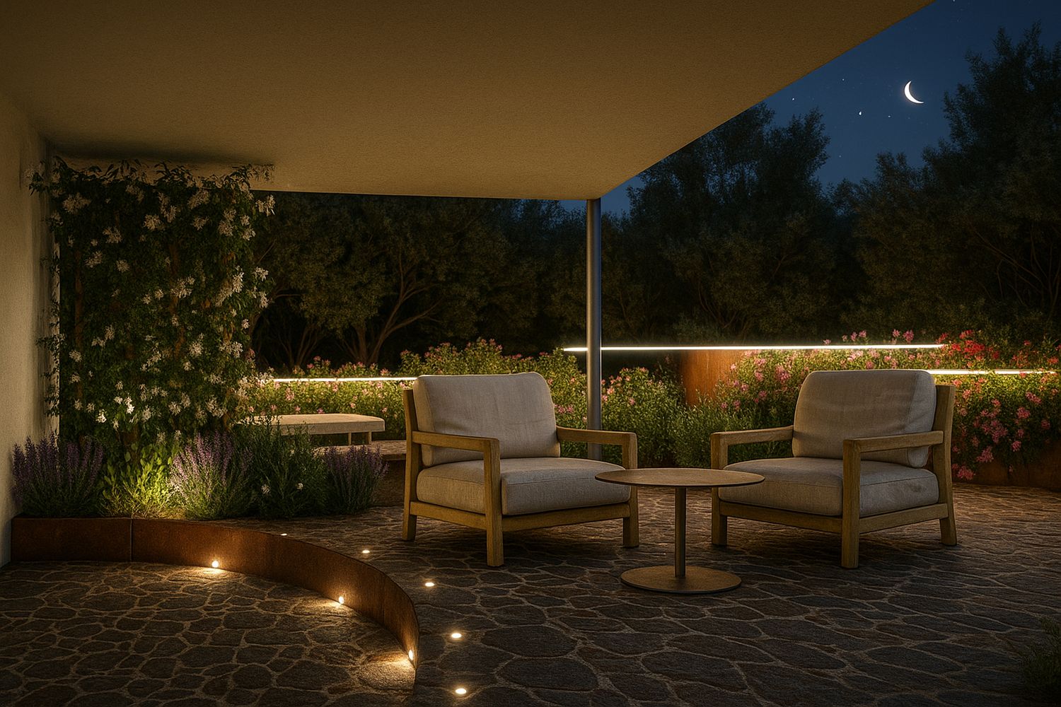 Tra i due livelli è stato inserito un profilo in acciaio Corten che, nella parte sottostante, presenta una canalina nella quale è previsto l'inserimento di una strip LED per creare un'atmosfera suggestiva nelle ore notturne.