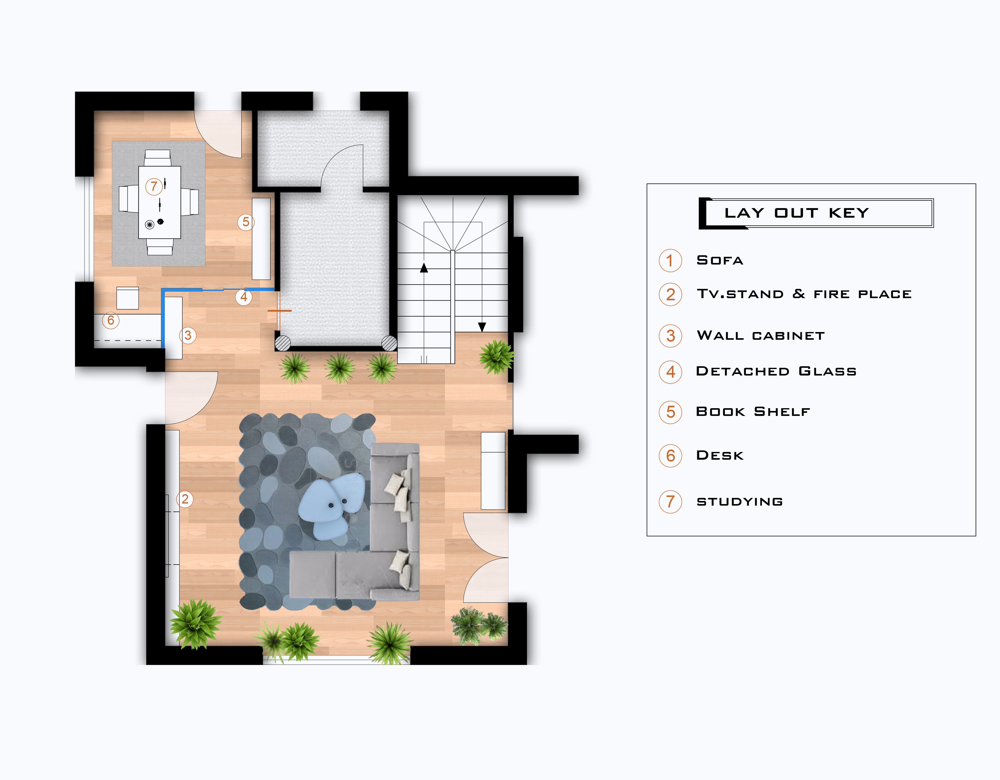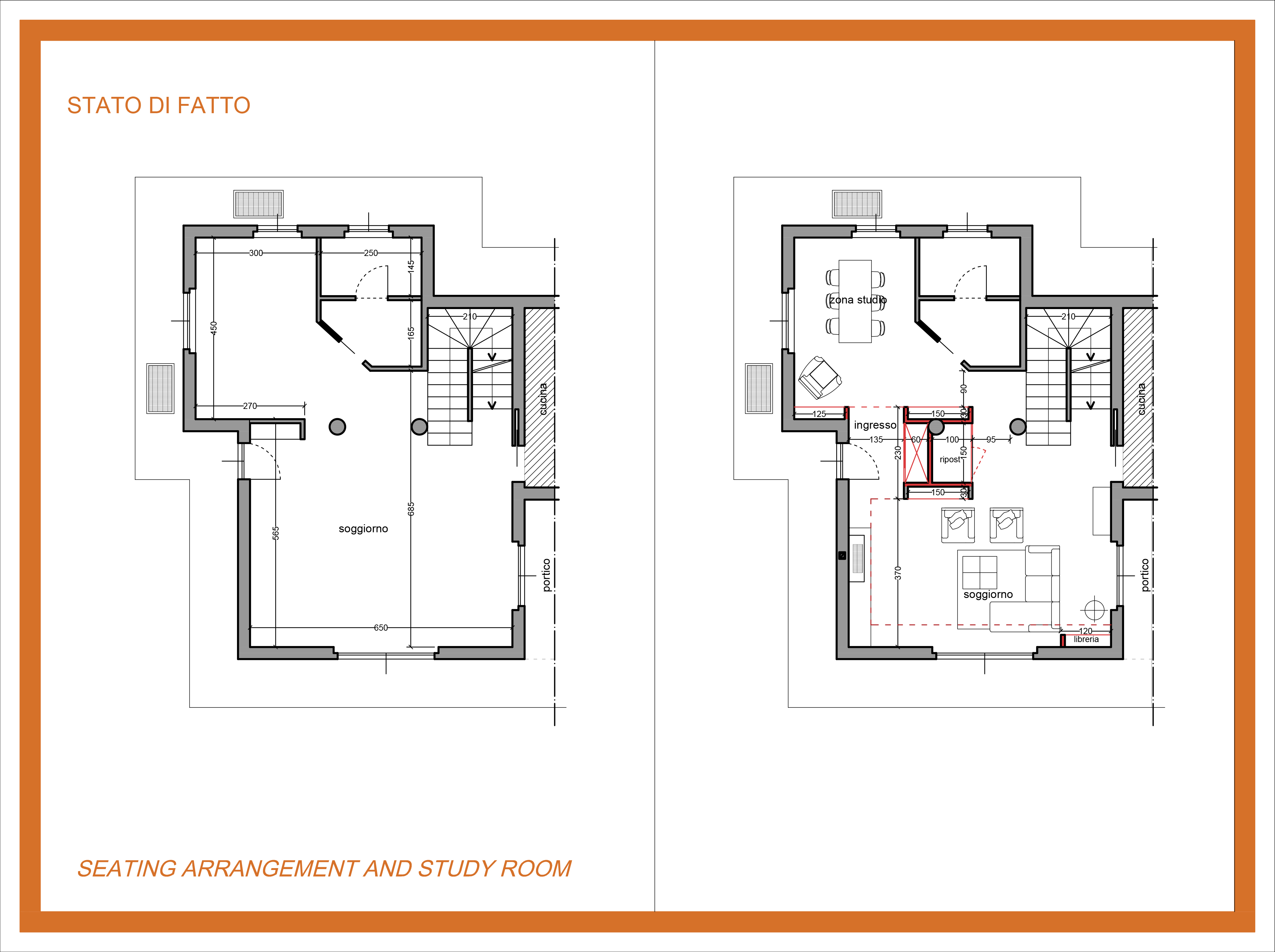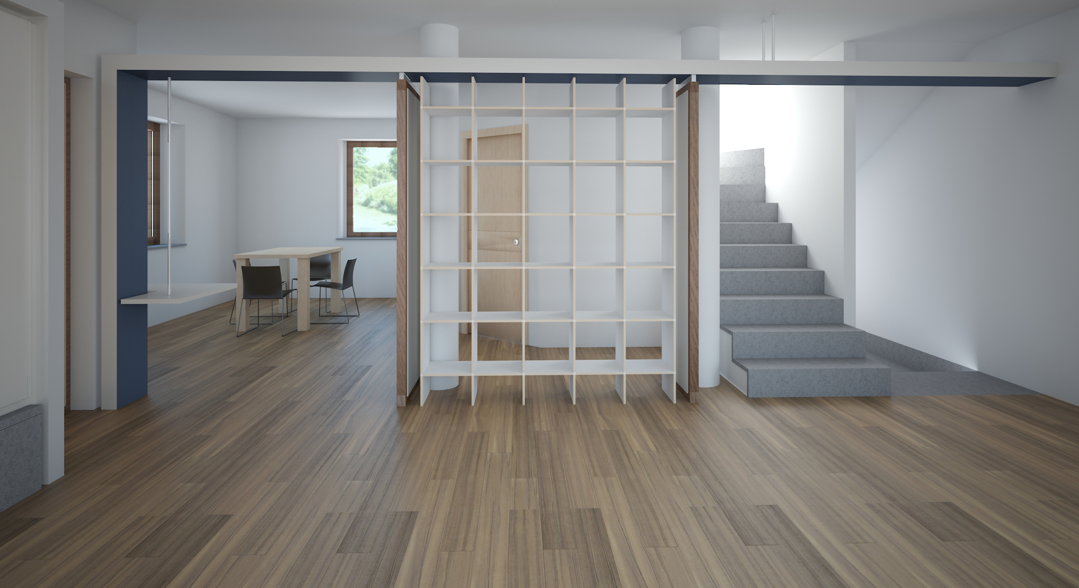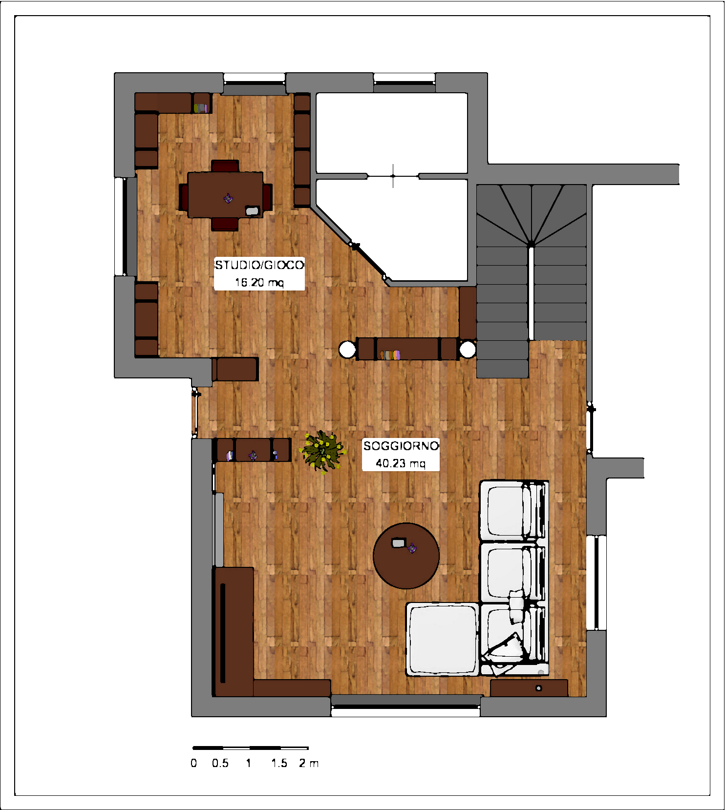 Vorremmo riprogettare il nostro living e la zona che i nostri ragazzi ( 10 e 15 anni ) usano per studiare, creando un ambiente moderno, caldo e accogliente. Desideriamo sostituire il pavimento (abbiamo riscaldamento a pavimento) con un palchetto di legno (scuro,tipo doussie o altro legno), rifare le controssofittature con luci a incasso a led e/o tagli o lame di luci provenienti dal soffitto (velette) , vorremmo mantenere il camino dove si trova . L'attuale divisione tra il soggiorno e la sala studio è in cartongesso e potrà essere rimossa . Le colonne circolari ovviamente non potranno essere toccate in quanto strutturali . Abbiamo bisogno di volumi chiusi realizzati da mobili su misura a piena parete per sistemare libri, altri oggetti personali, giacche, scarpe per noi e per gli ospiti e materiali per la pulizia della casa in quanto questo piano non dispone di un ripostiglio. Vogliamo mantenere l'attuale divano, il mobile stile farmacia con i cassettini in legno e il tavolo in legno più le sedie appena acquistate da maison du monde. Il salotto dovrà avere uno spazio dove installare il televisore . Ci piacciono i seguenti materiali : legno, pietra (tipo parete in pietra), vetro acidato, acciaio. Non vogliamo dividere completamente i due ambienti.