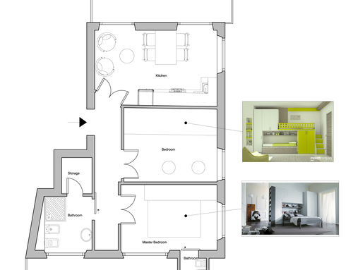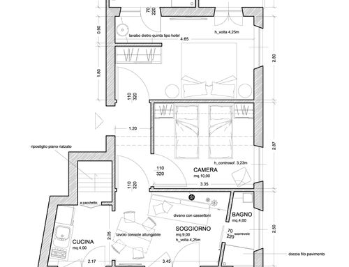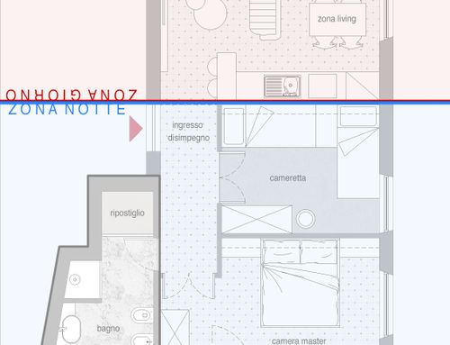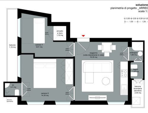 the house is on the first floor of a building in the city centre. It has 2 balconies, but the one attached to the kitchen is really near to the building next door, the distance is about a meter. Instead, the other balcony has a better and more open view. We are going to replace all the internal doors with re-made doors from the ‘700. The ceiling is vaulted and it’s lower in the central room. I’d really like to have a design that respects the history of the building, especially when it comes to fixtures, vaults, materials and decorations. On the other hand, I am searching for a modern disposition of rooms and furniture. I need two-bedroom, a master bedroom and a smaller one.