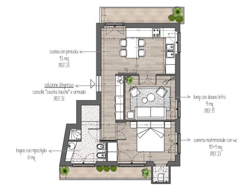 la casa si trova al primo piano nel centro storico, dispone di 2 balconi ma quello dove attualmente vi è la cucina è molto a ridosso del balcone dell'edificio di fronte, a circa 1 mt. Mentre l'altro gode di una vista aperta. Molto probabilmente le porte interne saranno sostituite con porte di recupero del '700 con sovrapporta. I soffitti sono a volta con un ribassamento nella camera centrale. Gradirei rispettare la storicità dell'edificio su infissi, volte e decorazioni , ma vorrei un taglio moderno degli ambienti e degli arredi. Dovrà mantenere le caratteristiche di un trilocale con cucina, camera matrimoniale e cameretta .