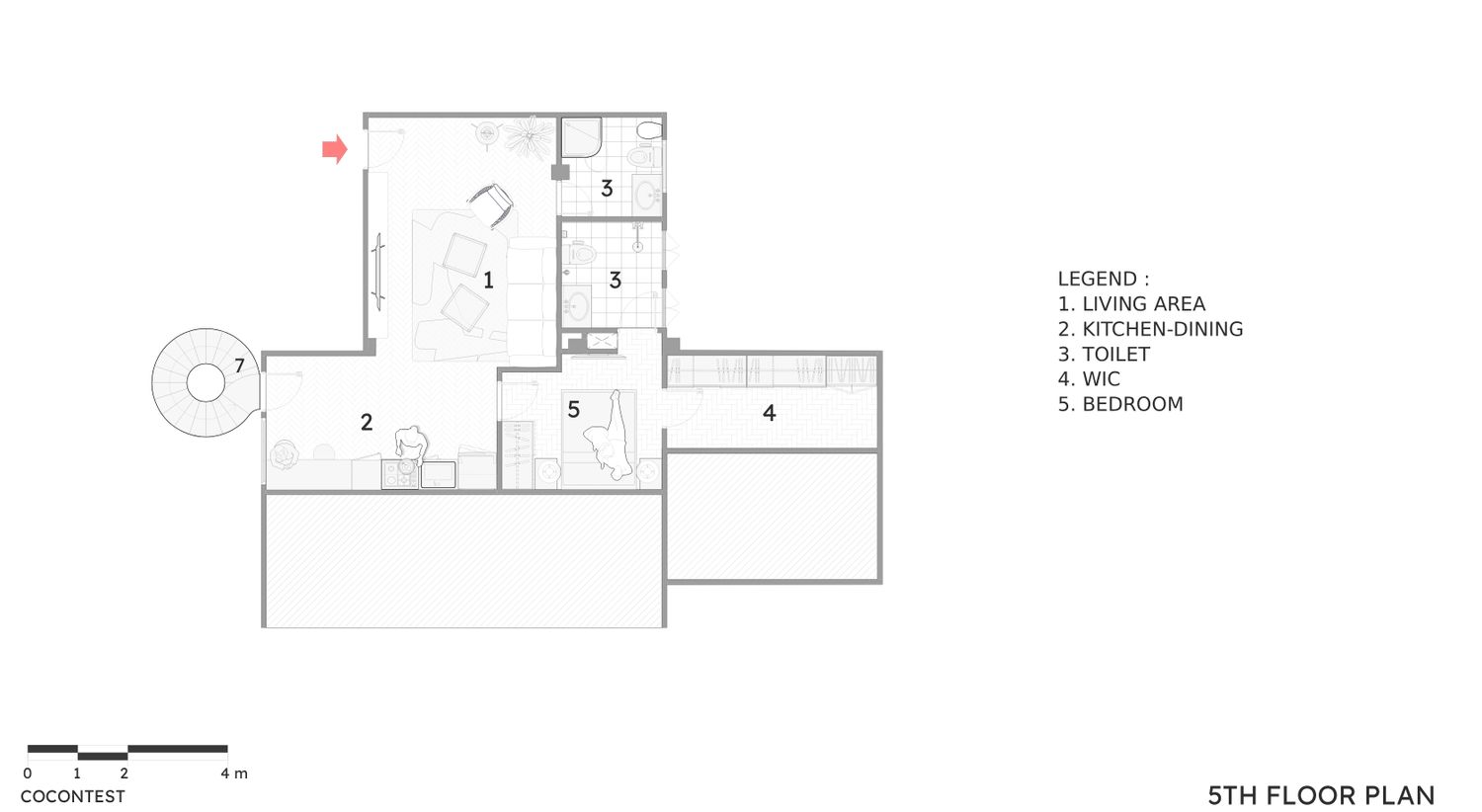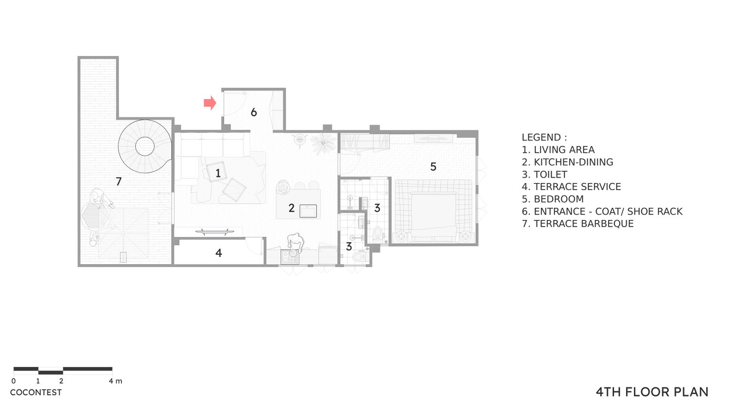 The spiral staircase placed outdoor so that the living area in first floor (4th floor) can be optimized.