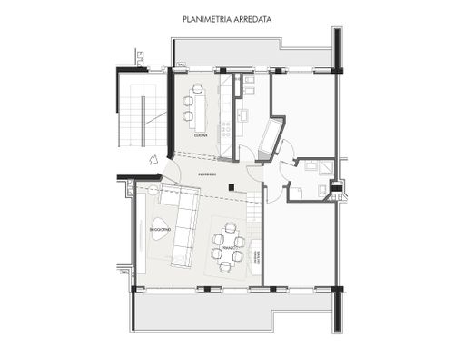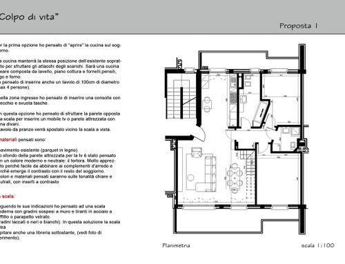 Abbiamo un appartamento all’ultimo piano di un palazzo di 6 piani. L’appartamento si sviluppa su 2 piani, vorremmo modificare e riarredare la zona giorno del primo piano, abbiamo le idee un pò confuse, vorremmo un progetto che unisca la zona soggiorno e la cucina, vedere una proposta che elimini il camino e ridisegni la scala che porta al piano superiore. I pavimenti del primo piano li abbiamo rifatti da poco ed è tutto parquet e verranno mantenuti. Vorremmo un arredamento più moderno di quello che abbiamo ma non estremo.