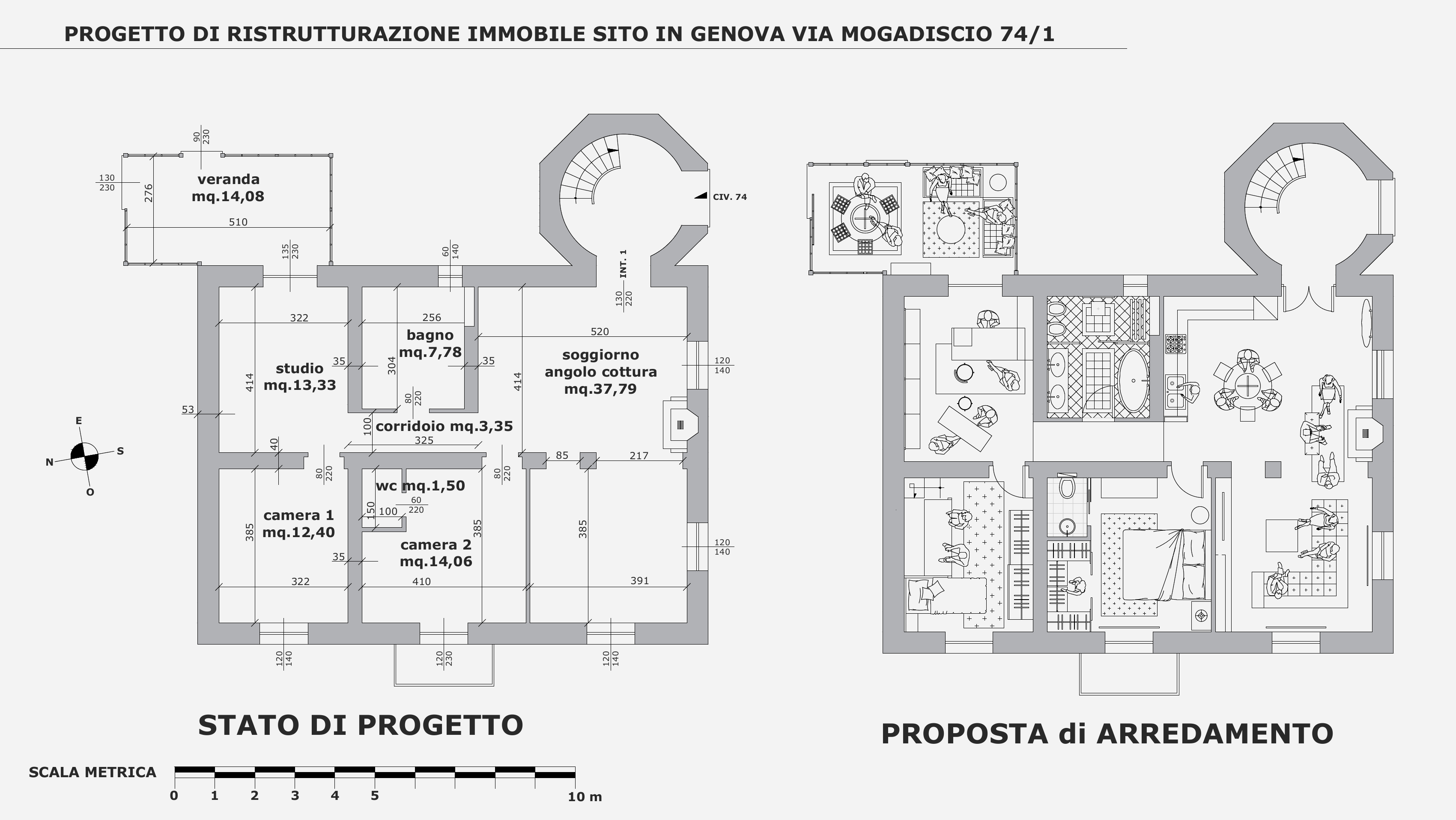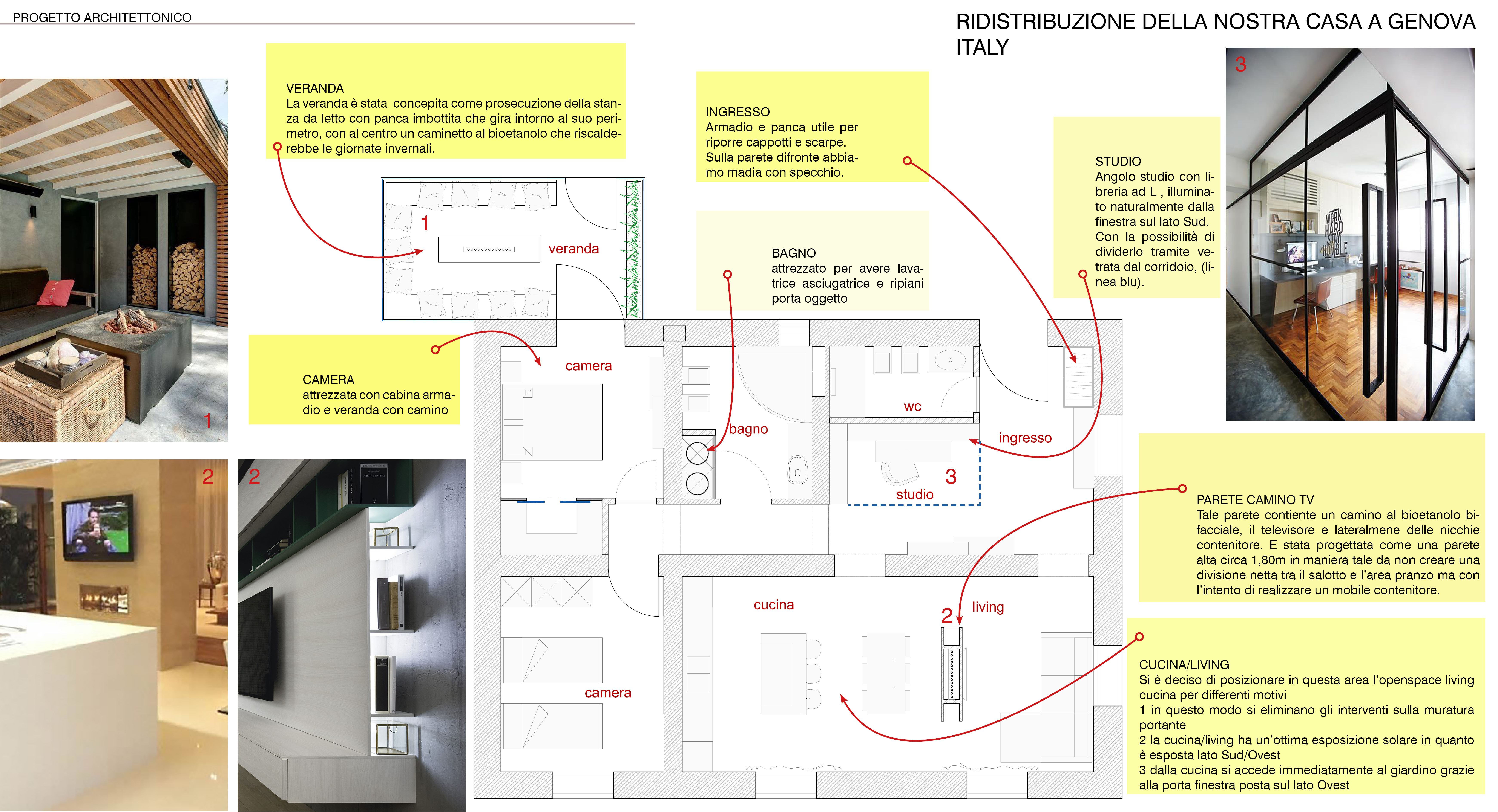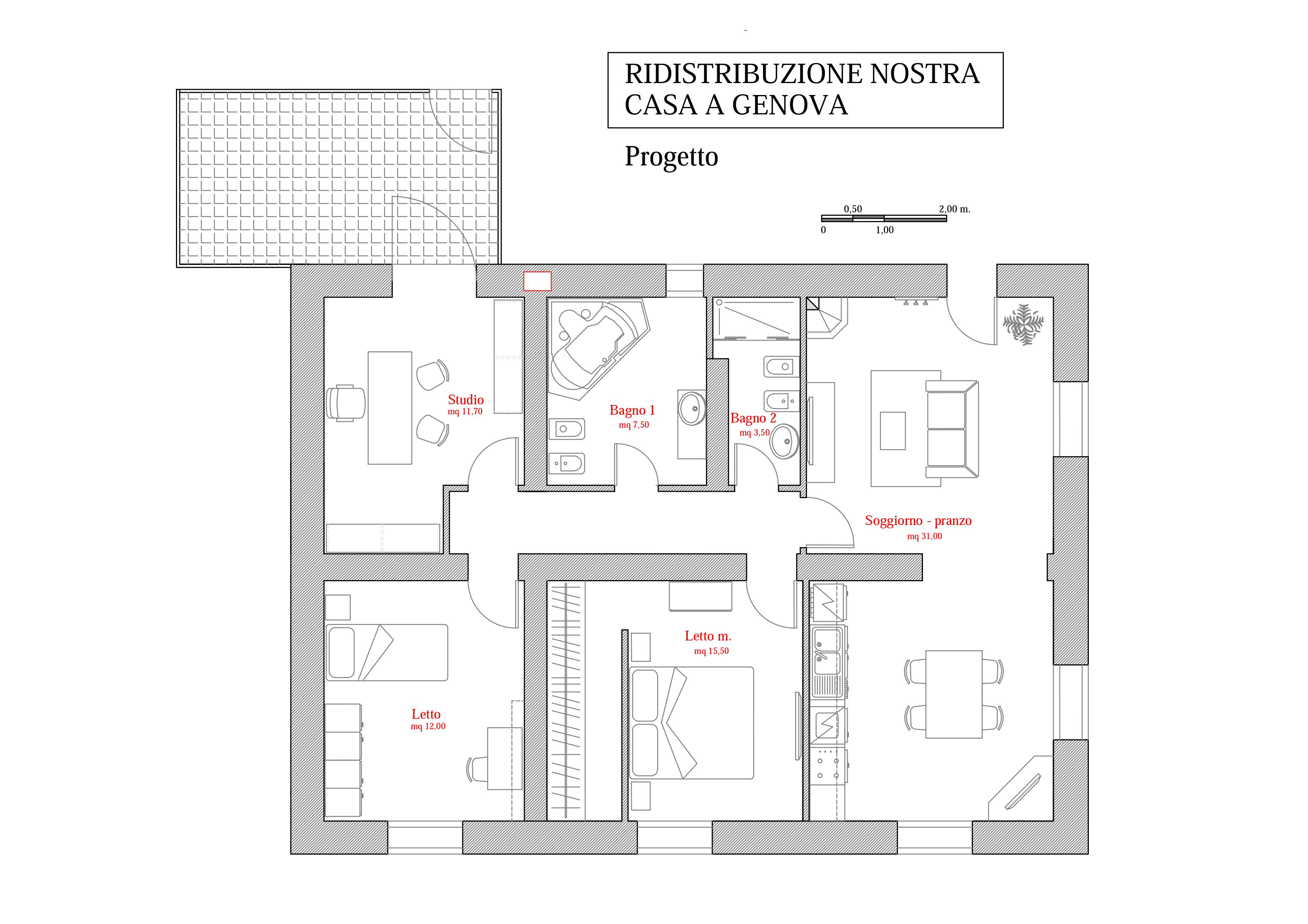 Ipotizzando questa nuova disposizione, dovremmo trovare il modo migliore di sfruttare la stanza dell’attuale cucina (potrebbe forse diventare lo studio?) e soprattutto la veranda, dalla quale cui si accede al terrazzo (attrezzato con barbecue) e al giardino.