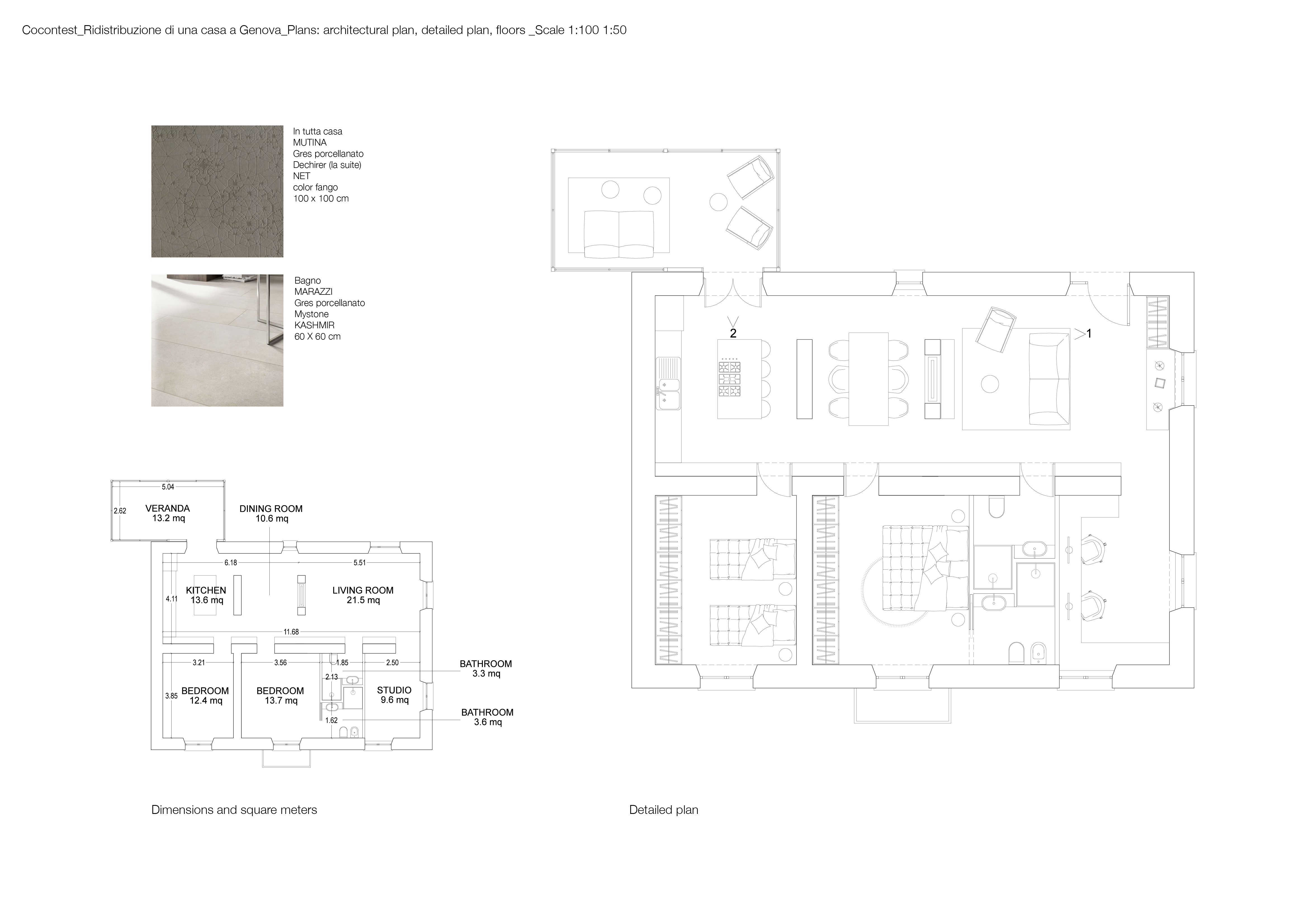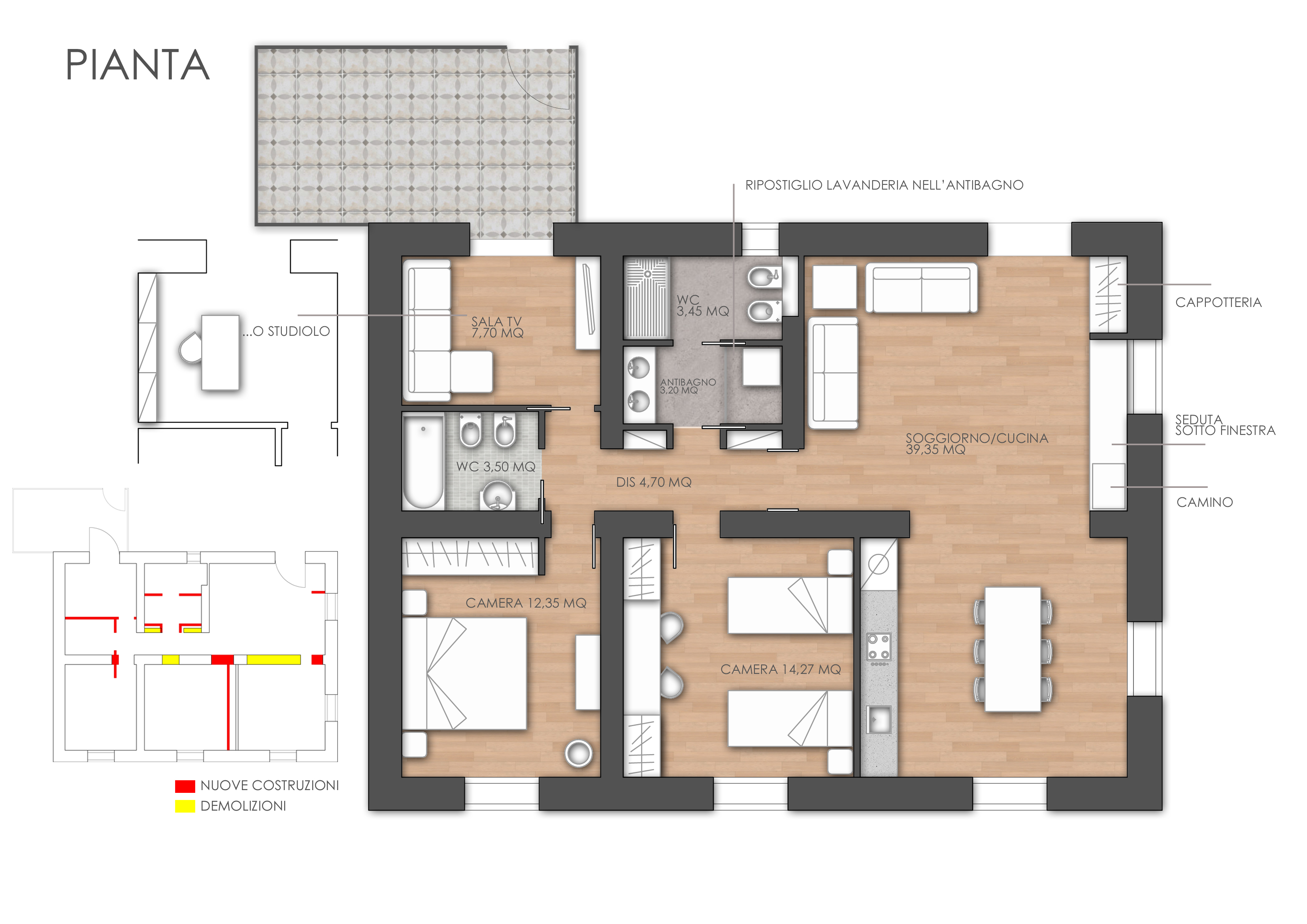 In base alle nostre esigenze e alle dimensioni dell’appartamento, nella nostra casa ci dovrebbero essere cucina, salotto, almeno due camere da letto, possibilmente due bagni, uno studio e una veranda funzionale allo spazio esterno.