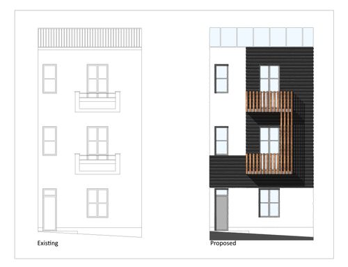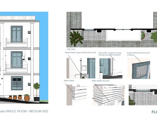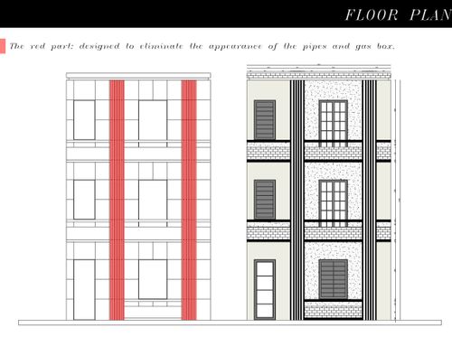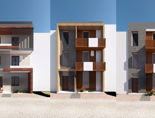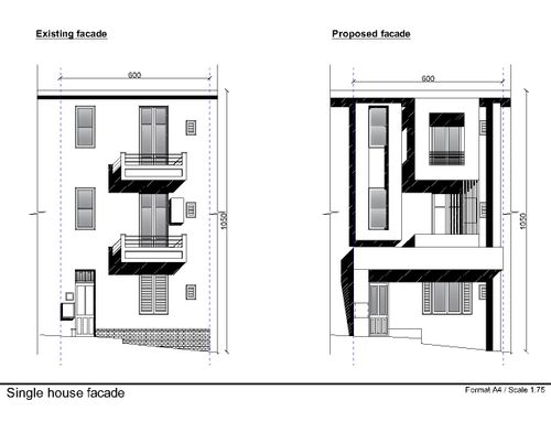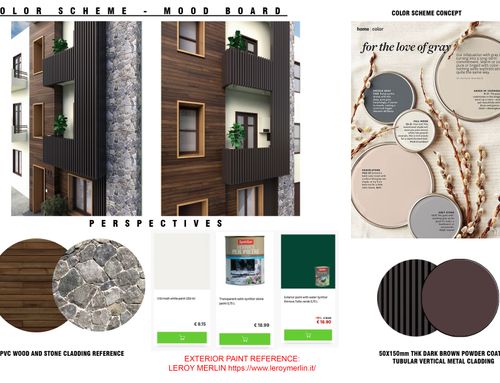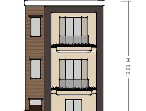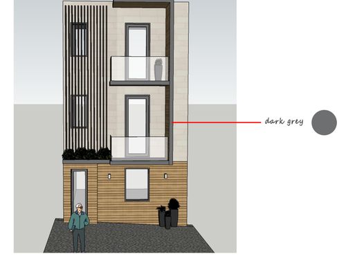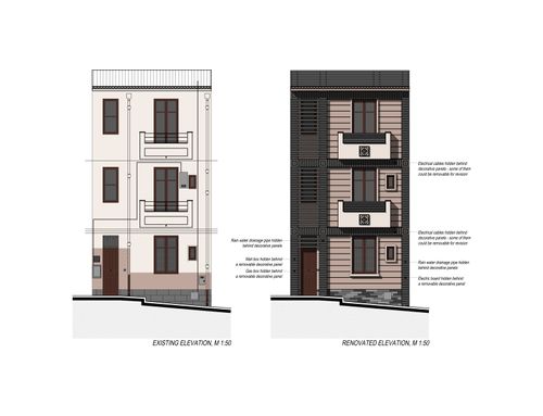 We would like to renovate the front of the house located in a town in south Italy in a narrow road of old city center. The base of front house is 6 mt, height 10 mt.. There are retriction about wall colors: beige, yellow, ochre. The window green, brown, grey. We can insert, stone marble, tiles as well as windows/balcons frame or moulding . We wish cover the gas box near front door and the outdoor boiler at first floor. We like modern design but how is it possible to balance and fit with location ? Your suggestions about colors and other details will be welcome. Being this a facade design I don't need a floorplan but a prospect. Thanks.