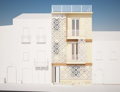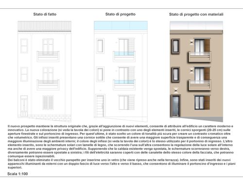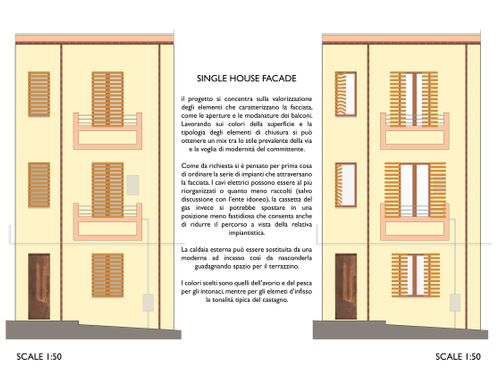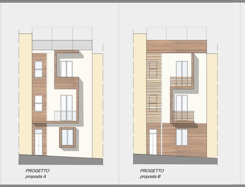 Desideriamo rifare la facciata di un casa di abitazione nel centro storico di Termini Imerese (PA) da adibire a casa vacanze in una strada molte stretta del centro storico: la facciata ha una base di 6 metri x 10 di altezza ed è su tre elevazioni. I colori vincolanti secondo normativa comunale sono il beige, avorio, giallo nelle varie sfumature, ocra, pesca, si possono inserire cornici, modanature, parti in pietra o marmo. per le aperture marrone , legno , verde, grigio- azzurro. Attualmente la facciata è veramente brutta , vorremmo coprire la cassetta del gas vicino il portone di ingresso e la caldaia al I piano. Mi piace il design moderno ma come conciliarlo con il contesto in cui si trova l'edificio? Ci piacerebbe conoscere le vostre proposte riguardo i colori rifiniture e quant'altro. Essendo il progetto di una facciata, ovviamente non vorrei ottenere la pianta ma il prospetto. Grazie