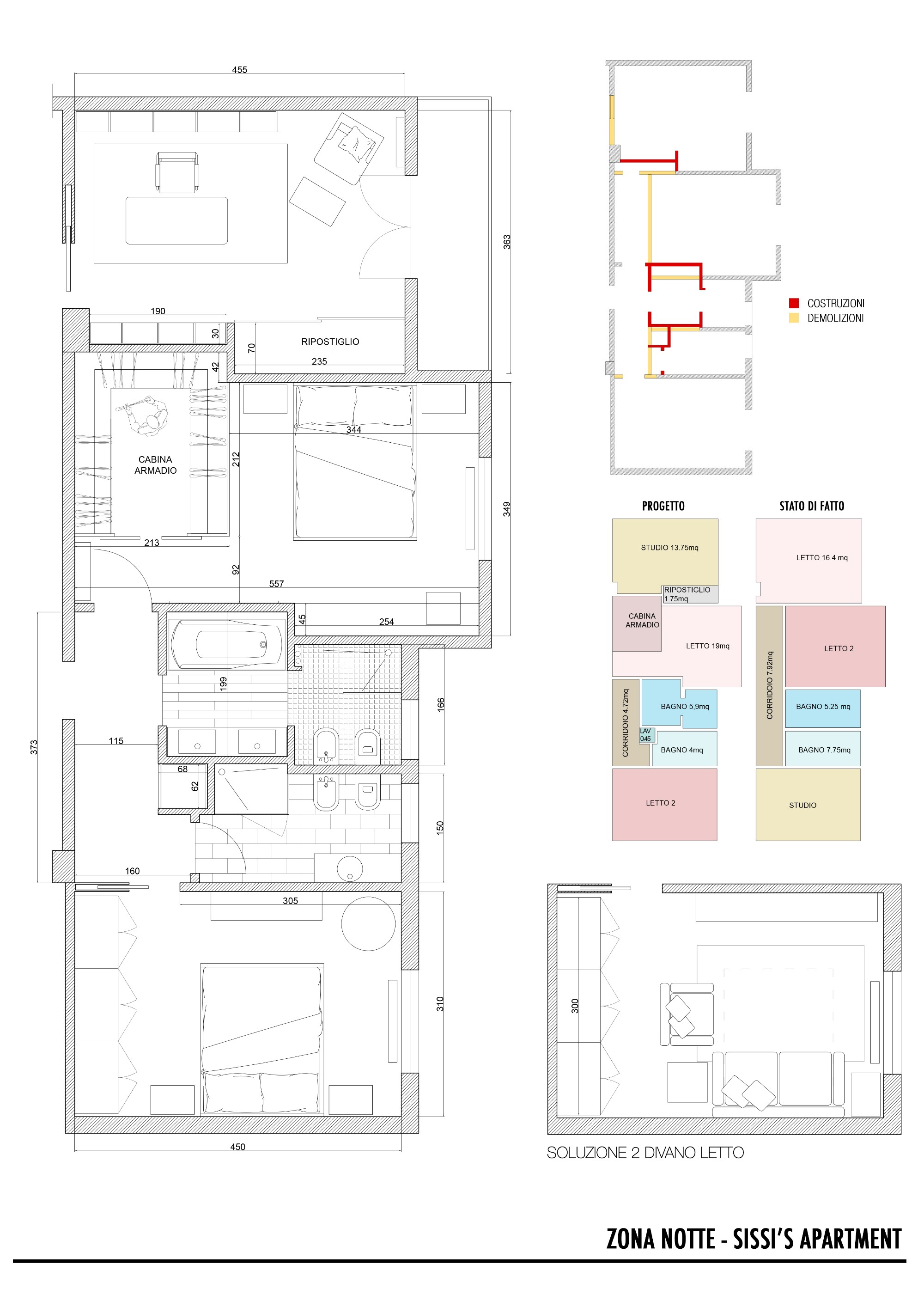 Currently we have three rooms, a main bedroom, a studio and a general use room (potentially a second bedroom). In the night area are also located two bathrooms.