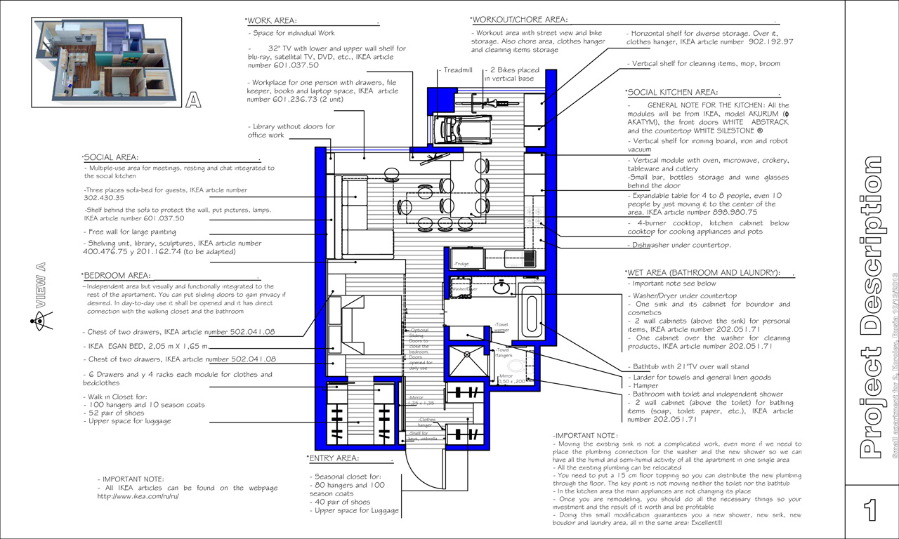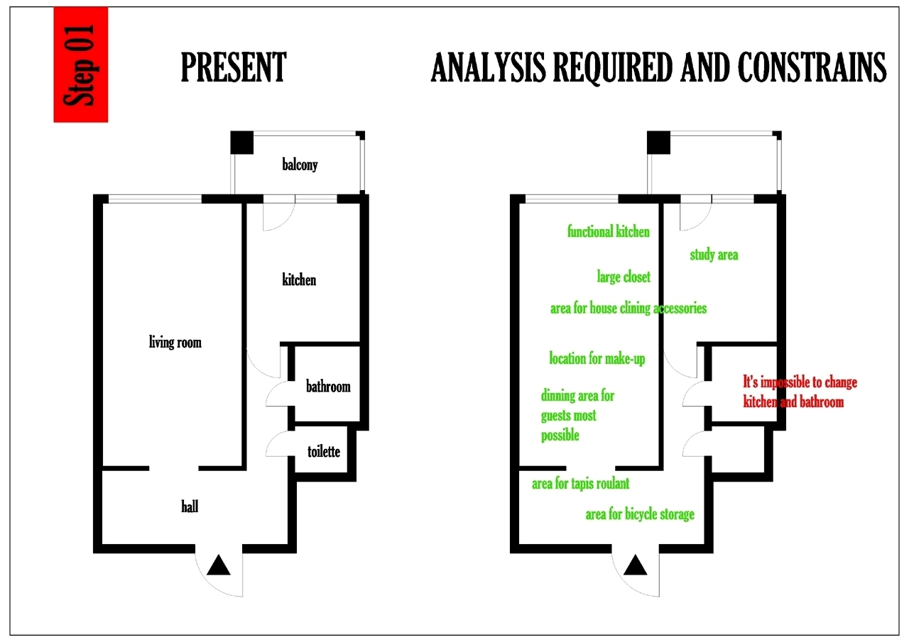 We've got a small apartment (43,8 sq m + 4,6 sq m of balcony) for two. The main objective for us is to have an apartment that will suit our lifestyle which includes work&study (thus we need a work place), cooking (this requires a kitchen with a number of appliances, cook- and dinnerware storage as well as big fridge and of course a table for at least 4 persons), cycling (so we have 2 bikes to store) and having lots of clothes and shoes:). Personal treadmill at home is also a big-big dream so it would be cool if some place for it would be found. As I mentioned earlier the apartment had a balcony and I'd like to mention that here in Russia we have balconies with ceiling and windows. Yes, it sounds weird but I'm not sure how to put it correctly in English. These pictures will give you an idea of what I'm talking about: http://www.inmyroom.ru/posts/esli-u-vas-est-zasteklennyy-balkon-eto-ogromnyy-plyus So these 4,6 sq m of balcony can be used as well as the main apartment. I attach the apartment plan we have now. In case if you need any additional dimensions please let us know. Please note that this is a current plan but we also consider an option of offsetting some walls (i.e. to make Room 2 smaller and Room 1 bigger so that Room 2 could be a small bedroom and Room 1 was not a hallway but a living room). Here goes the list of what we want in our apartment. I grouped it in a way that we generally do in Russia but of course you may change it. Room and the hallway: Bed (size 205x165 cm) http://www.bootic.com/ikea/furniture/beds-and-accessories/beds/ikea-engan-bed Bedside table or chest to store small stuff (phones, alarm clock, face cremes etc.) Kind of work place for one person (to place a laptop, some papers and textbooks) Flatscreen TV (32") Place for make up smth like dressing table or similar (enough day light is a must + place to store a considerate amount of cosmetics incl. nail polish) Clothes storage (current amount of seasonal clothes in usage: 40 hangers per person (this makes 80 in total) plus the similar amount is in store for the other season) Outerwear storage (10 hangers total) Shoes storage (20 pairs for everyday wear + 30 for other seasons and special occasions) 2 bicycles Wi-fi router IRobot vacuum cleaner Ironing board A place for a drying rack like this http://www.ikea.com/gb/en/catalog/products/30227912/ (normally we fold it out on the balcony but we need a place to store when it is not used) Air conditioner Air humidifier Full-length mirror Apple TV Kitchen: Hob with 4 cooking zones Rice cooker Kitchen aid Oven Microwave oven Dishwasher Electric kettle Fridge (full-size of 2m height) Cookware (8-10 pans and pots) and bakeware Dinnerware and glassware Cutlery Food storage (pasta, flavour, rice and other grocery) Storage for kitchen household supplies (i.e. cleaners, trash bags, paper towels) Small bar for 10-12 bottles max (thereof 2-3 bottles of wine) Table for 4 persons min (extendable may be an option as sometimes we may host up to 10 guests) Bathroom and toilet: Bathtub Toilet with a shower Washing machine Bath towels storage (as well as bedcloth and tablecloth storage) Mop and bucket Laundry basket Towel warmer As you can see from the photos the apartment is not in best condition and the last renovation was quite a long time ago. Most furniture and decoration will be bought (except for the bed and some kitchen appliances) thus you are free to suggest your ideas. The only problem is that here in Russia we don't have any global brands except for IKEA, Hoff, Zara home and H&M home. Something can be ordered via internet but for furniture pieces it would not be an option due to significant delivery costs. Still when it comes to decoration these web-sites can be used: http://www.crateandbarrel.com http://www.jcpenney.com/dotcom/for-the-home/dept.jump?id=dept20000011 http://www.overstock.com/Home-Garden/1/store.html?TID=TN:FH:FH http://www.potterybarn.com http://www.proidee.de/concept-store?SID=SID_EuT2ipGBbppK9aTtjYrhebng7txx http://www.thehut.com/catalogue/home-garden.list http://www.interiorplace.com http://loja.inexistencia.com http://www.fancyhometrends.com http://www.design-3000.com http://www.billigerluxus.de Urbanoutfitters.com Also if you know some other shops that deliver to Russia you are free to use their products:) Thank you very much in advance and looking forward for your questions and comments.