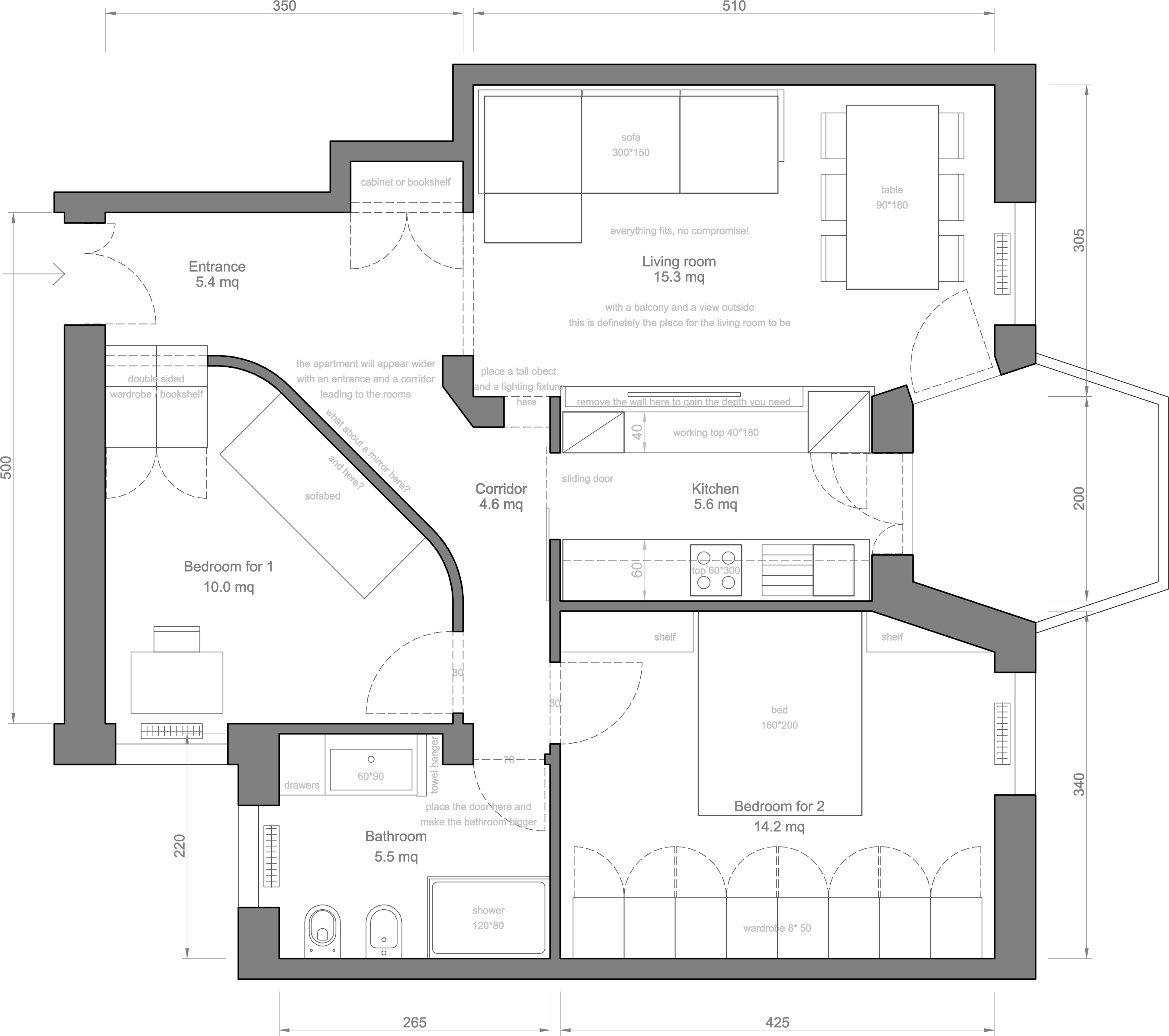 EDIT2: importante notare come ci siamo due colonne portanti al centro dell'appartamento che ovviamente non possono essere tolte; una è all'angolo tra il bagno e l'attuale salone; la seconda è all'interno della colonna a forma irregolare tra la cucina e la cameretta (è la parte dritta della colonna che da sul salone).