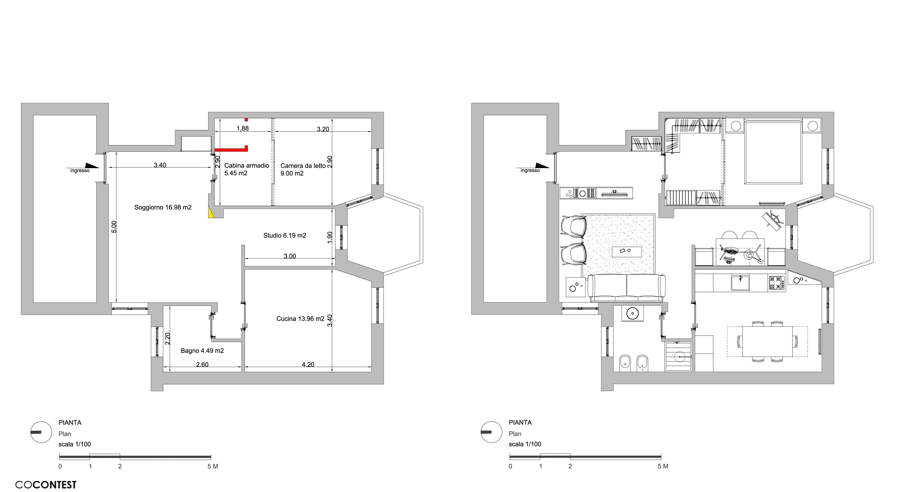 - Possiamo anche fare cambiamenti e aprire il muro che dà sulla cameretta, trasformandola in ambiente unico living.