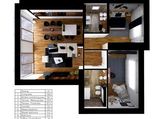 We are a young couple who bought an apartment of about 85 square meters on the top floor with a terrace of about 45 square meters. The apartment's height is 240 cm throughout the apartment (flat roof pitch - no exposed beams).