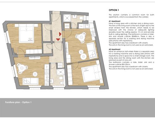 - Living room with kitchenette, with kitchen which should be linear and at least 300cm wide.